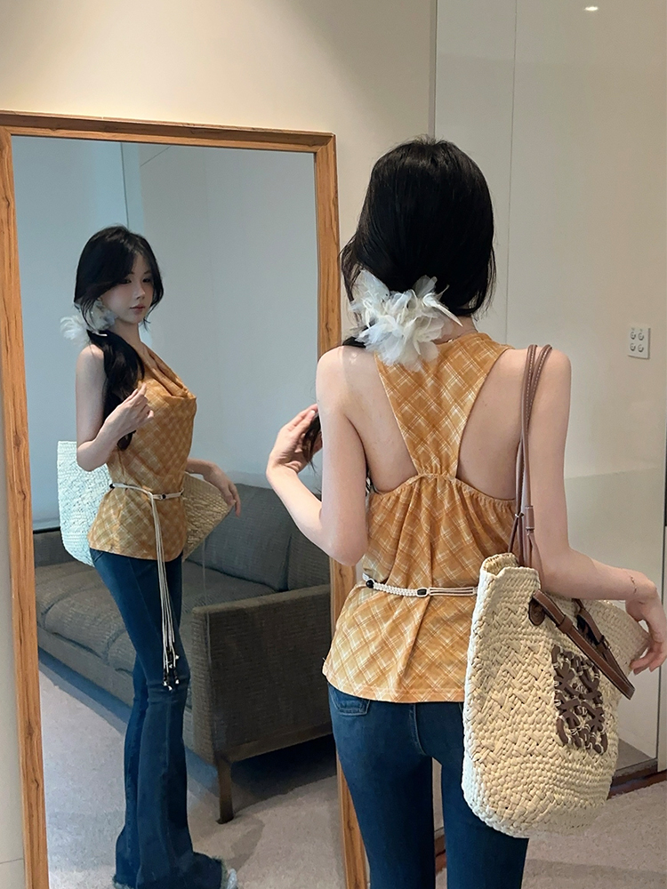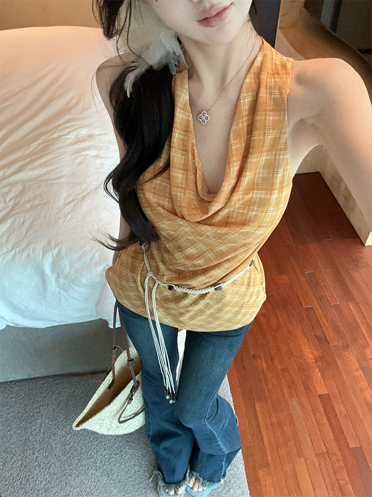 FA35669# 送绑带设计感挂脖荡领背心小衫女夏季收腰显瘦别致网纱上衣 服裝批發女裝批發服飾貨源