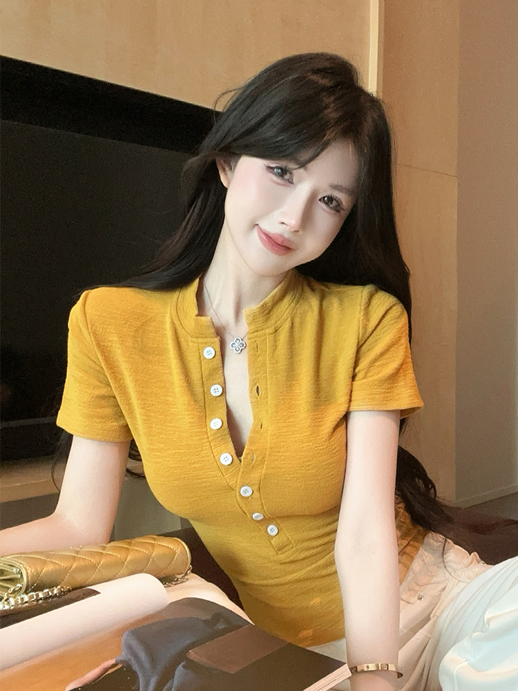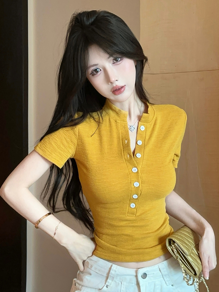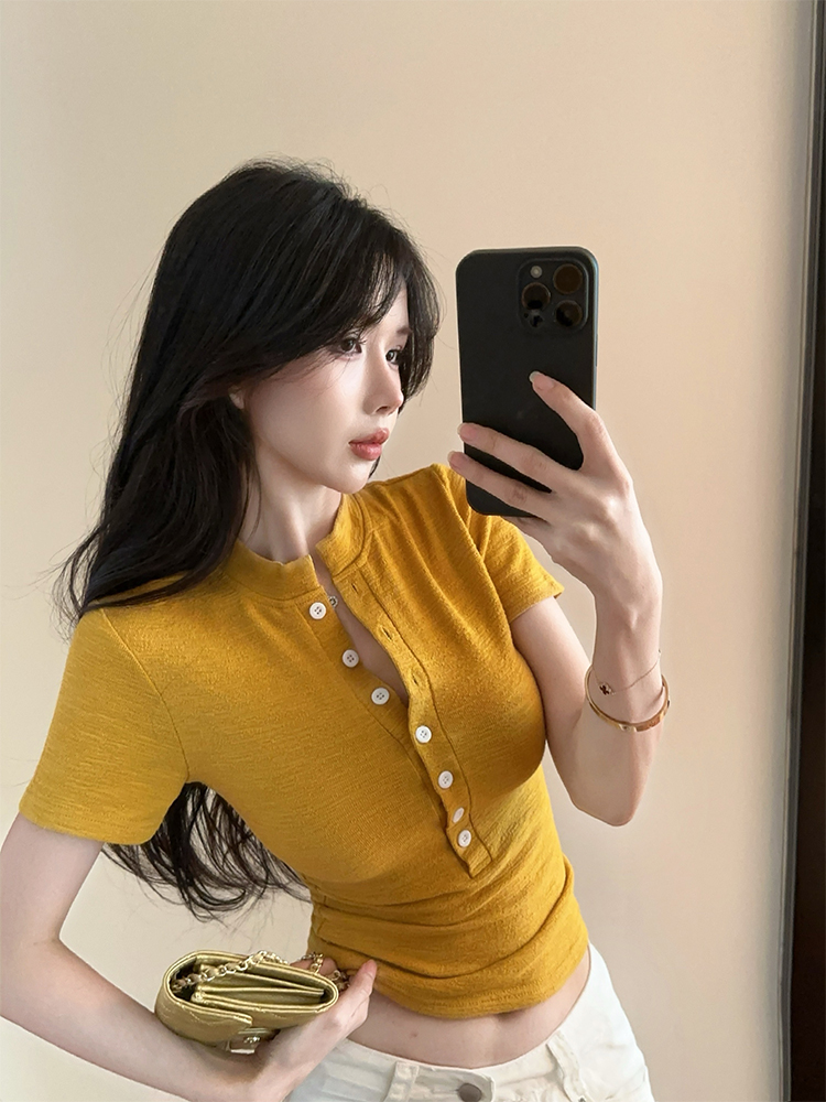 FA35673# 纯欲纽扣设计感辣妹纯欲风夏季新款短袖t恤短款修身显瘦上衣 服裝批發女裝批發服飾貨源