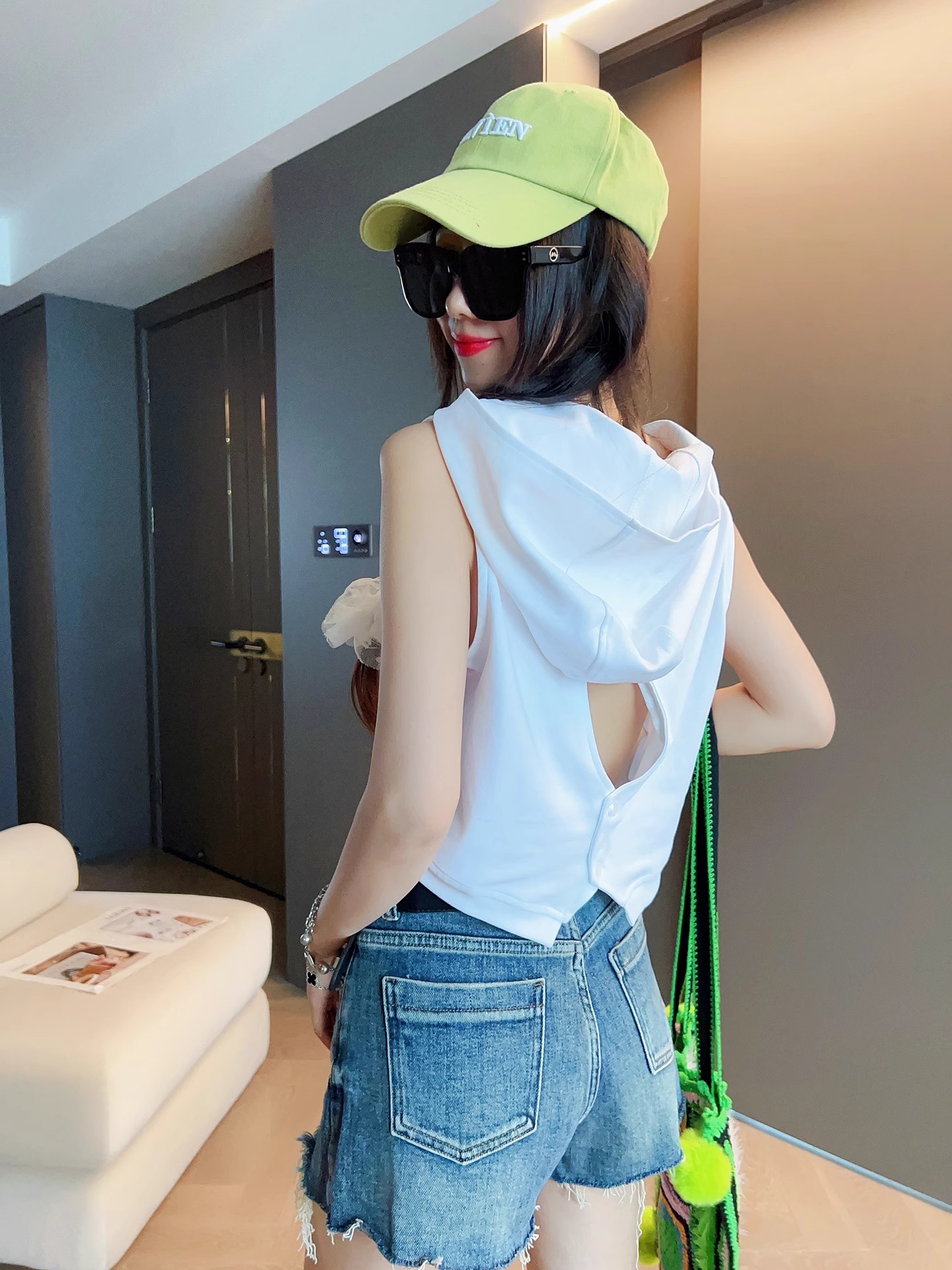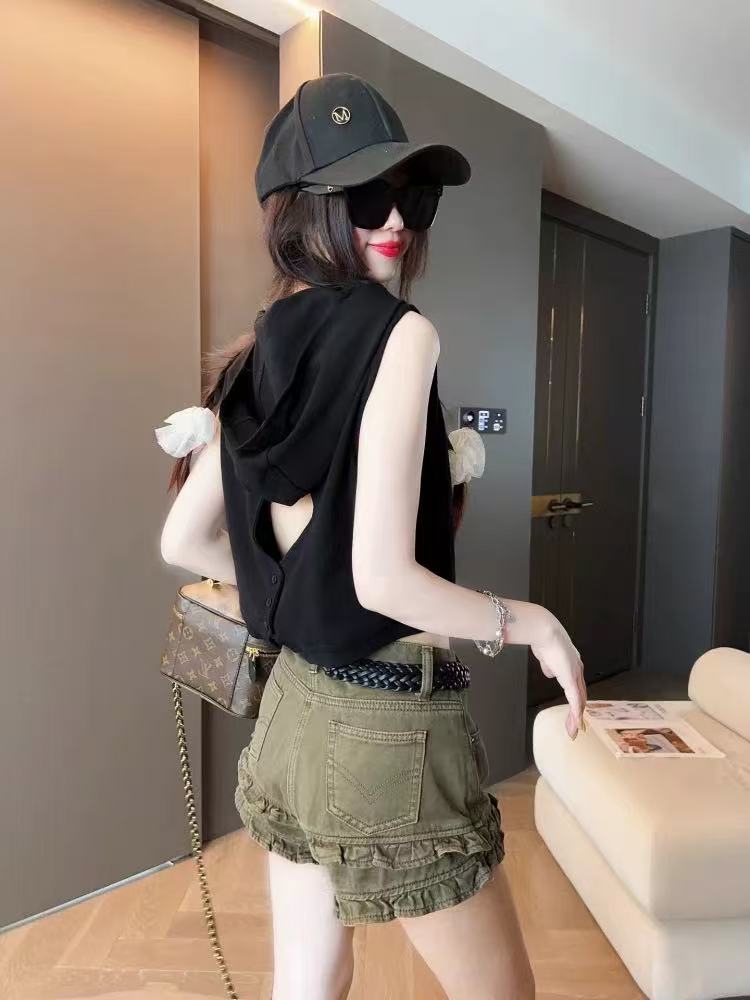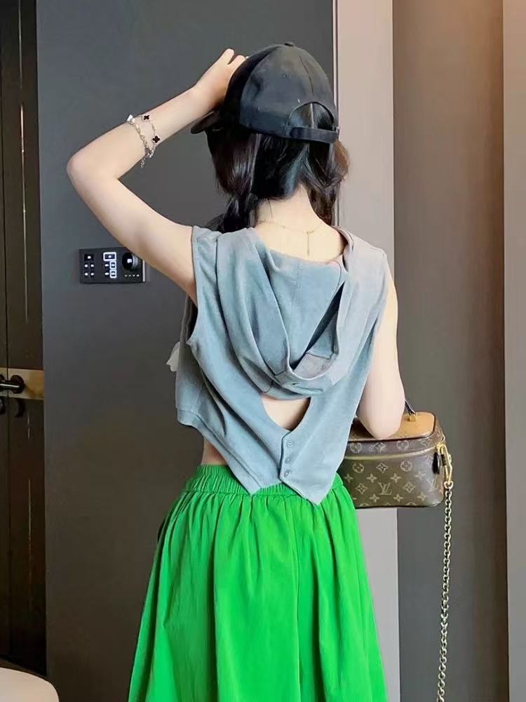 FA35682# 设计感小众时尚连帽无袖T恤女装夏季新款显瘦百搭短款上衣 服裝批發女裝批發服飾貨源