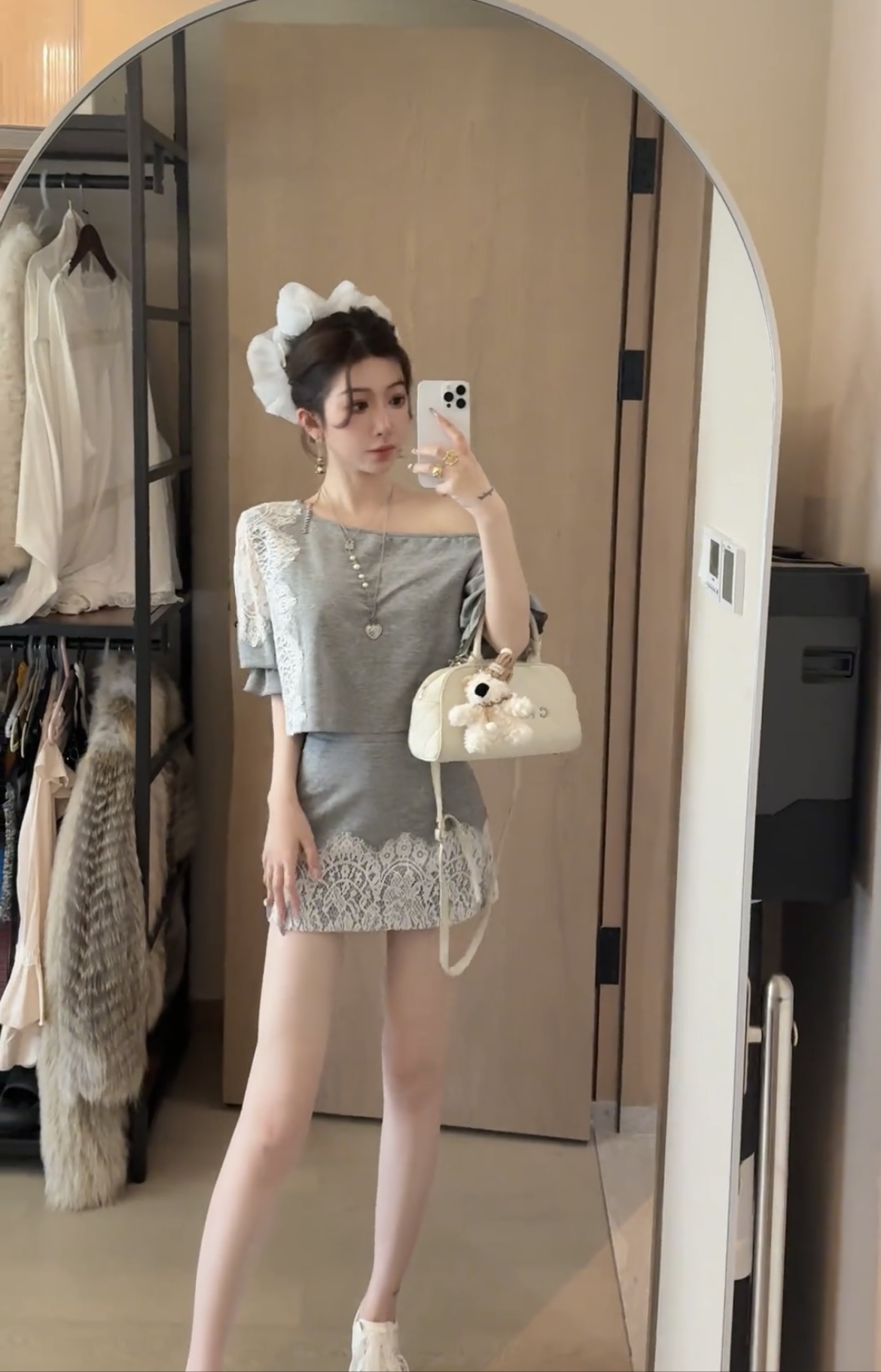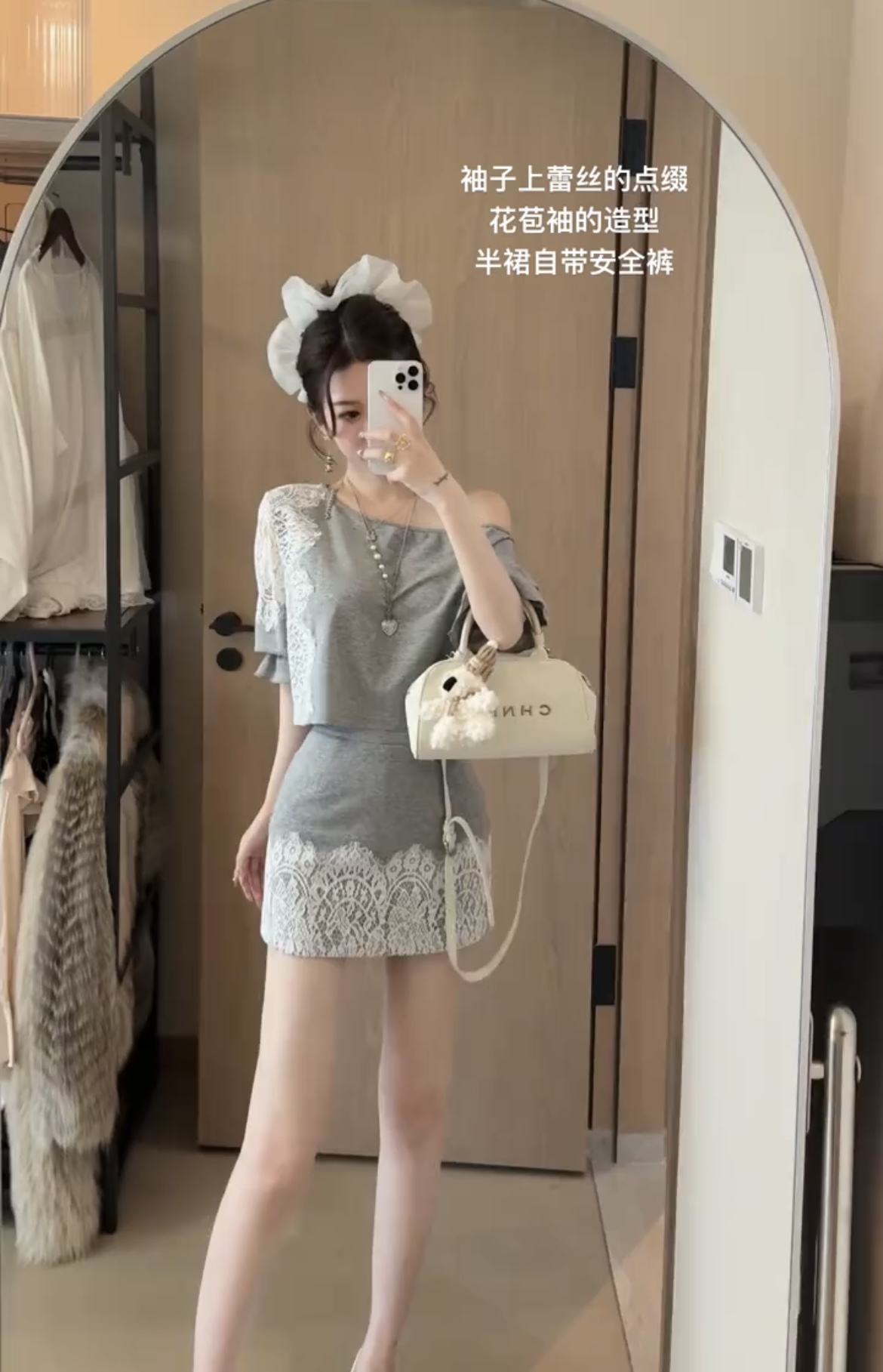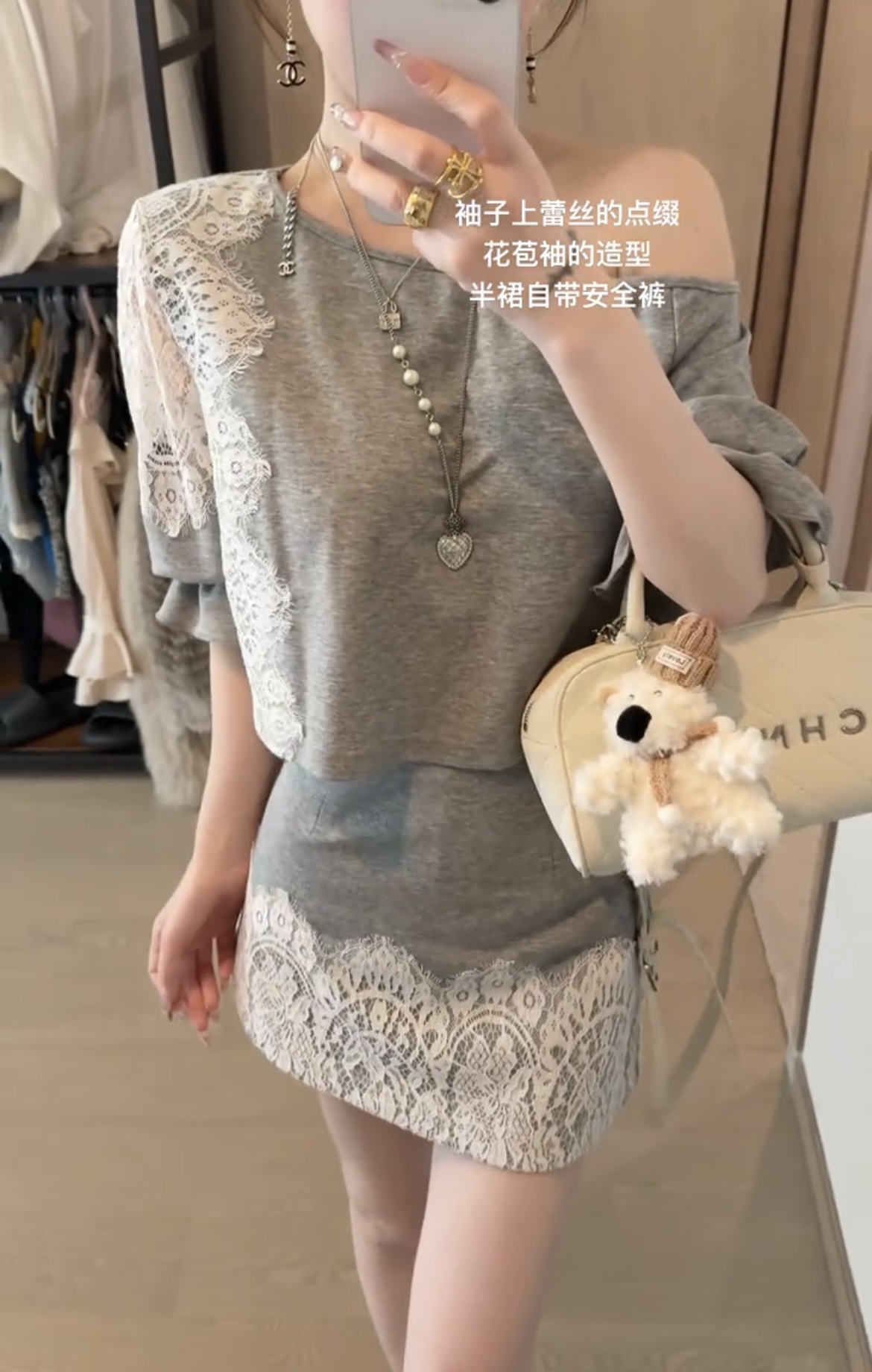 FA37751# 小雨姐姐夏款设计感露肩蕾丝拼接上衣+蕾丝半裙套装女 服裝批發女裝批發服飾貨源