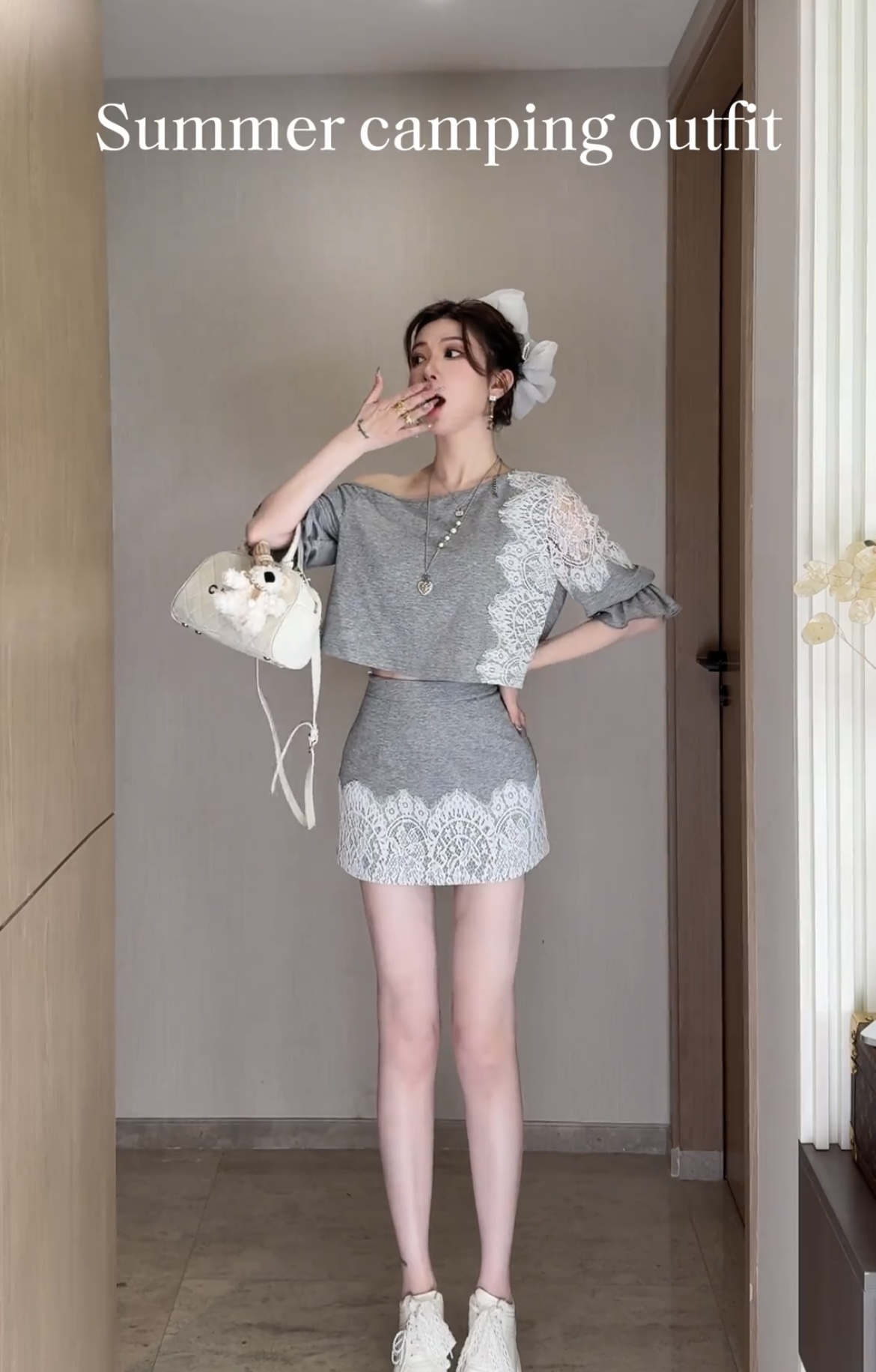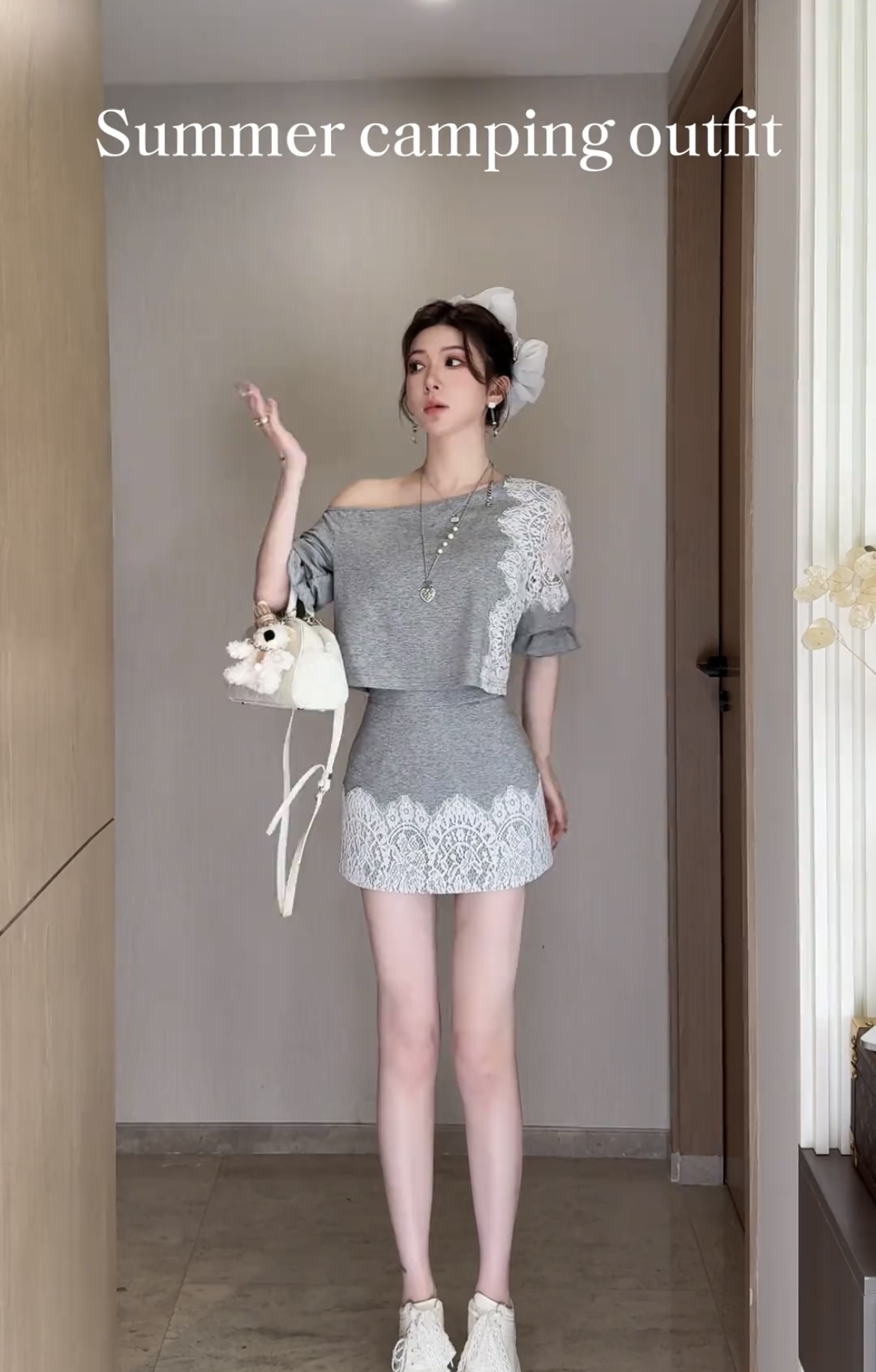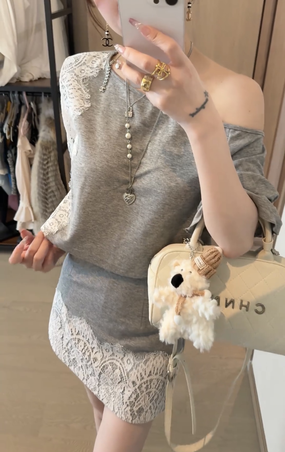 FA37751# 小雨姐姐夏款设计感露肩蕾丝拼接上衣+蕾丝半裙套装女 服裝批發女裝批發服飾貨源