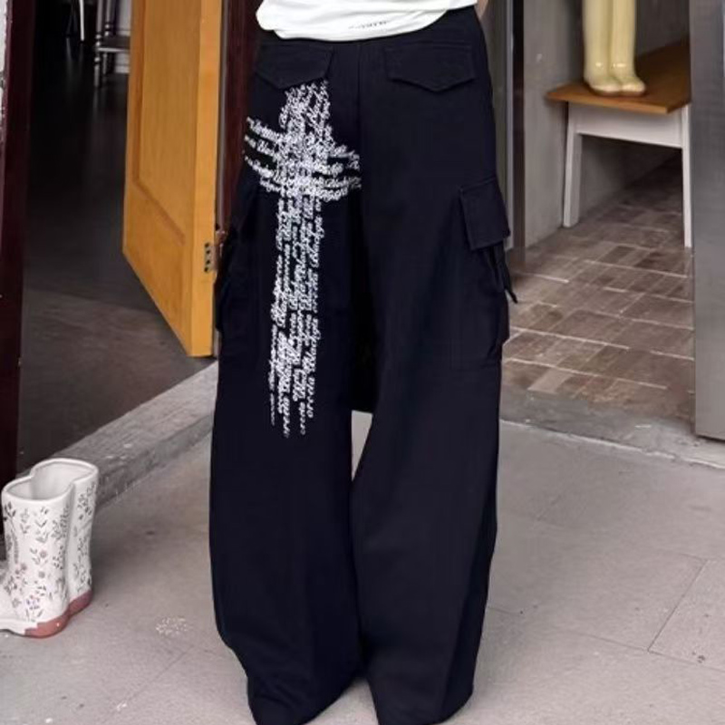 Home > 牛仔裤、长裤 > YF5835# 图片色港味个性慵懒风十字架字母印花高腰直筒坠地感休闲牛仔裤