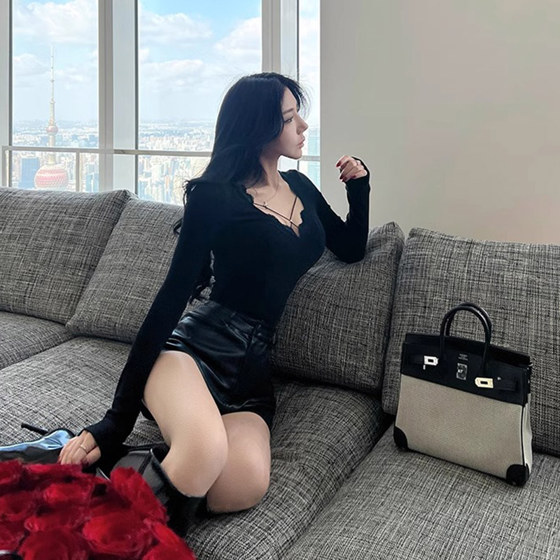 FA41575# 蕾丝拼接v领长袖T恤女春秋修身紧身内搭纯欲打底衫上衣 服裝批發女裝批發服飾貨源
