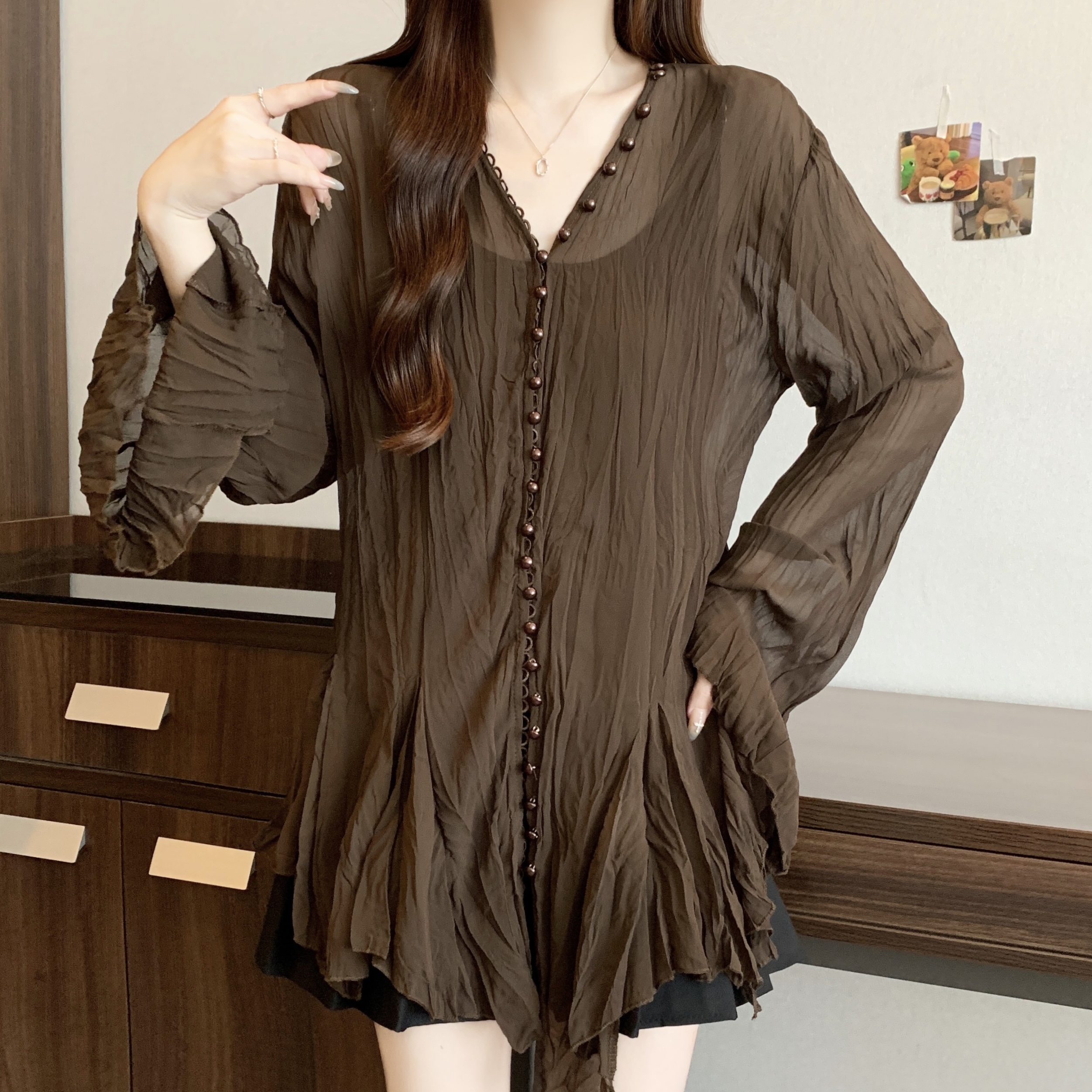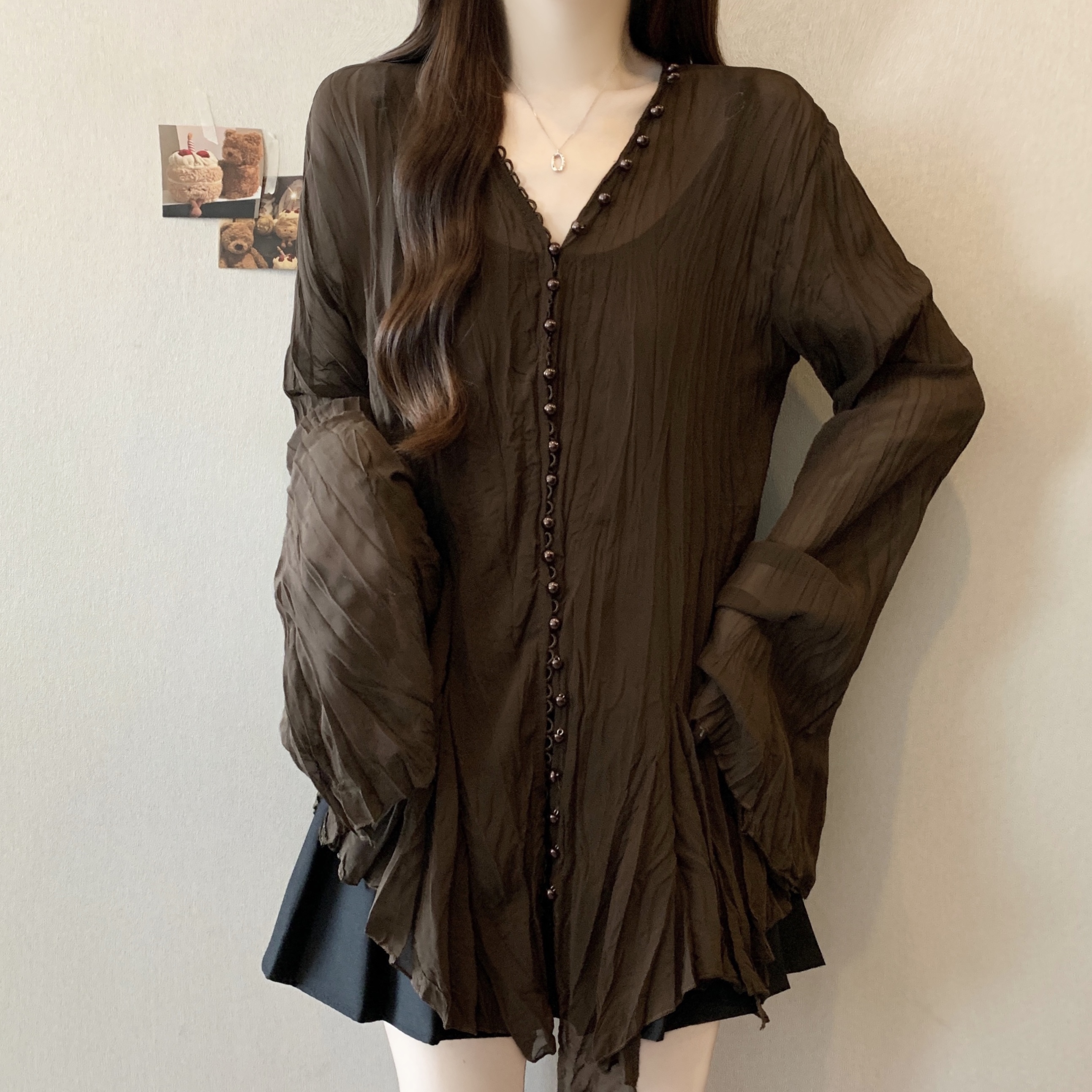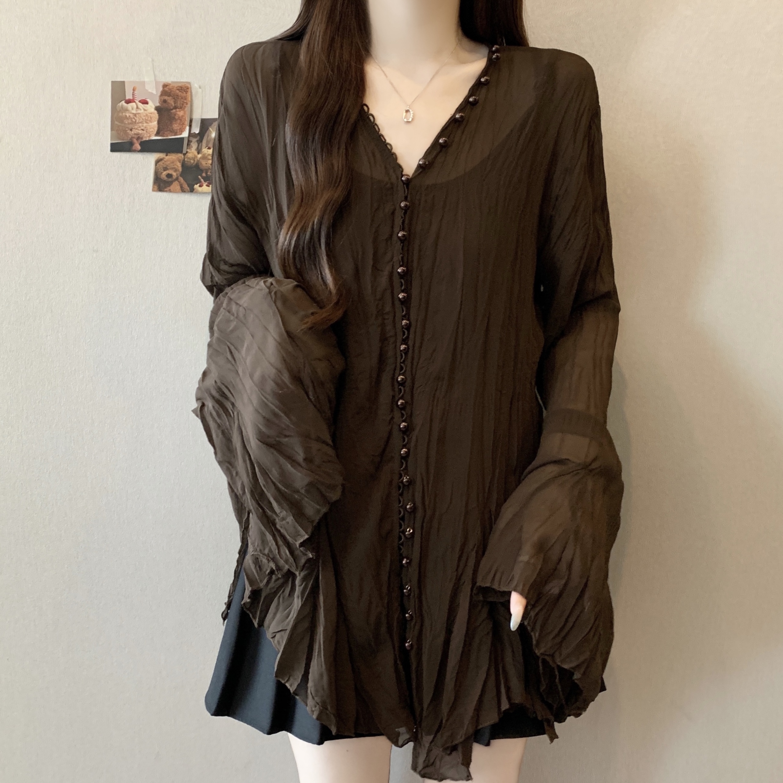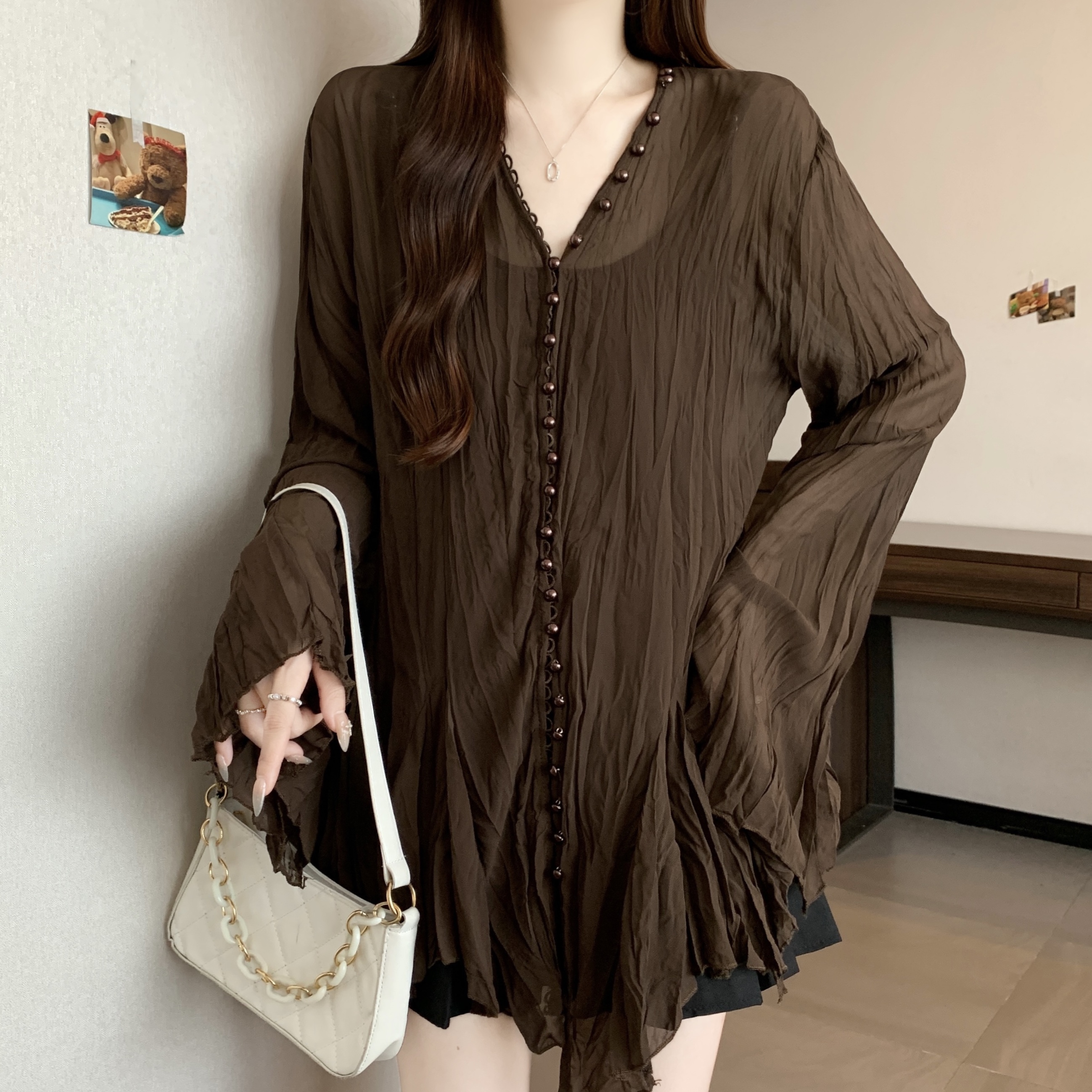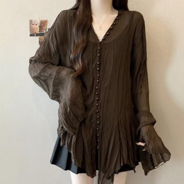 FA41602# 大码百搭显瘦V领单排扣褶皱喇叭袖长袖衬衫+吊带两件套 服裝批發女裝批發服飾貨源