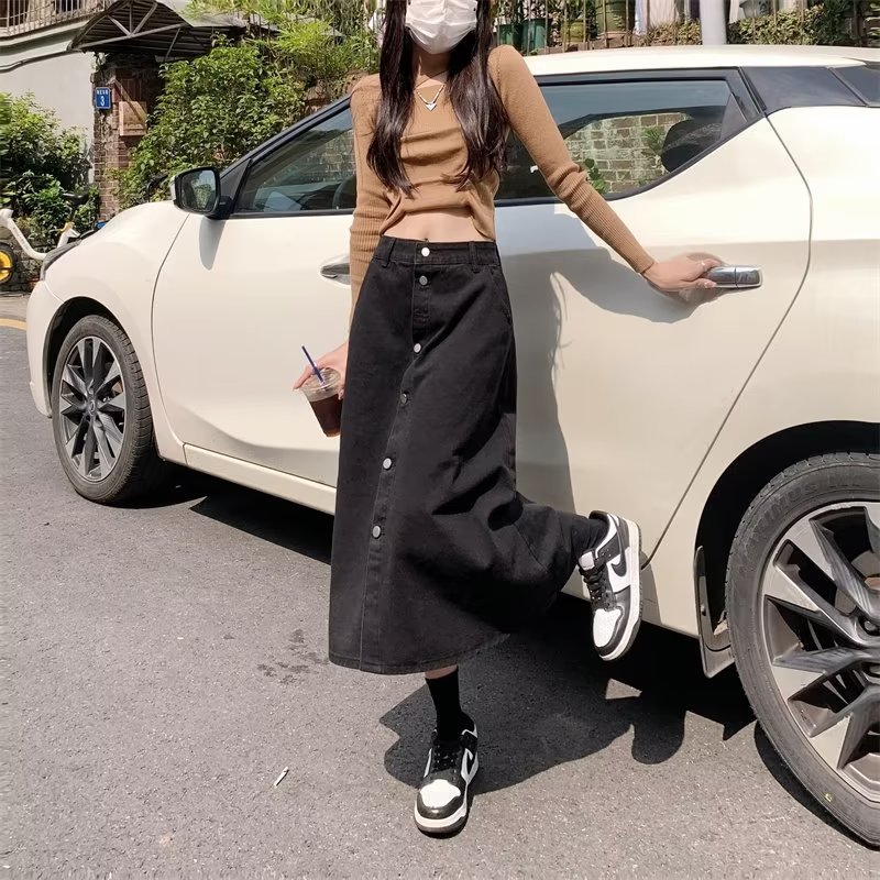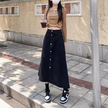 FA41608# 半身裙简约韩版休闲淑女宽松型A字裙长裙单排扣高腰夏季纯色 服裝批發女裝批發服飾貨源