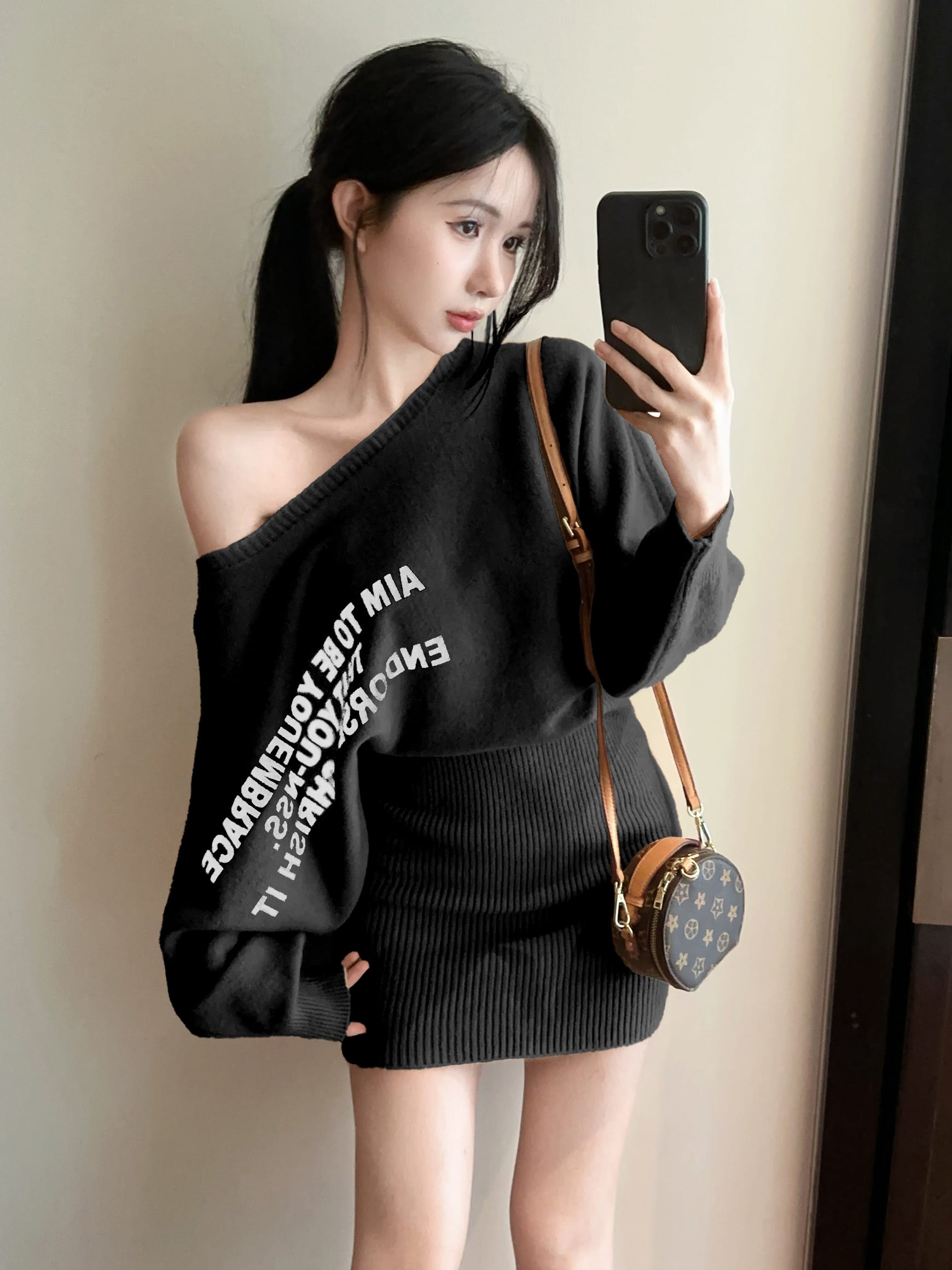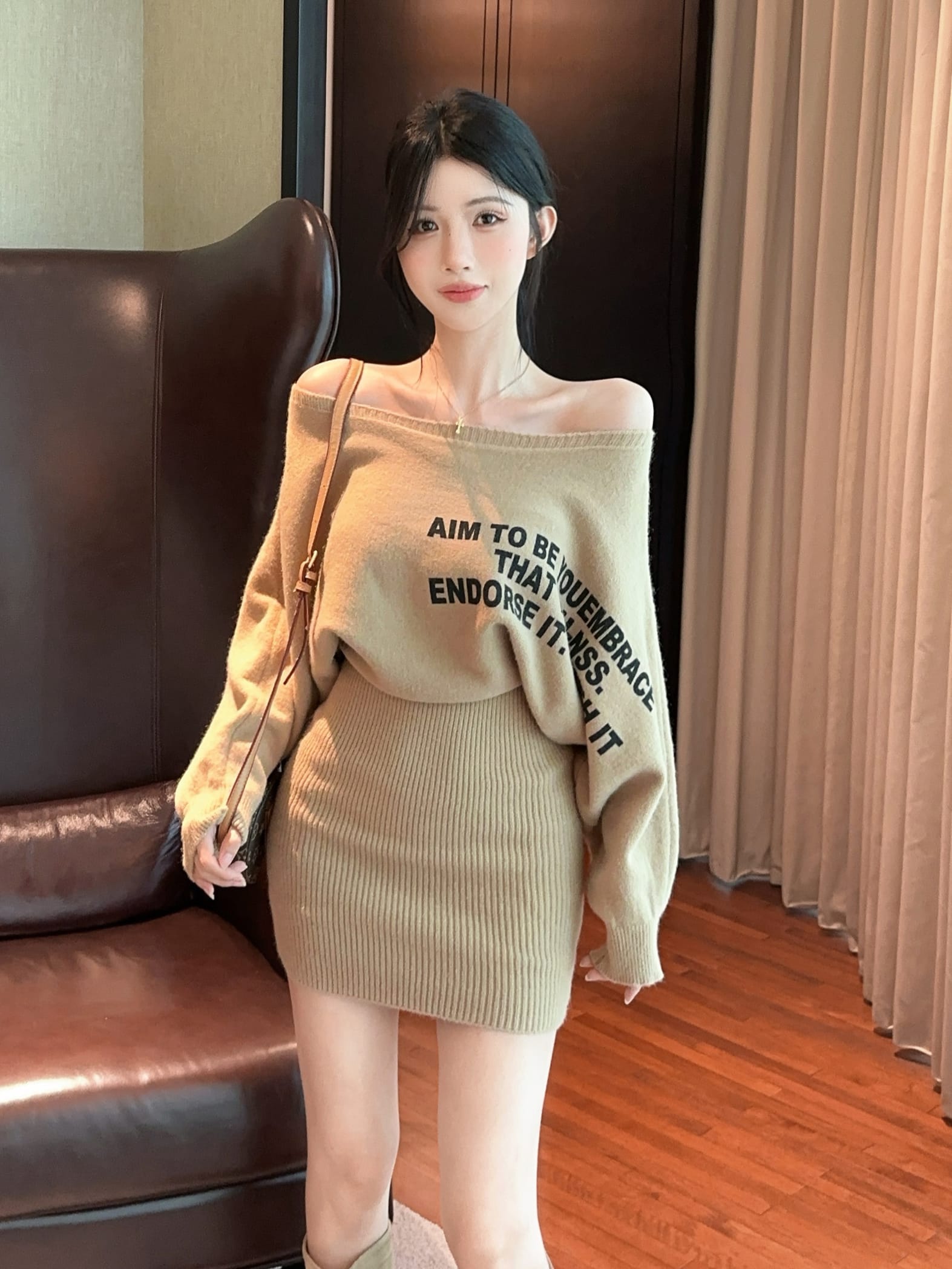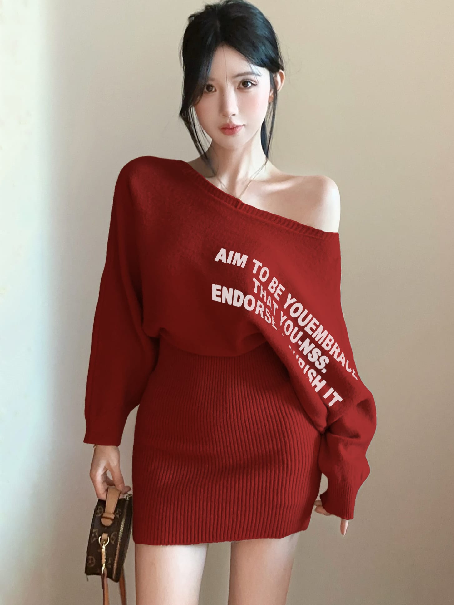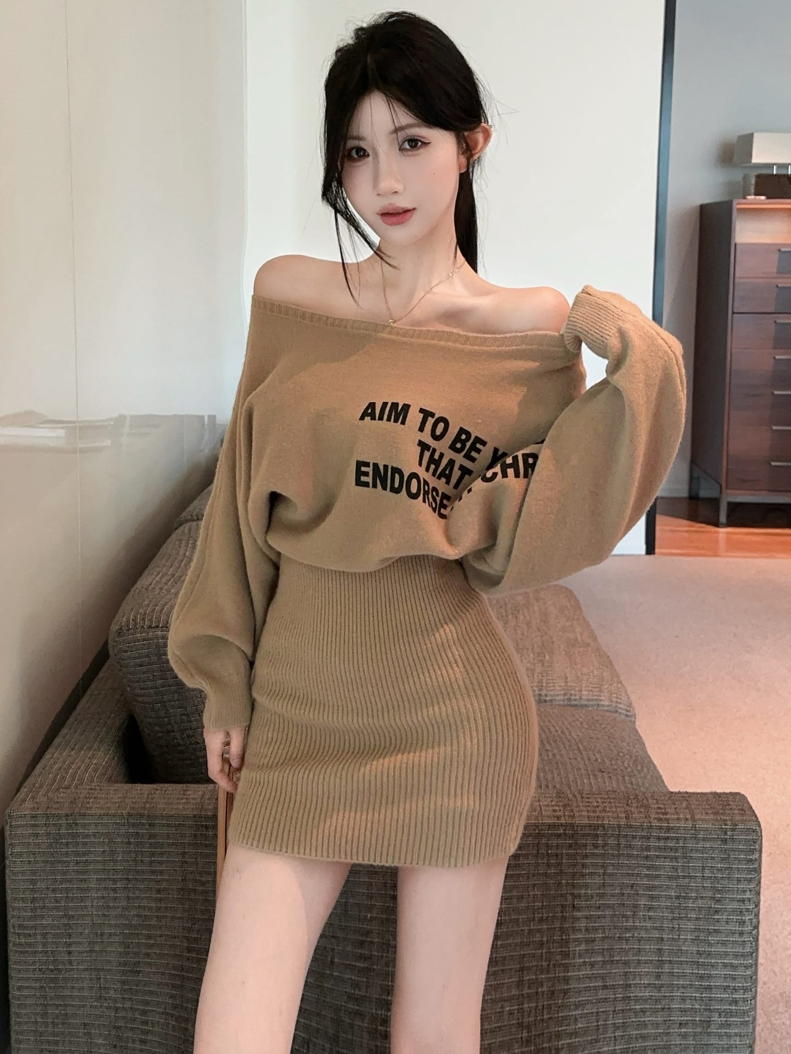 FA41610# 加厚辣妹露肩设计感针织连衣裙蝙蝠袖宽松显瘦毛衣裙 服裝批發女裝批發服飾貨源