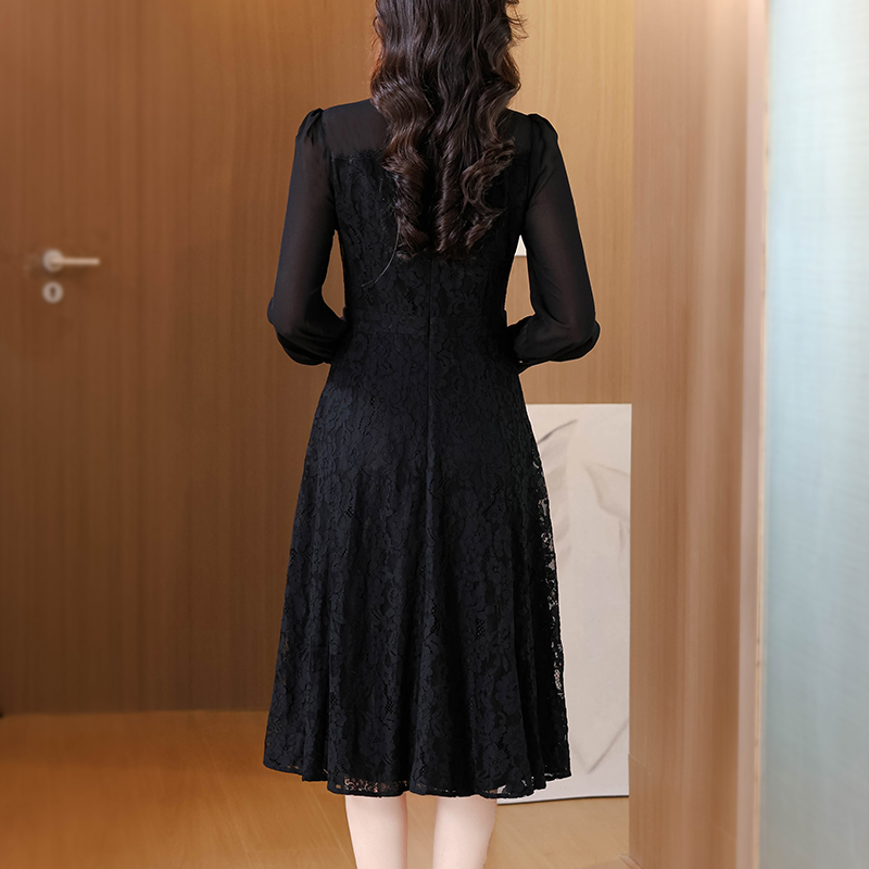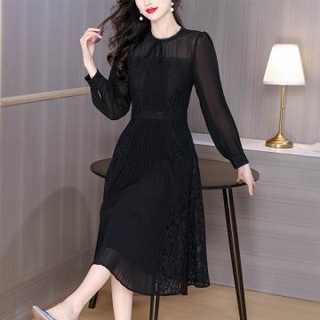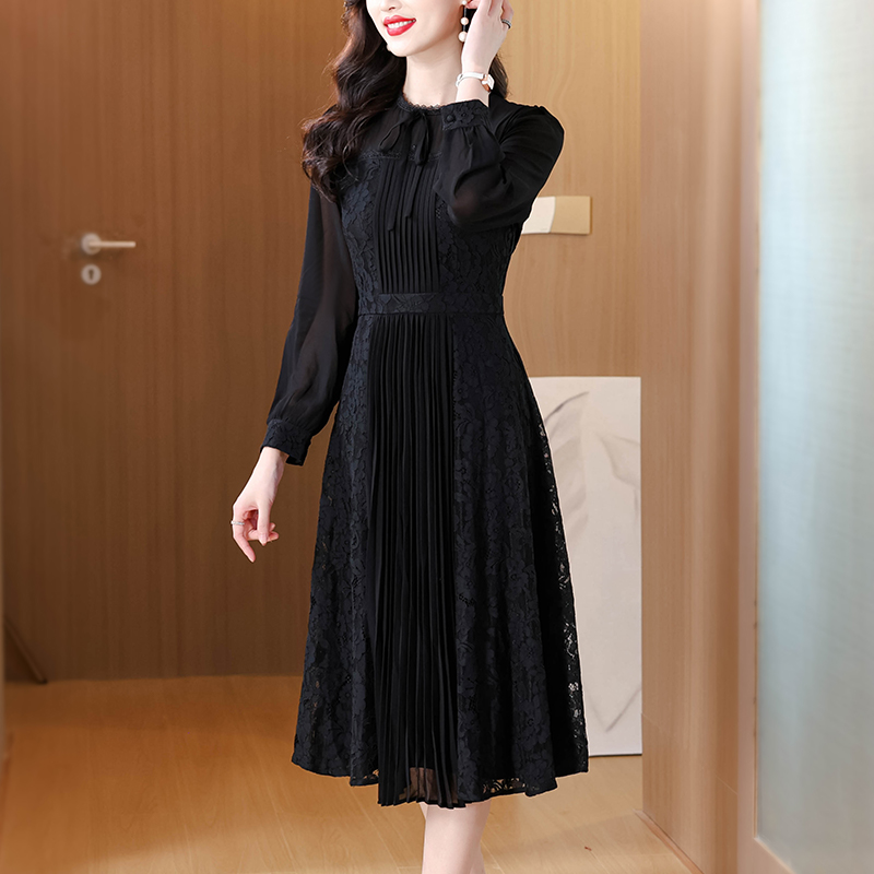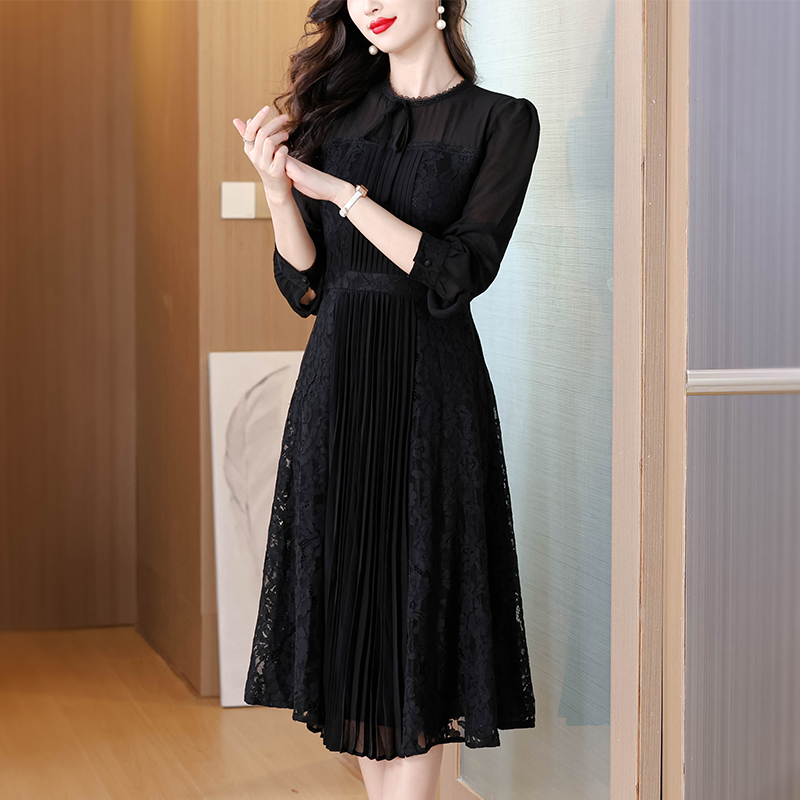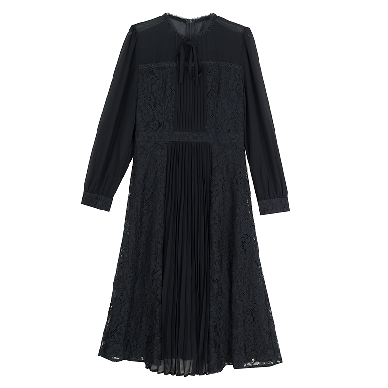 FA41618# 早秋气质名媛法式复古木耳边百褶a字收腰大摆蕾丝刺绣黑色连衣裙 服裝批發女裝批發服飾貨源