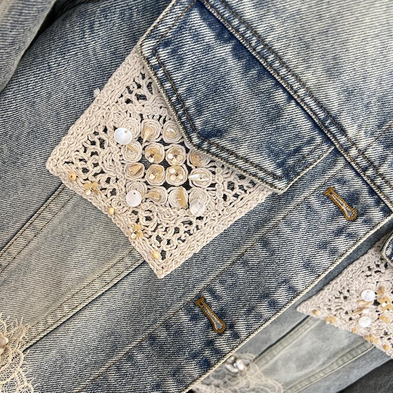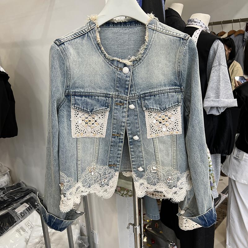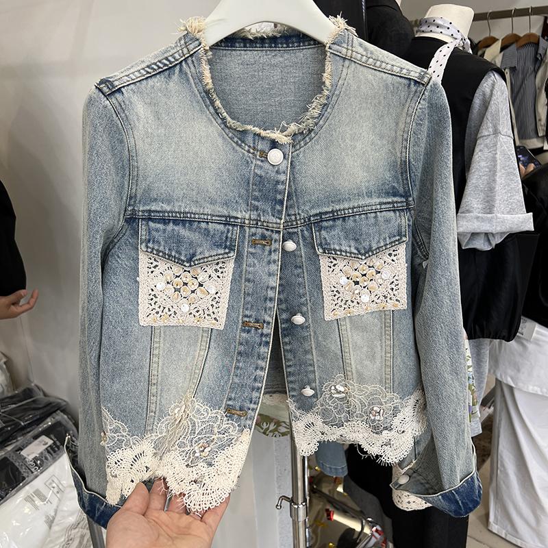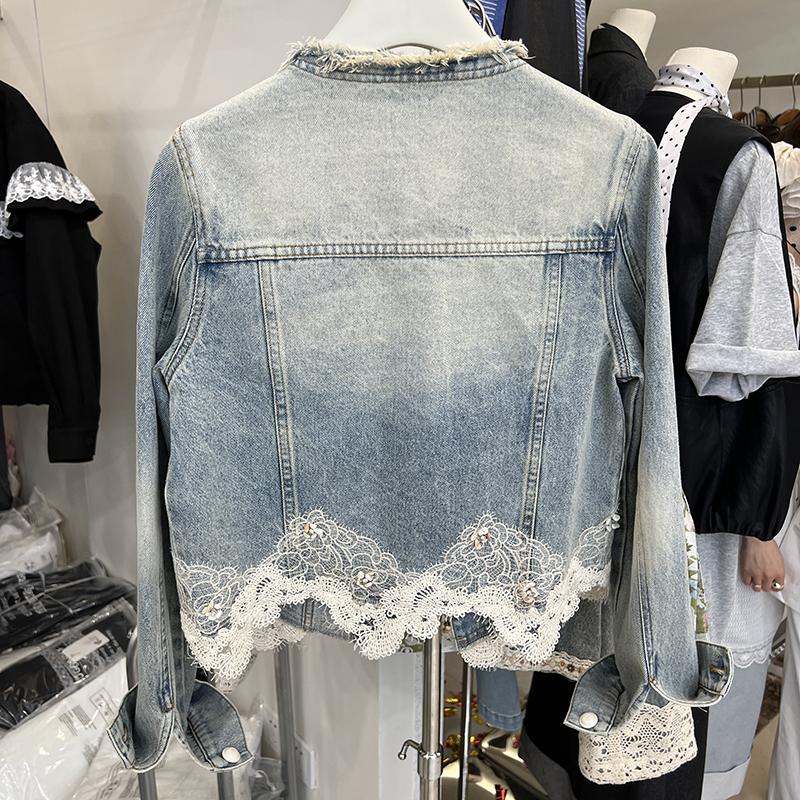 FA41773# 蕾丝拼接牛仔外套女春季新款宽松韩版bf慵懒风小个子短款上衣 服裝批發女裝批發服飾貨源