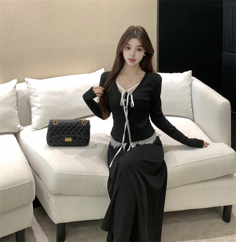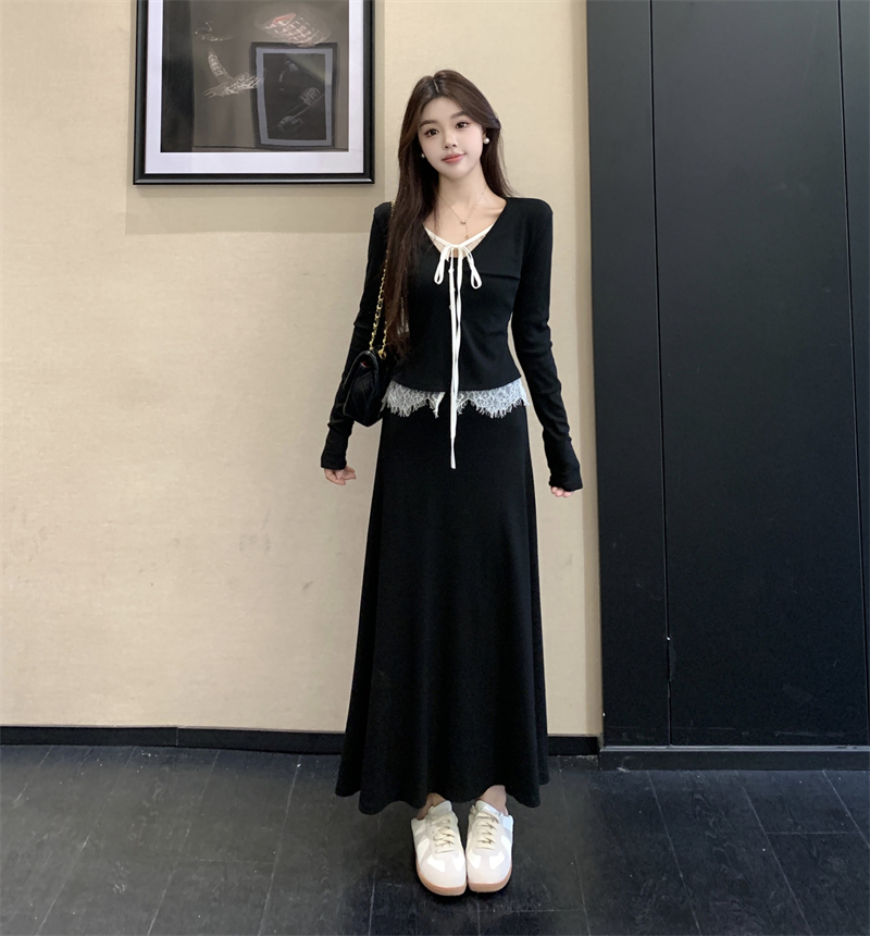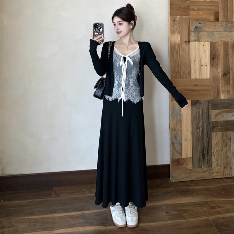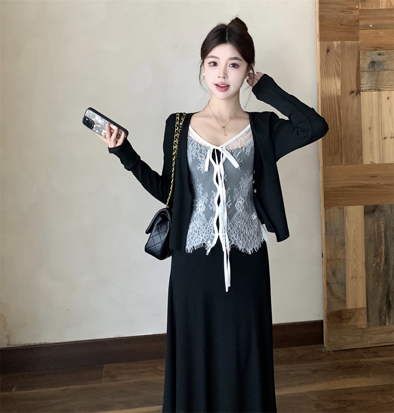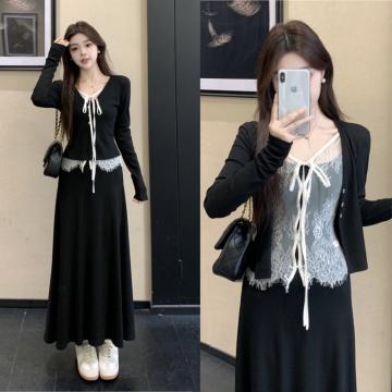 FA41926# 大码秋季收腰蕾丝长袖小香风法式V领拼接上衣+吊带裙两件套装 服裝批發女裝批發服飾貨源