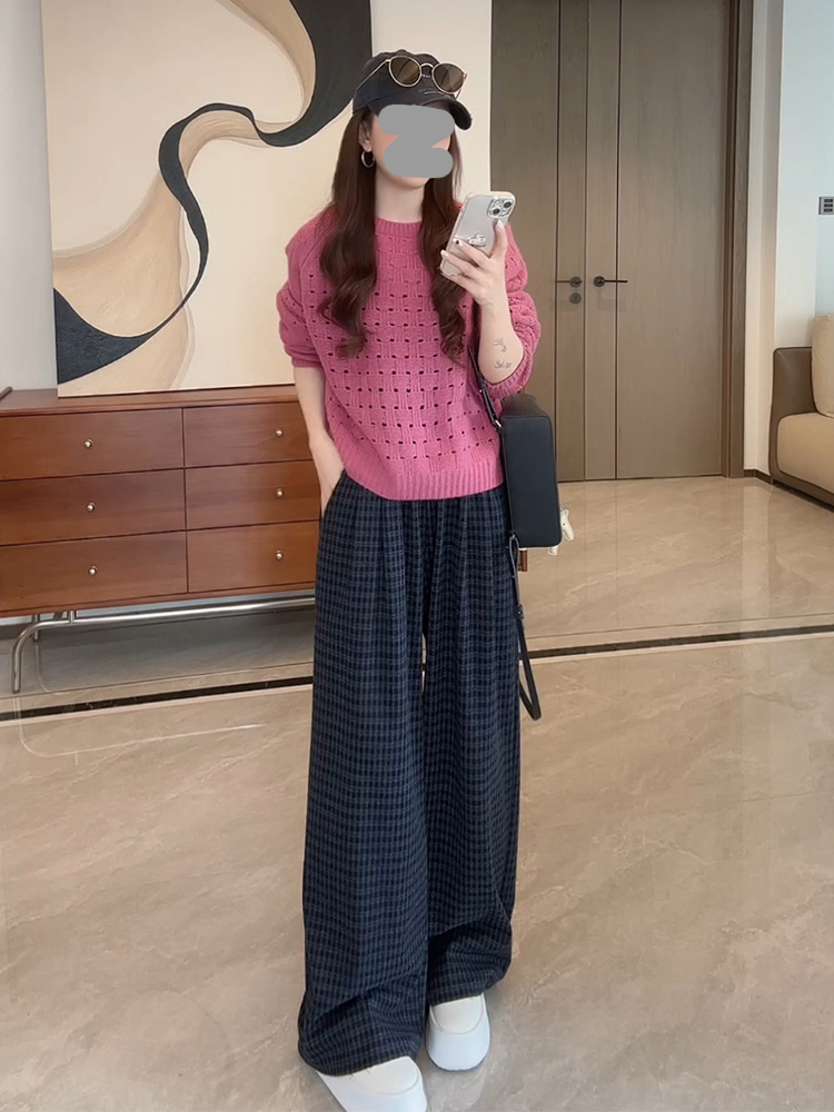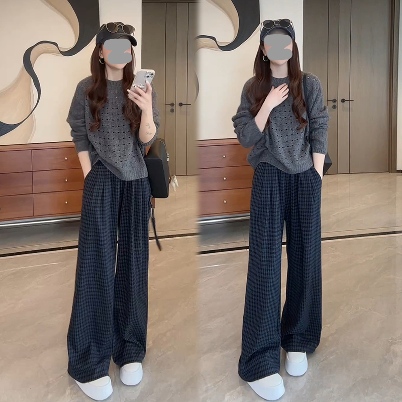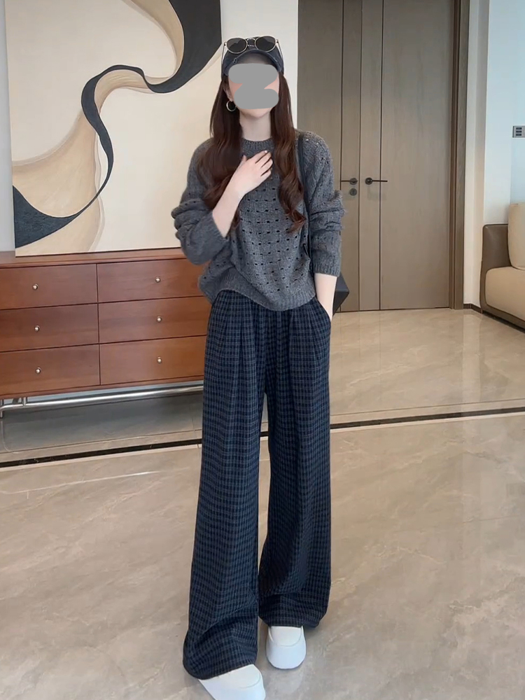 灰色拼蓝黑格休闲裤