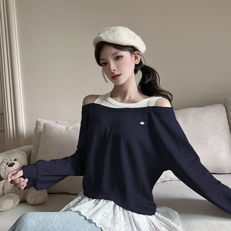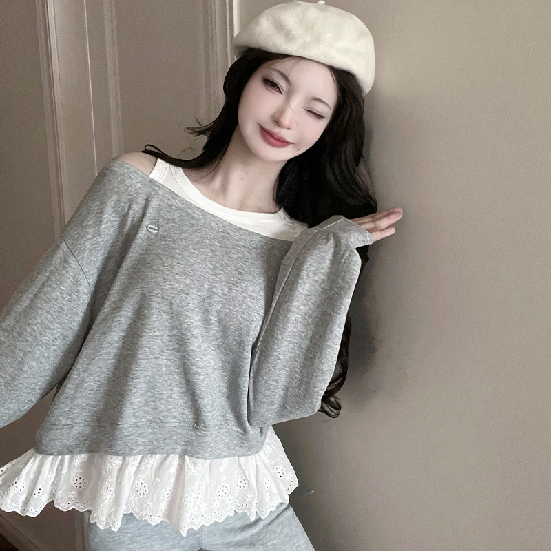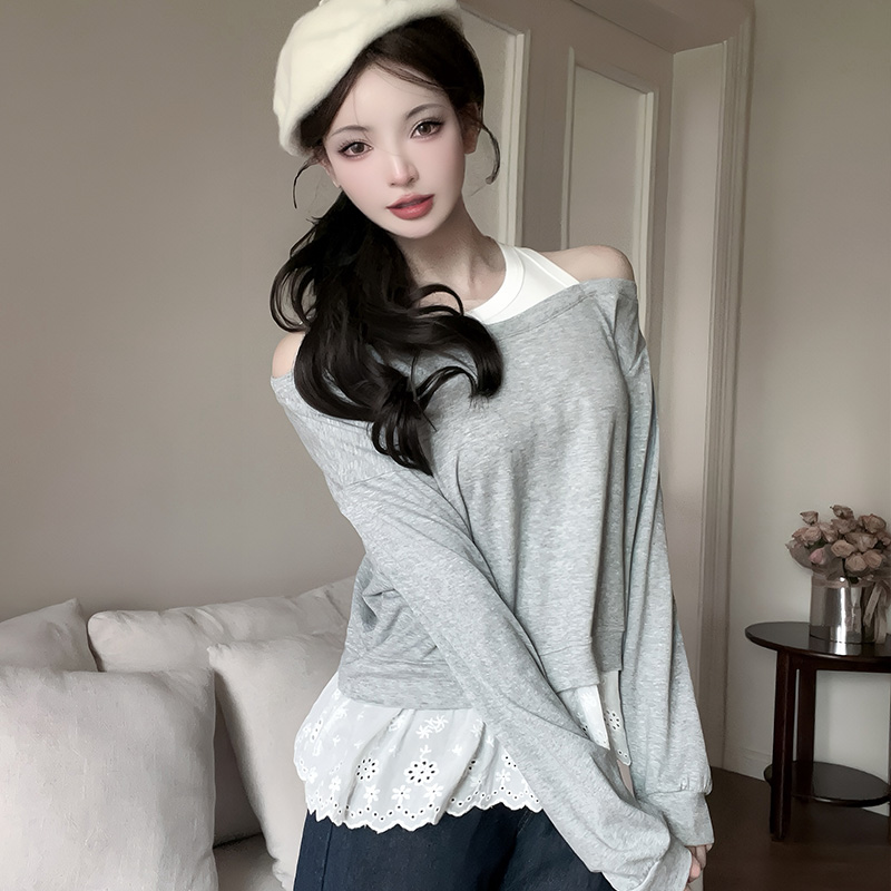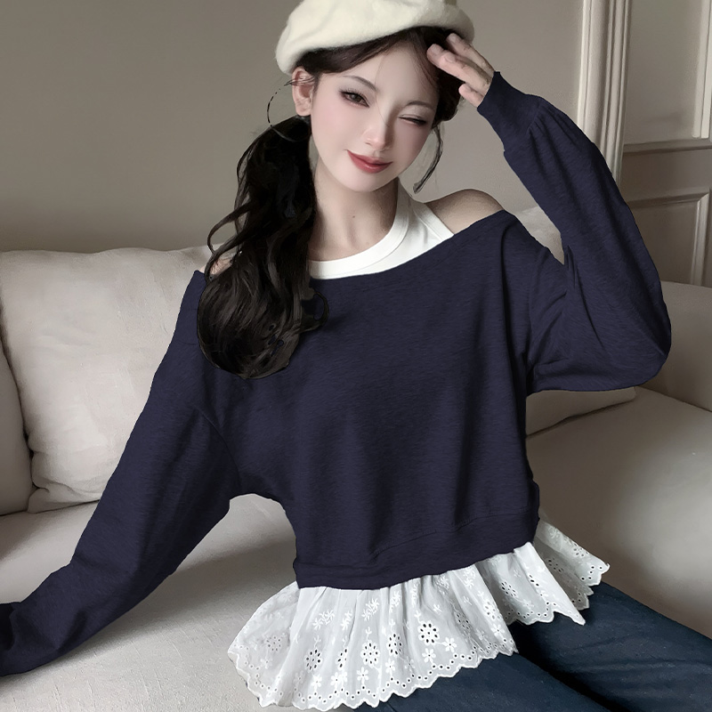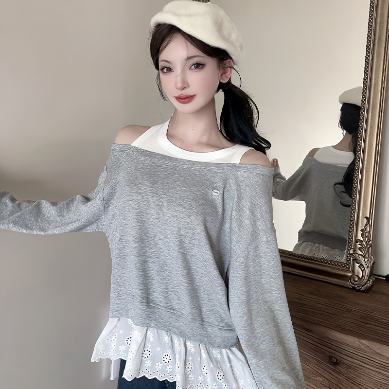 FA42008# 秋慵懒长袖露肩休闲松弛显瘦蕾丝拼接假两件斜肩卫衣上衣 服裝批發女裝批發服飾貨源