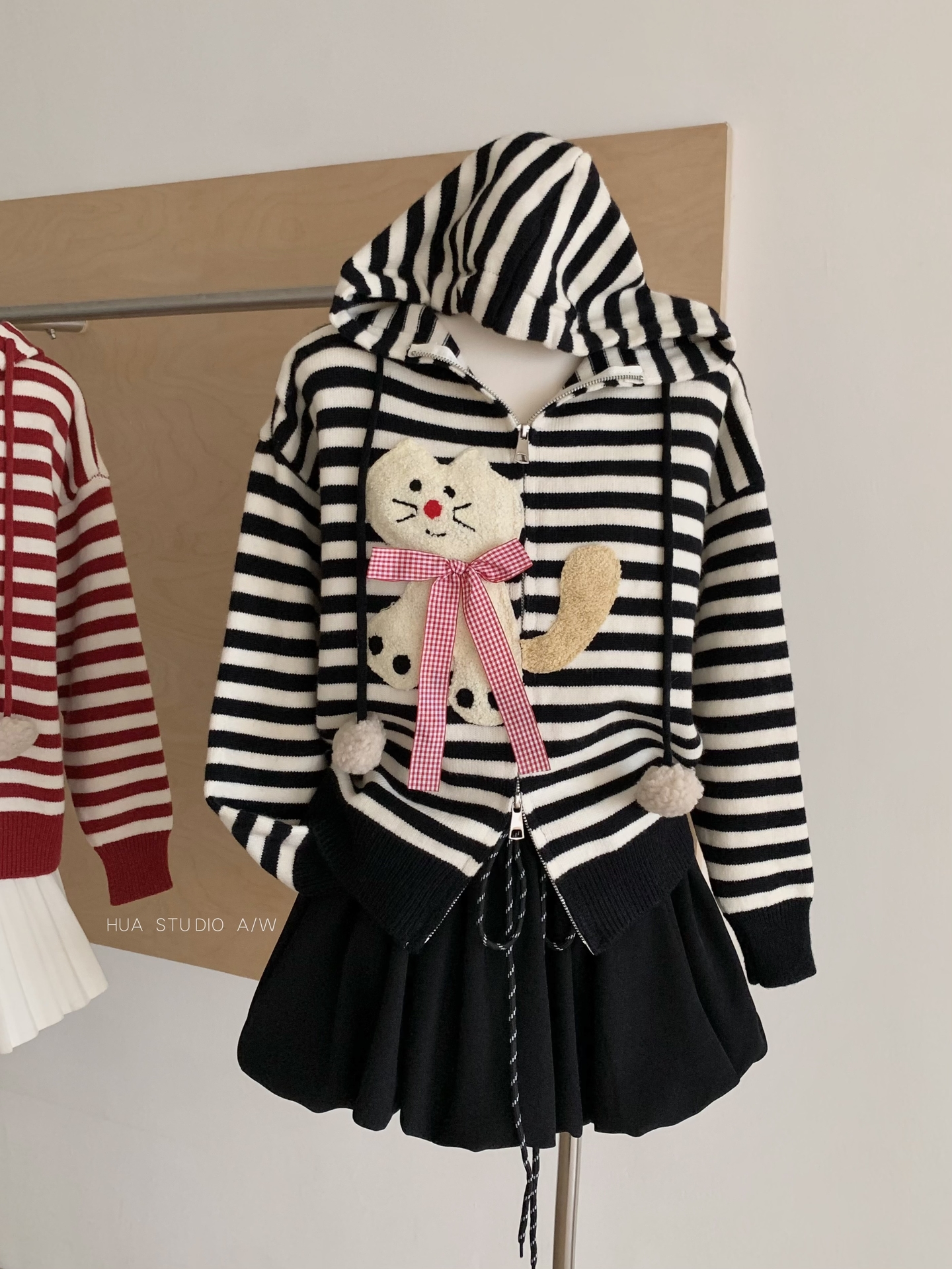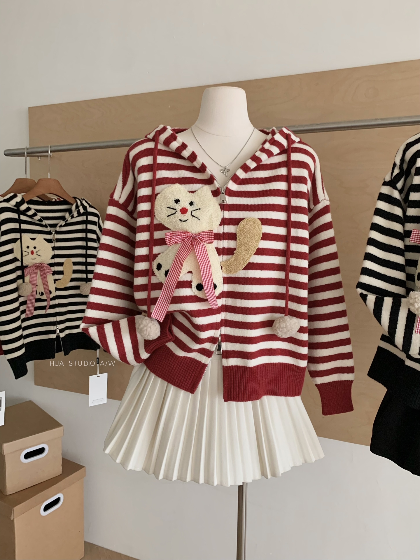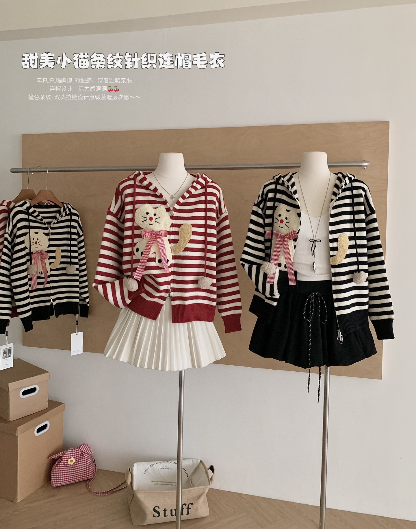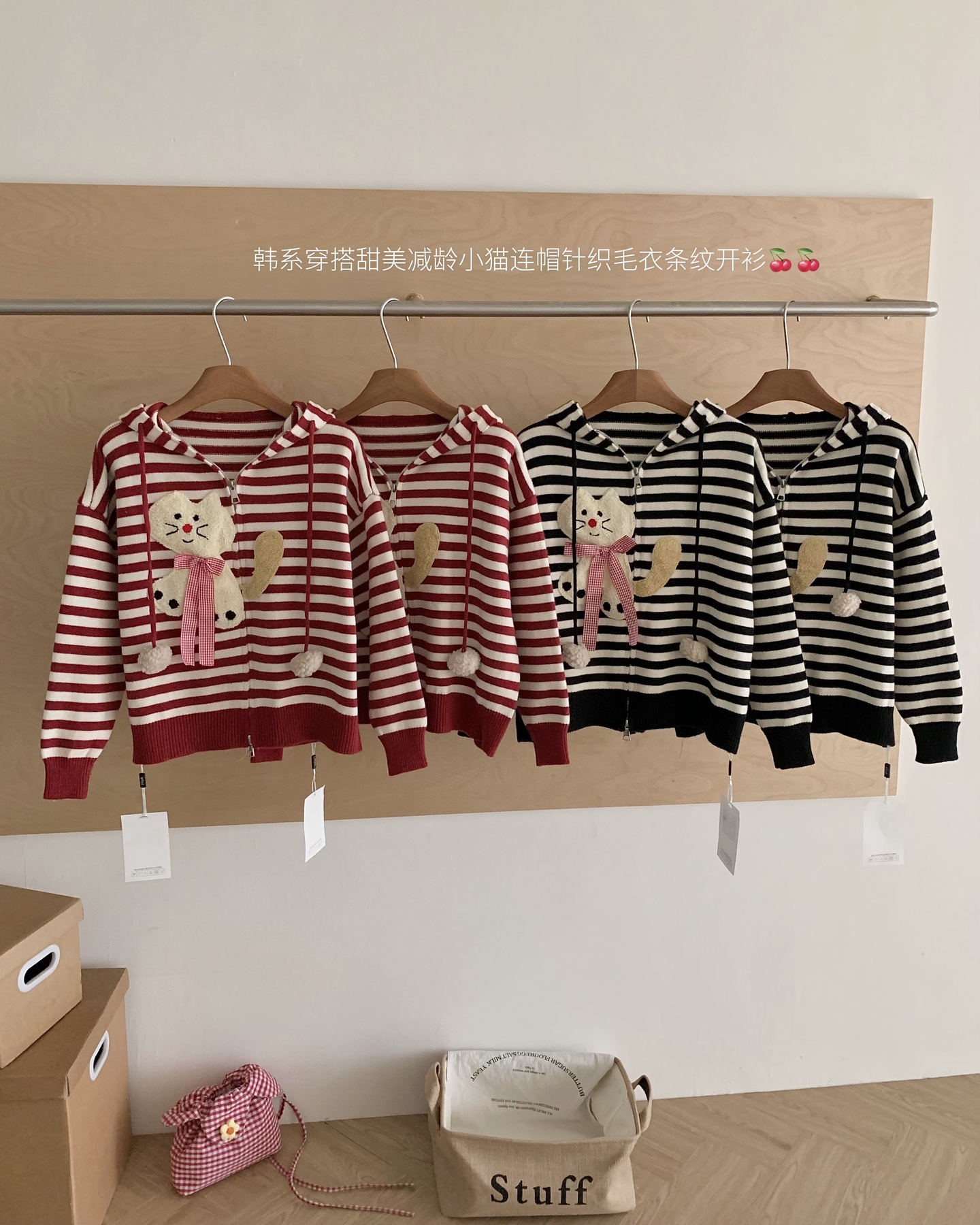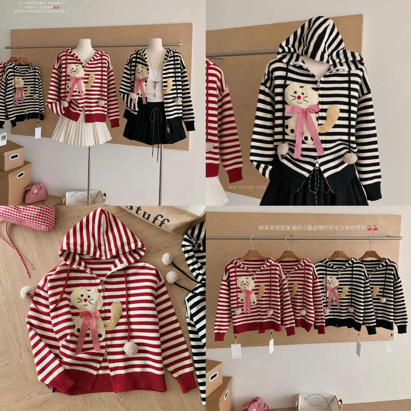 FA42014# 甜美小猫条纹撞色连帽条纹针织毛衣女秋季新款宽松慵懒风外套 服裝批發女裝批發服飾貨源