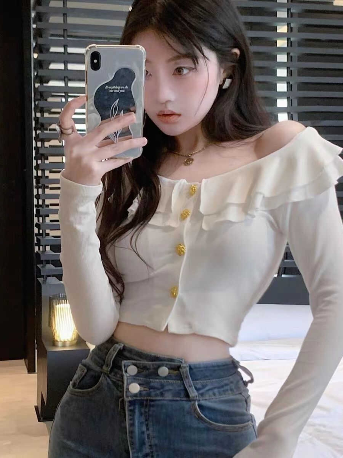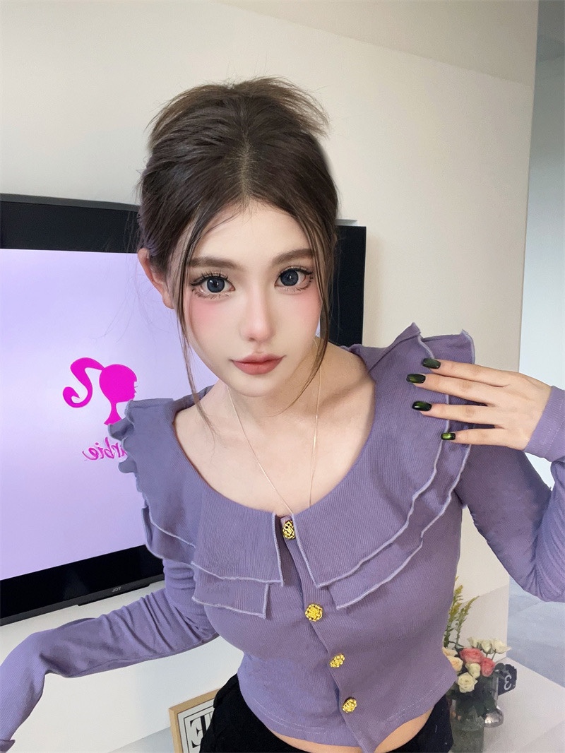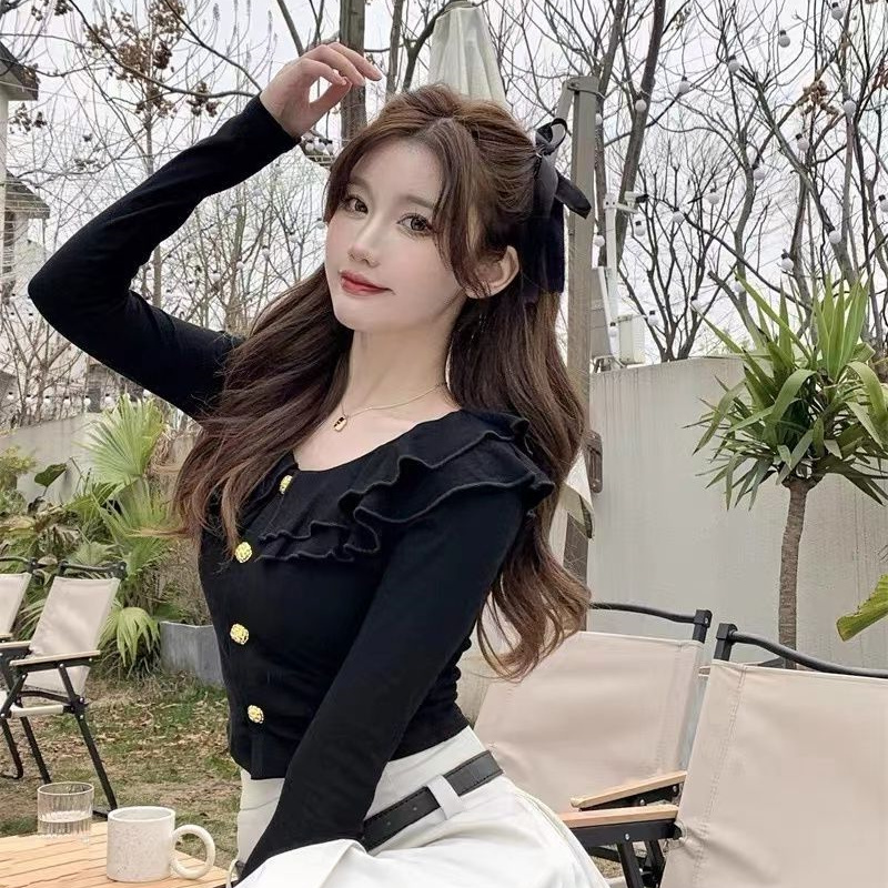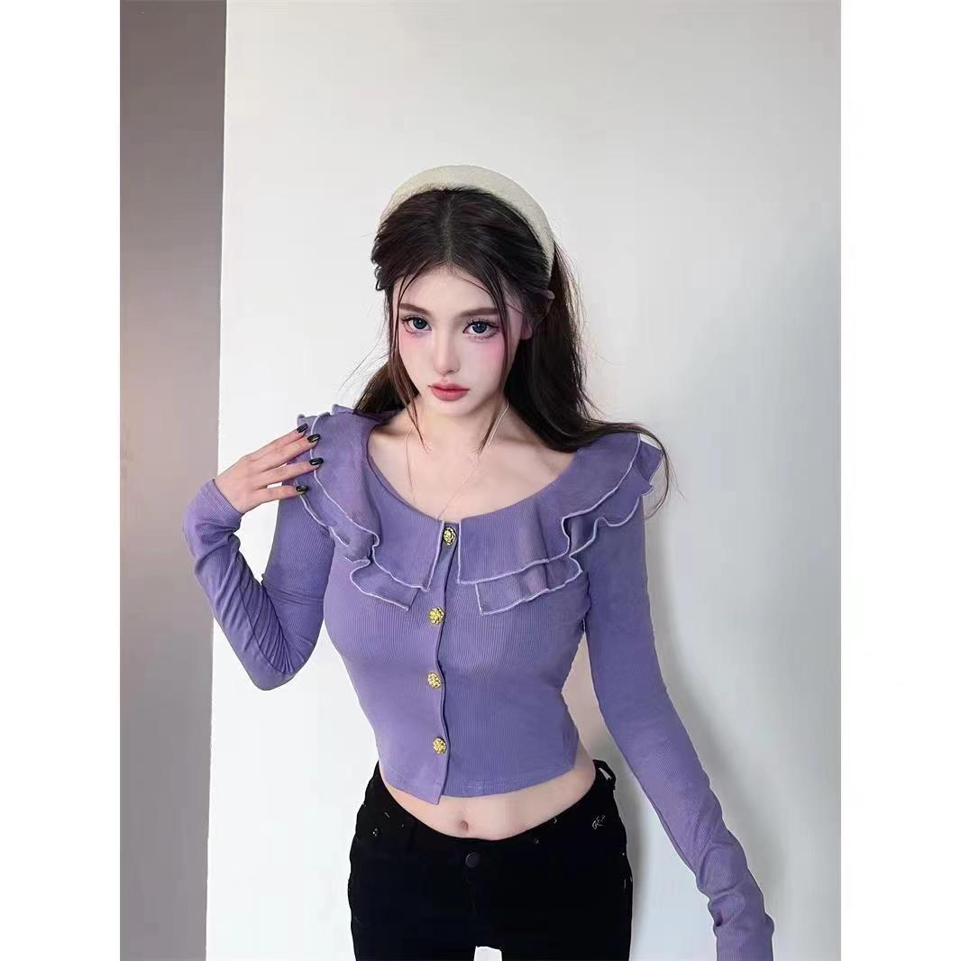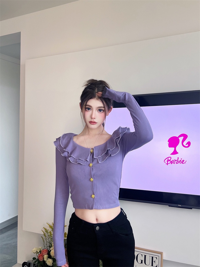 FA42023# 秋款性感短款露脐修身上衣圆领双层荷叶边T恤女长袖打底衫 服裝批發女裝批發服飾貨源