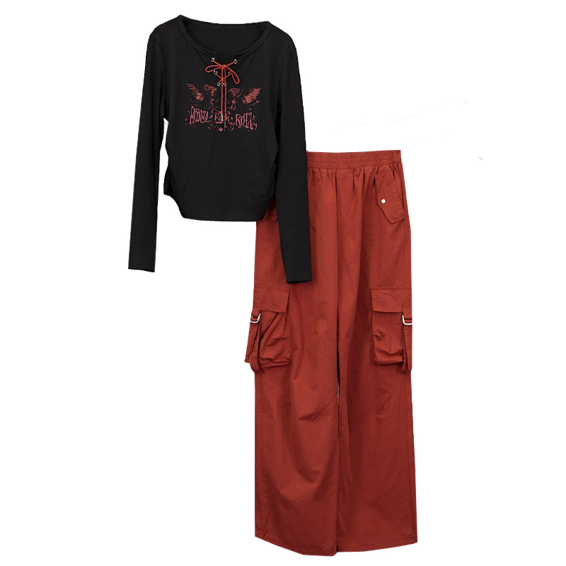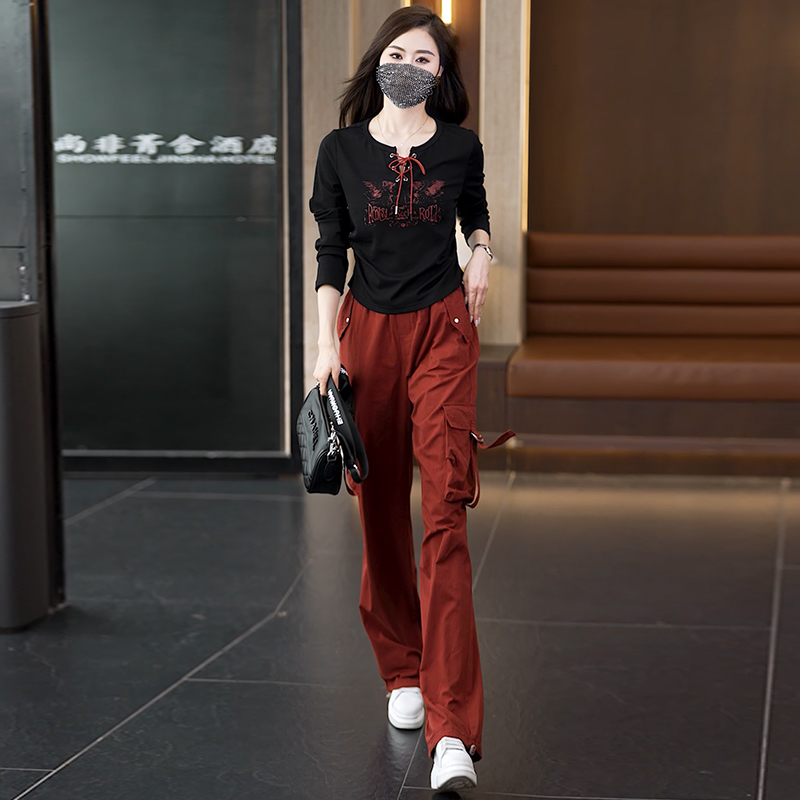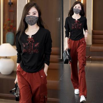FA42086# 大码胖mmT恤工装风束脚休闲裤套装两件套直筒裤女秋时髦显瘦