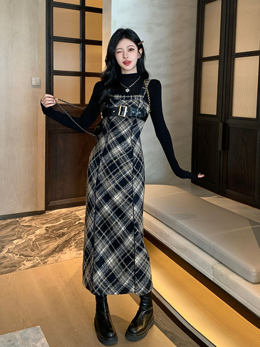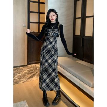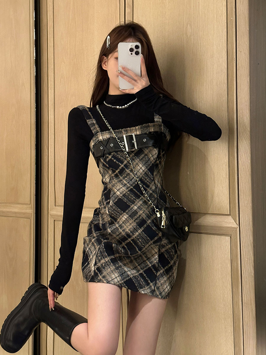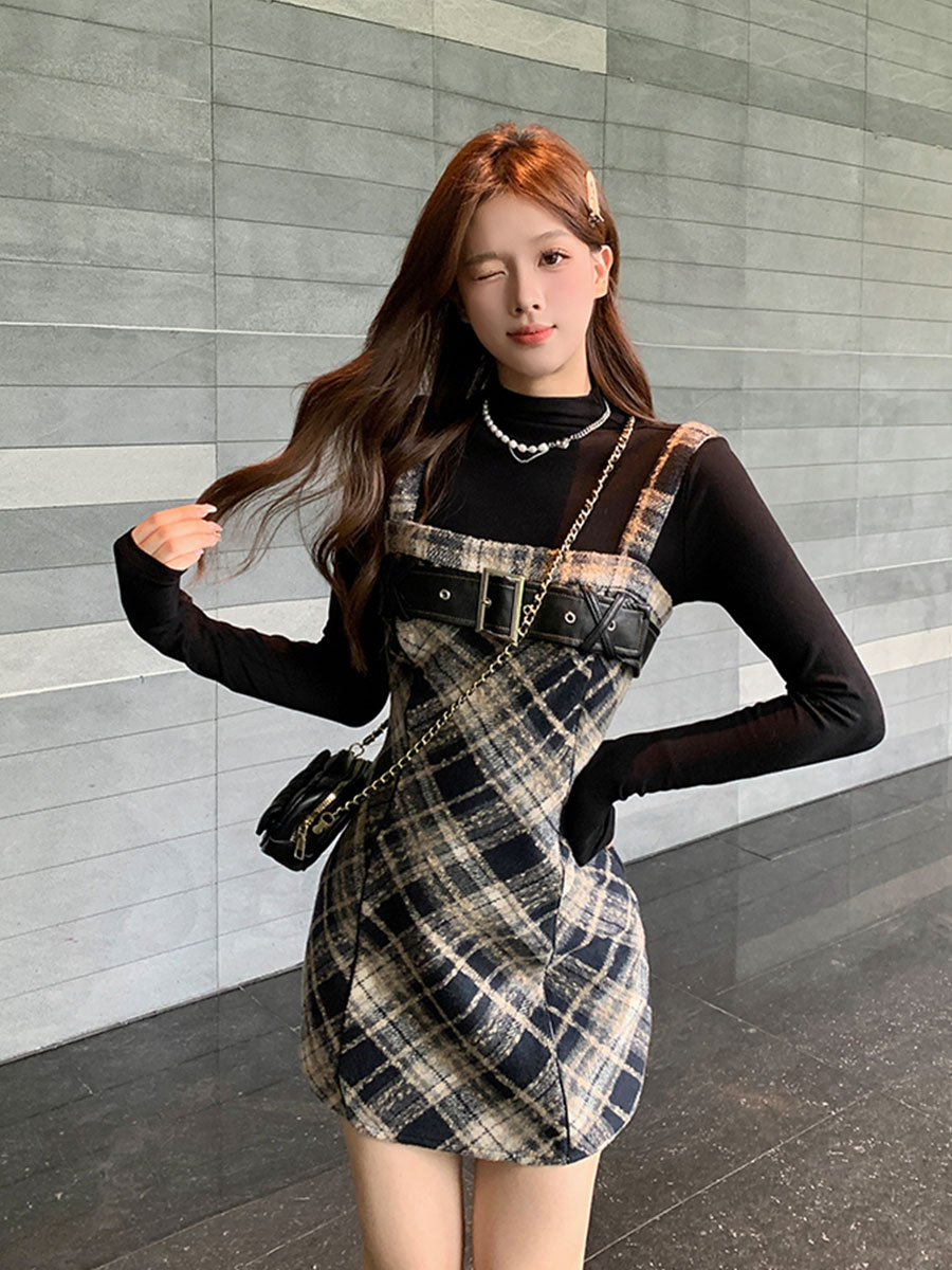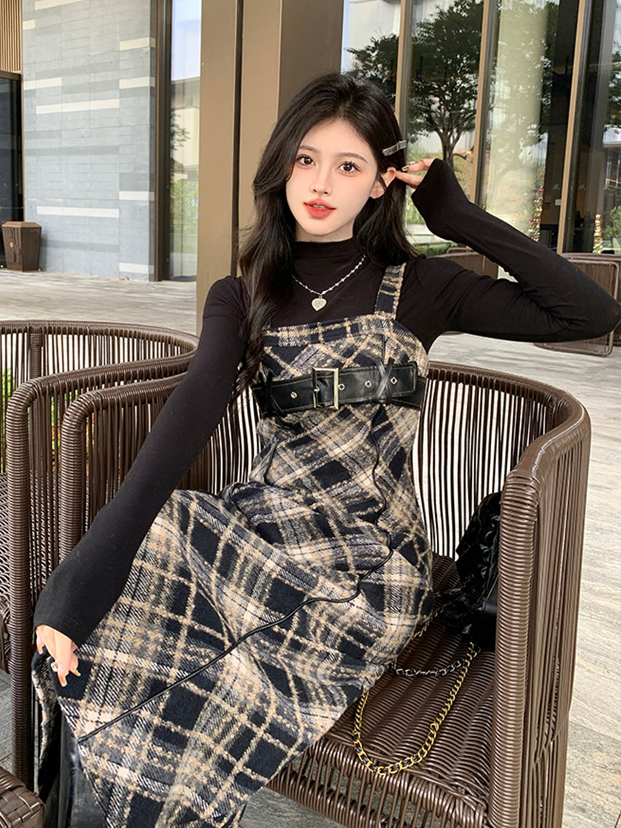 FA42148# 秋冬设计感气质格纹吊带裙套装女胖mm显瘦内搭上衣甜酷漂亮两件套