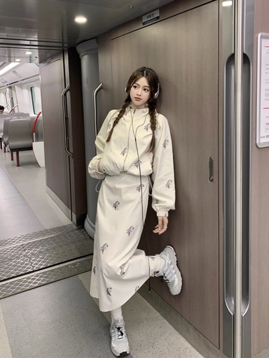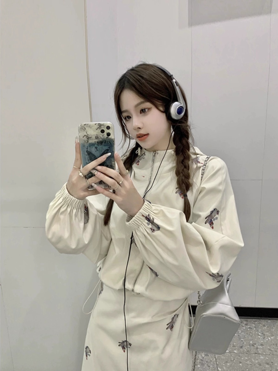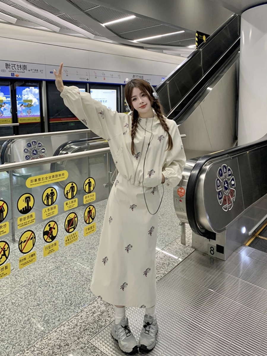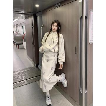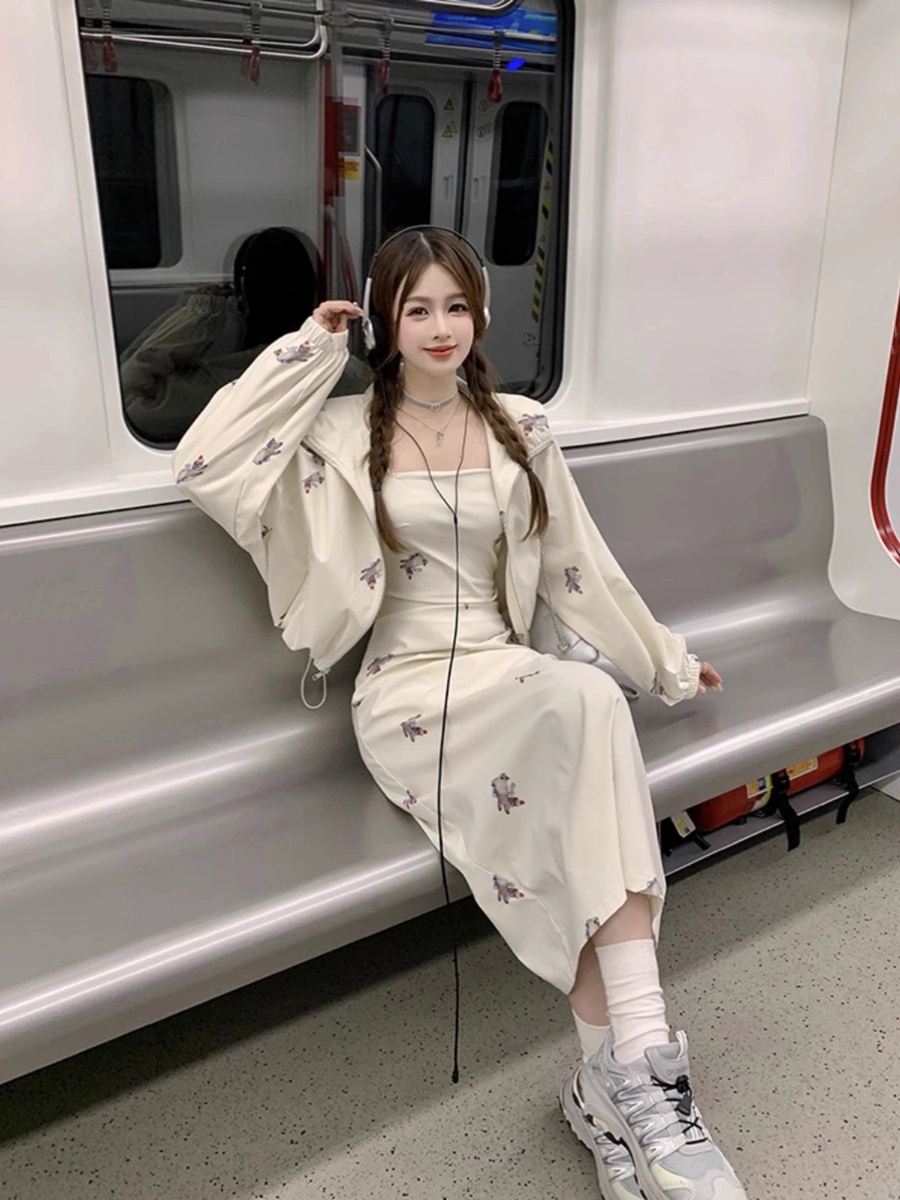 FA42149# 设计感连帽印花长袖外套收腰显瘦吊带连衣裙女秋季新款两件套