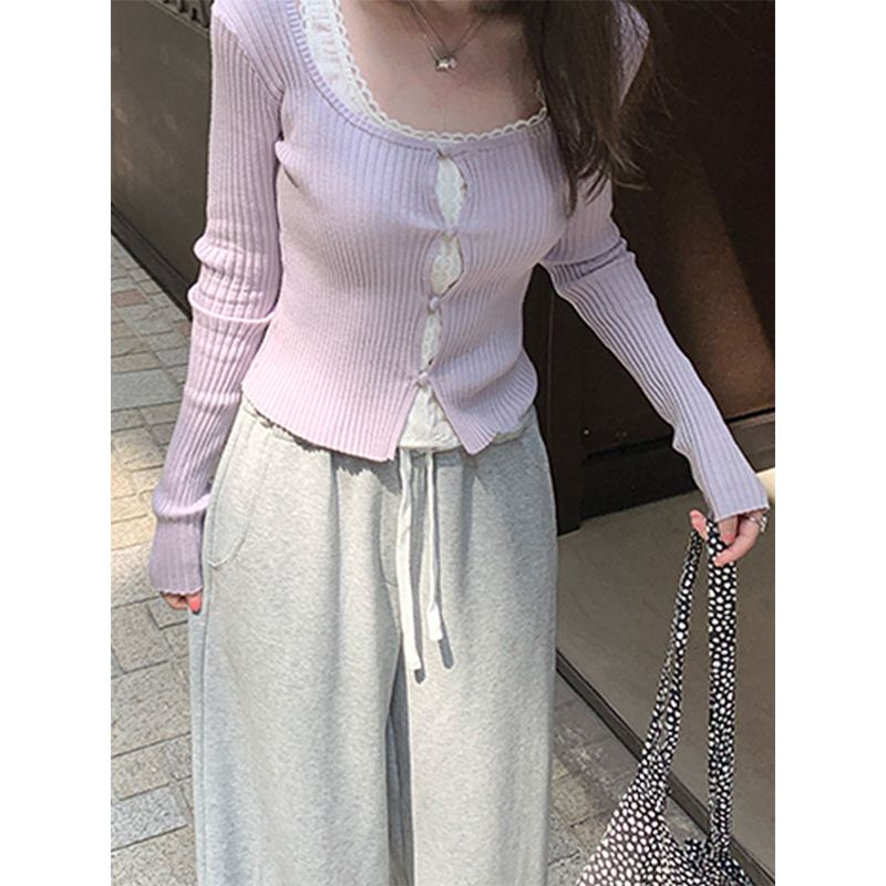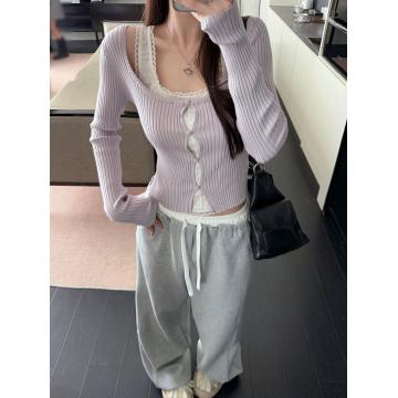 FA42547# 韩系假两件紫色针织打底衫女早秋chic甜辣妹蕾丝花边内搭短款上衣 服裝批發女裝批發服飾貨源