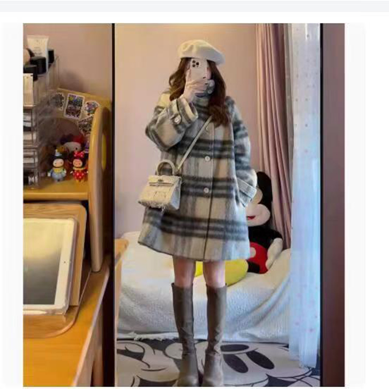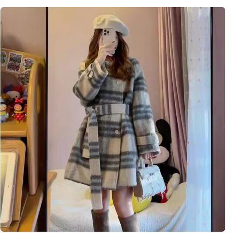 Home > 毛呢外套、粗呢外套 > YF5970# 图片色冬季复古格子长袖排扣绑带系腰中长款洋气撞色呢子外套