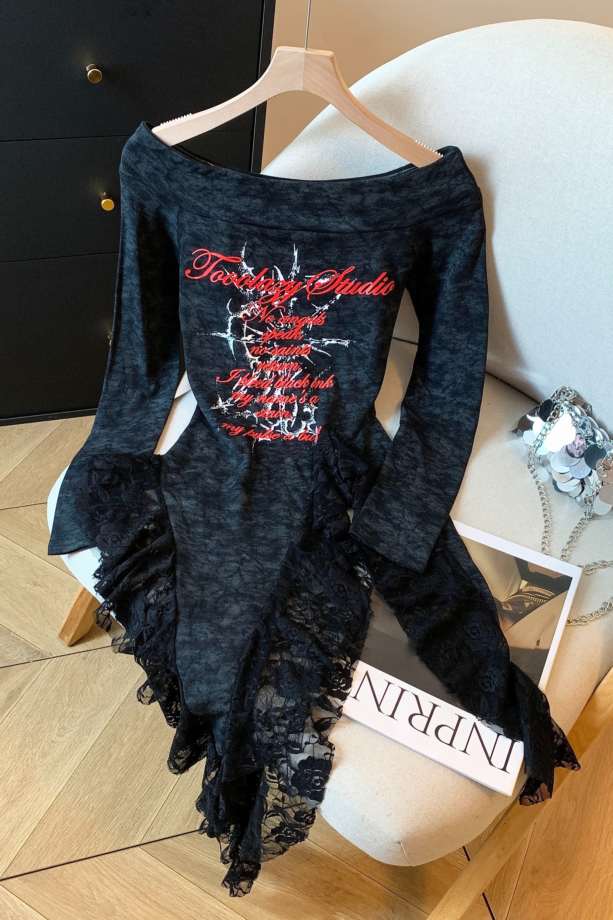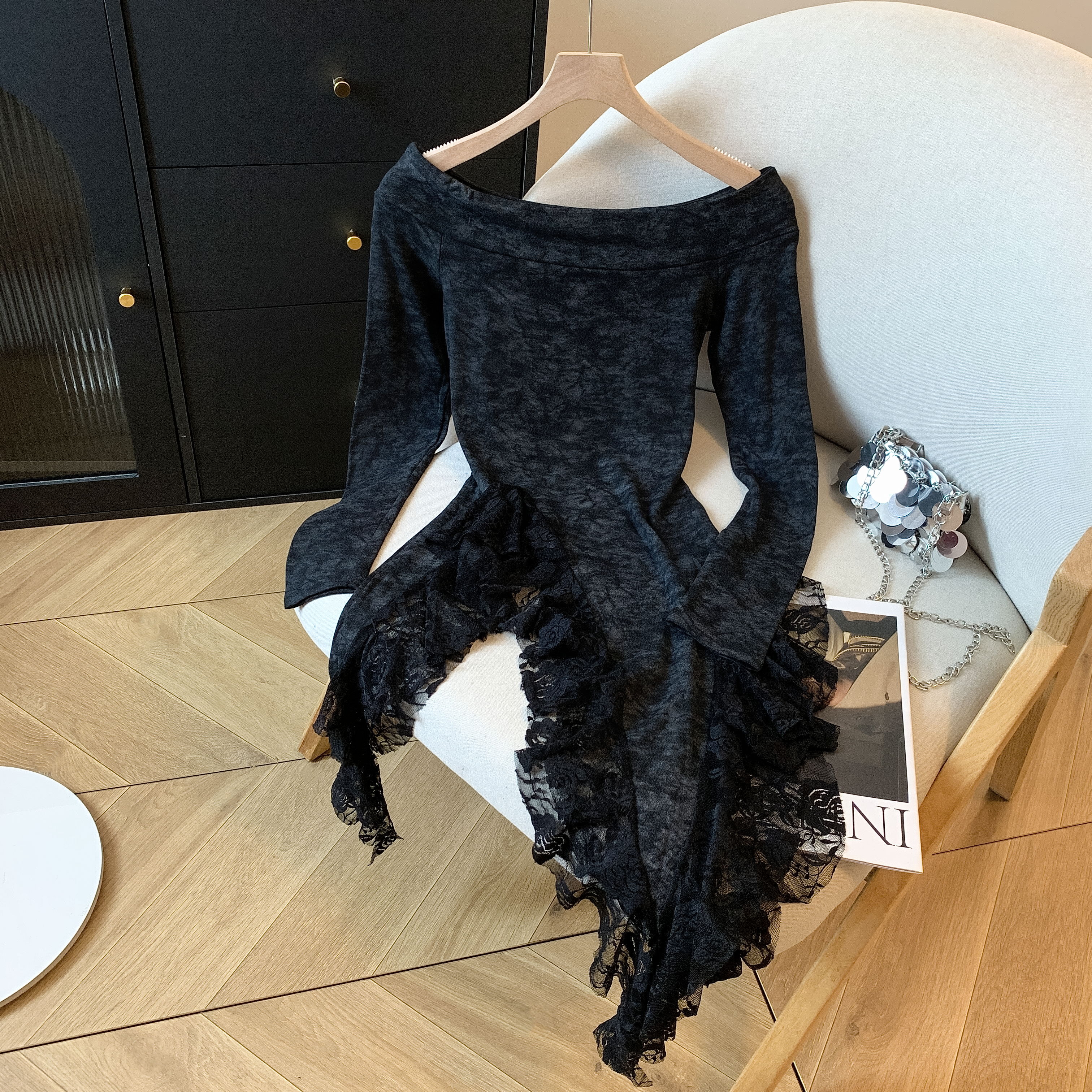 FA42738# 蕾丝不规则一字肩飘带长袖T恤女上衣修身显瘦设计感小众 服裝批發女裝批發服飾貨源