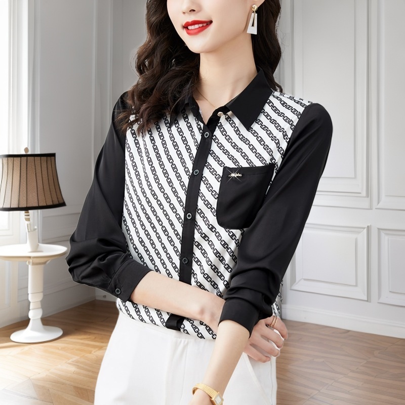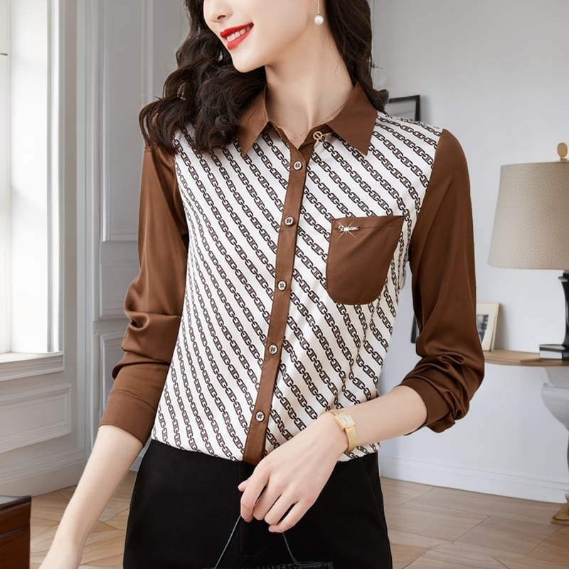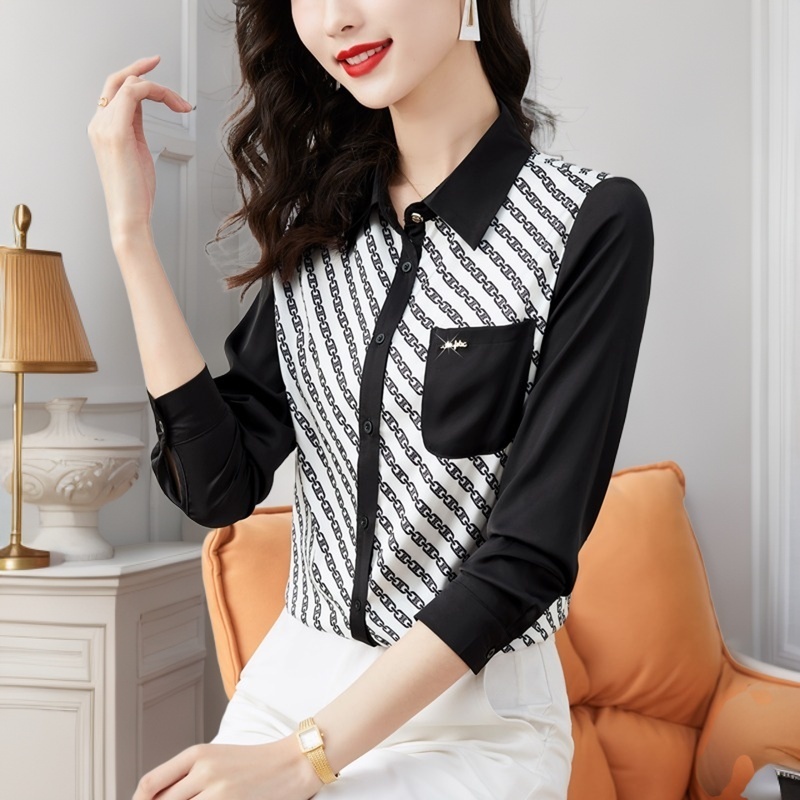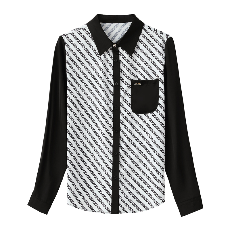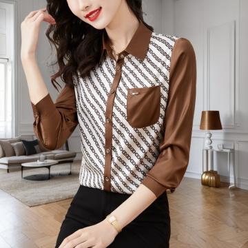 FA42754# 年新款翻领衬衣印花重磅锻面长袖宽松大码女上衣 服裝批發女裝批發服飾貨源