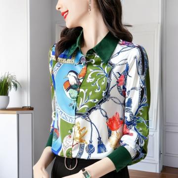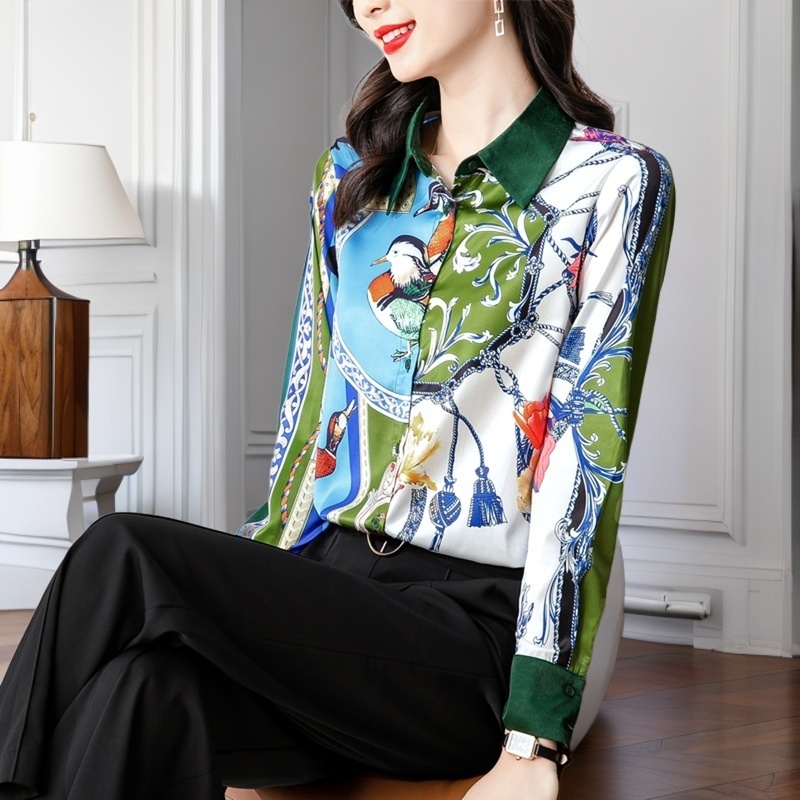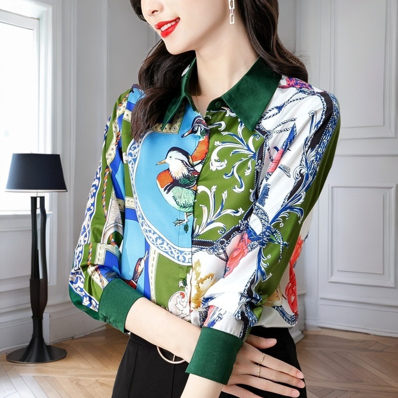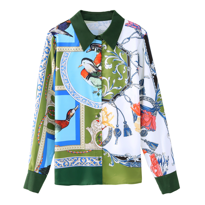 FA42755# 秋新款欧货缎面长袖撞色印花衬衫女设计感小众高端上衣 服裝批發女裝批發服飾貨源