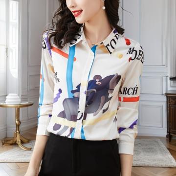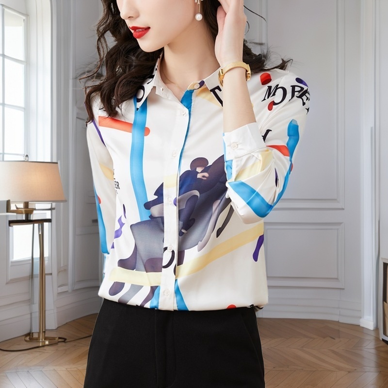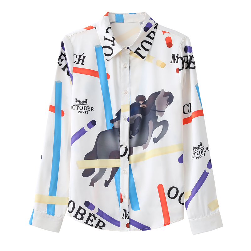 FA42757# 秋新款欧货缎面长袖撞色印花衬衫女设计感小众高端上衣 服裝批發女裝批發服飾貨源