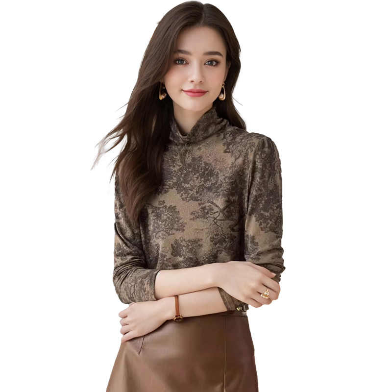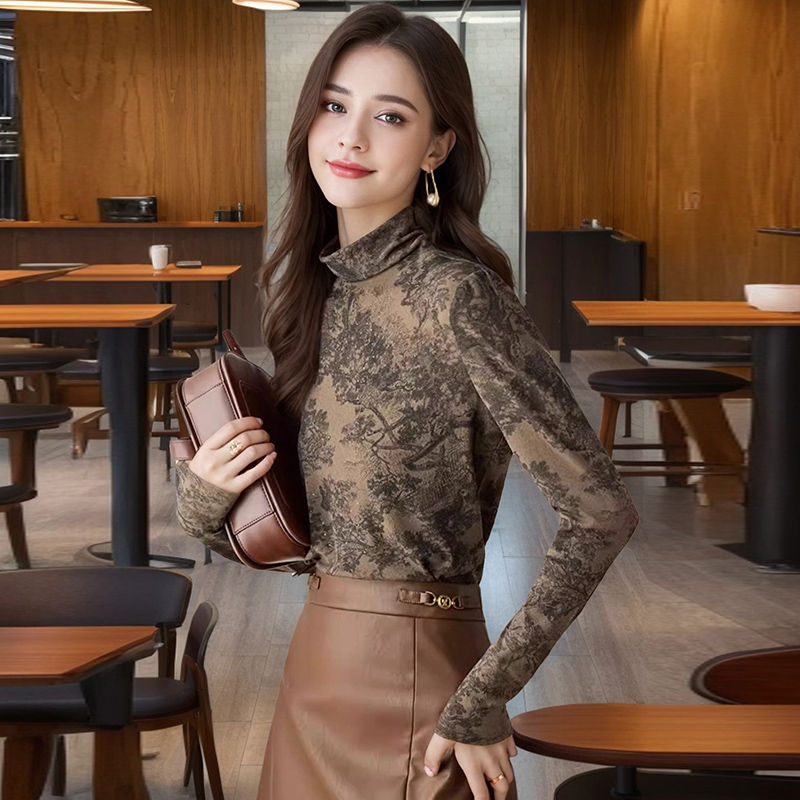 FA42759# 长袖上衣烫钻半高领修身高级水墨画打底衫女秋新款印花T恤 服裝批發女裝批發服飾貨源