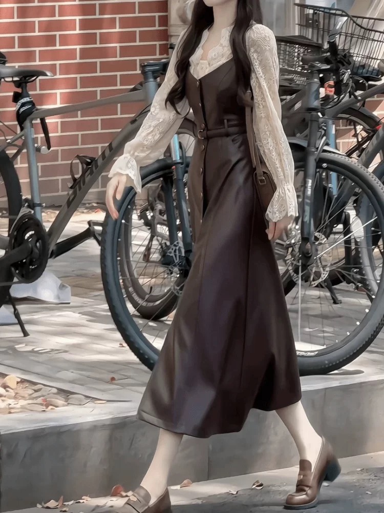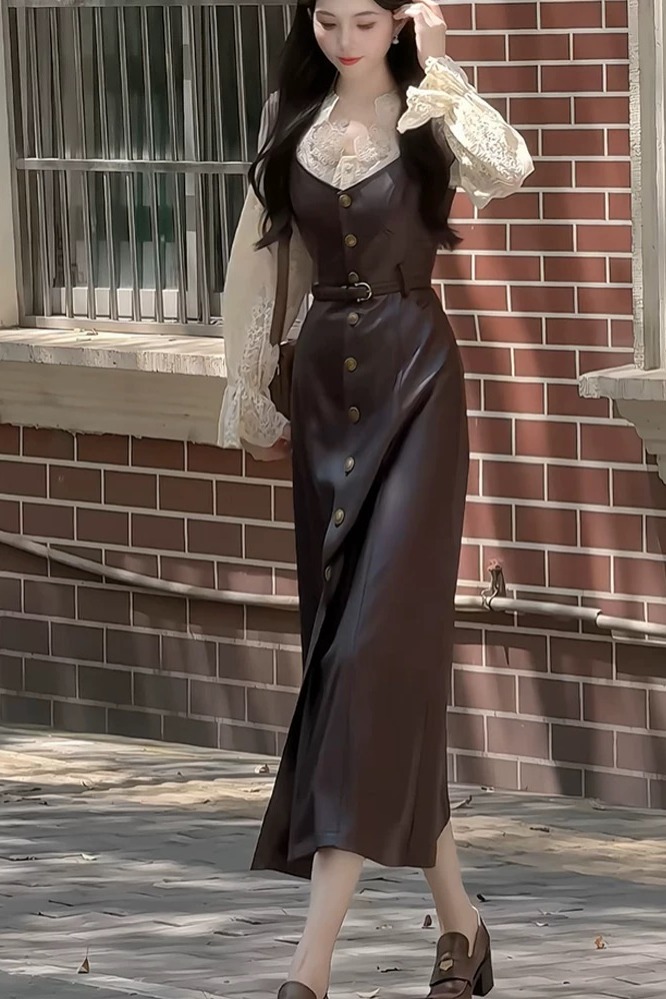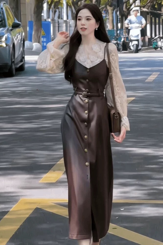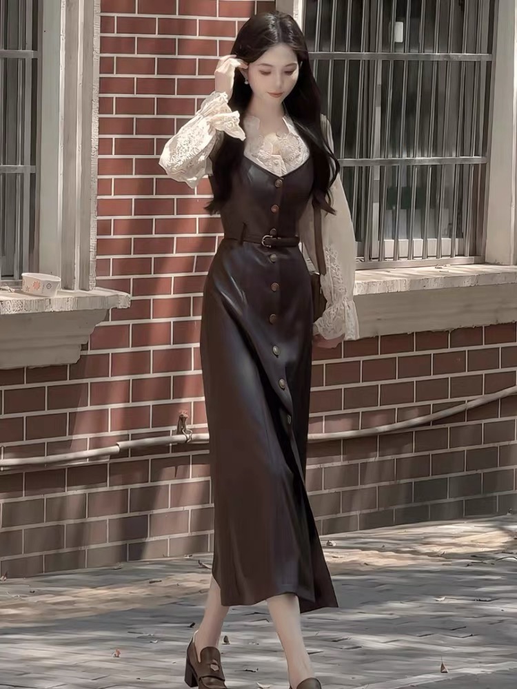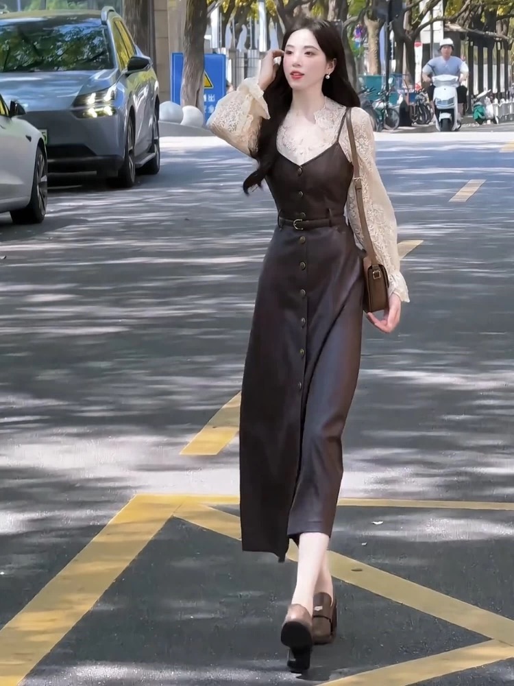 FA42766# 早秋新款气质时尚百搭优雅收腰显瘦名媛减龄吊带皮U连衣裙女 服裝批發女裝批發服飾貨源