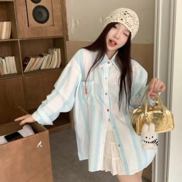 FA42769# 薄荷冰蓝质感竖条纹长袖衬衫薄外套女百搭设计感叠穿 服裝批發女裝批發服飾貨源