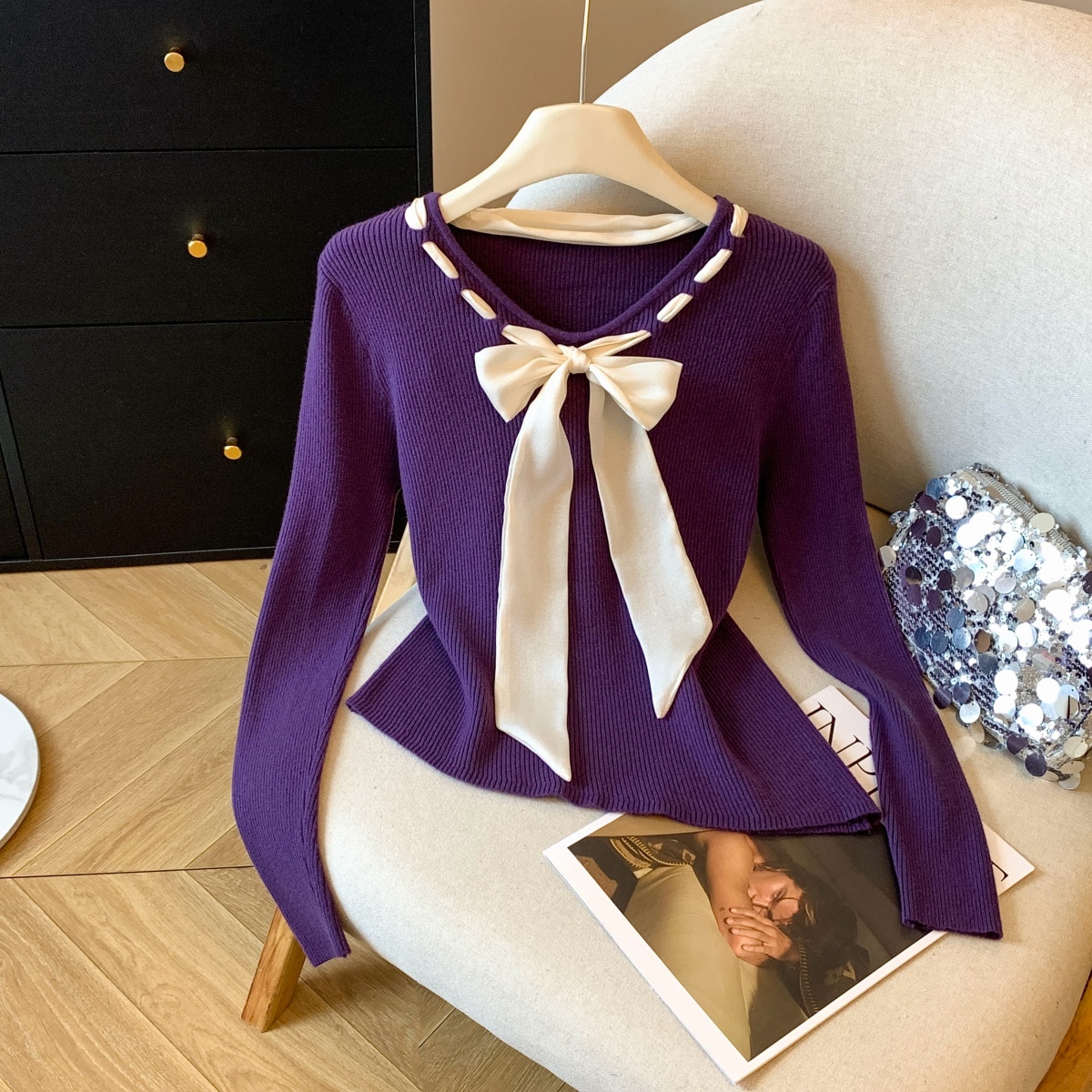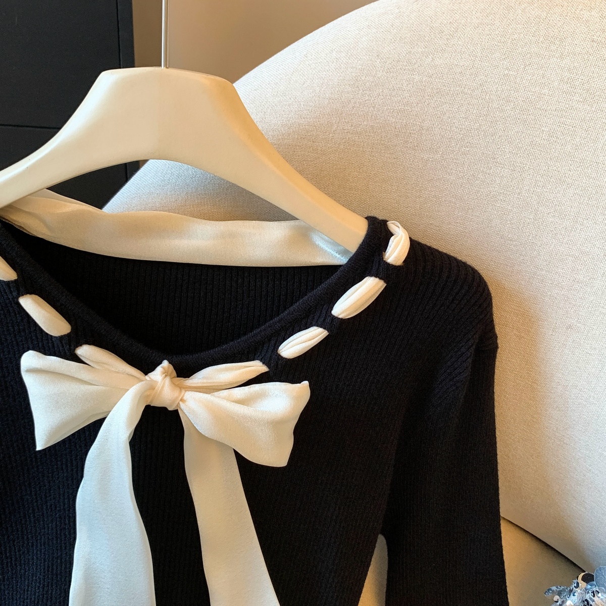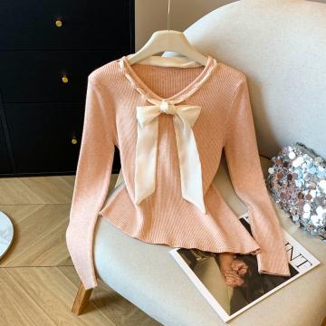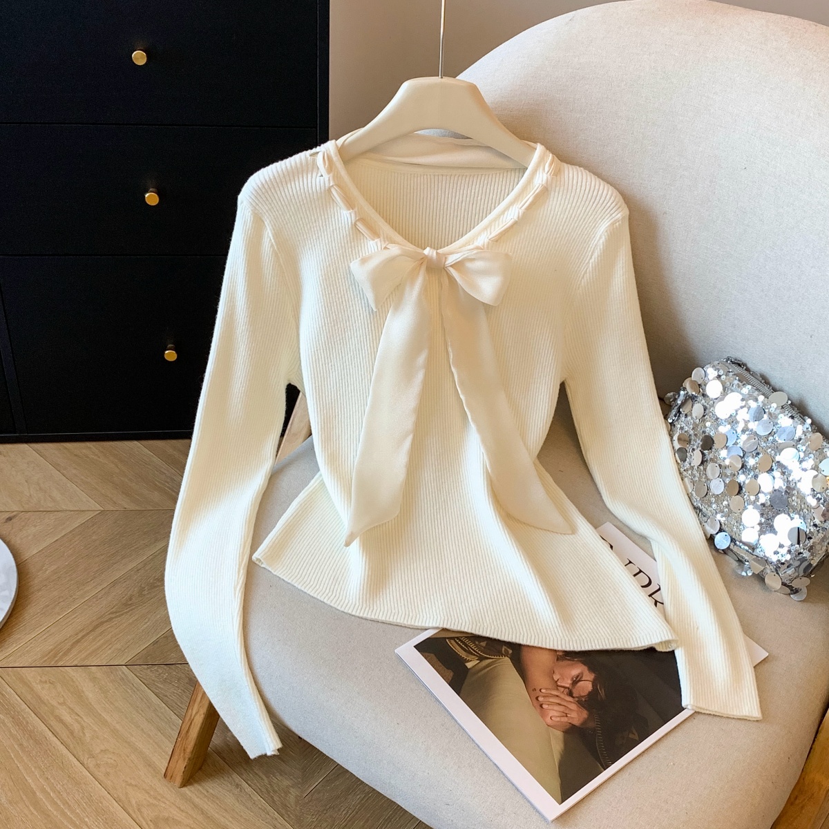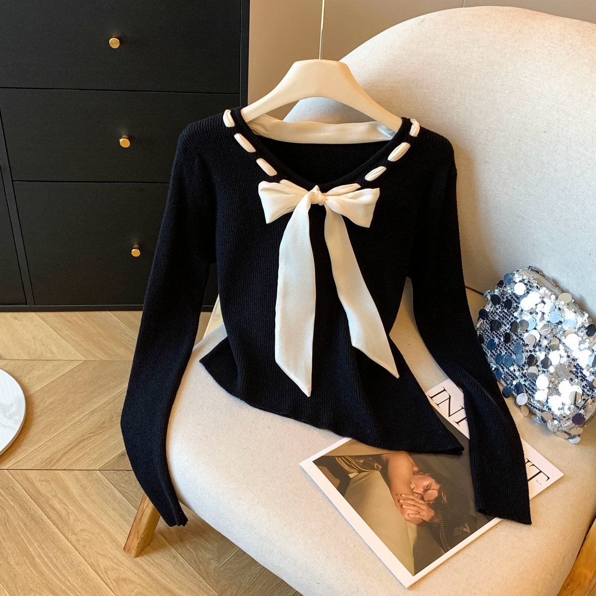 FA42779# 法式V领蝴蝶结系带长袖针织衫女秋冬内搭打底衫不规则上衣 服裝批發女裝批發服飾貨源
