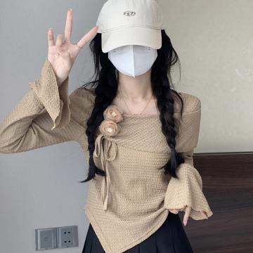 FA42783# 辣妹一字肩长袖T恤女秋内搭立体花朵小衫喇叭袖打底上衣 服裝批發女裝批發服飾貨源