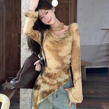 FA42784# 早秋扎染斜肩长袖T恤女小众外穿辣妹风不规则气质上衣 服裝批發女裝批發服飾貨源