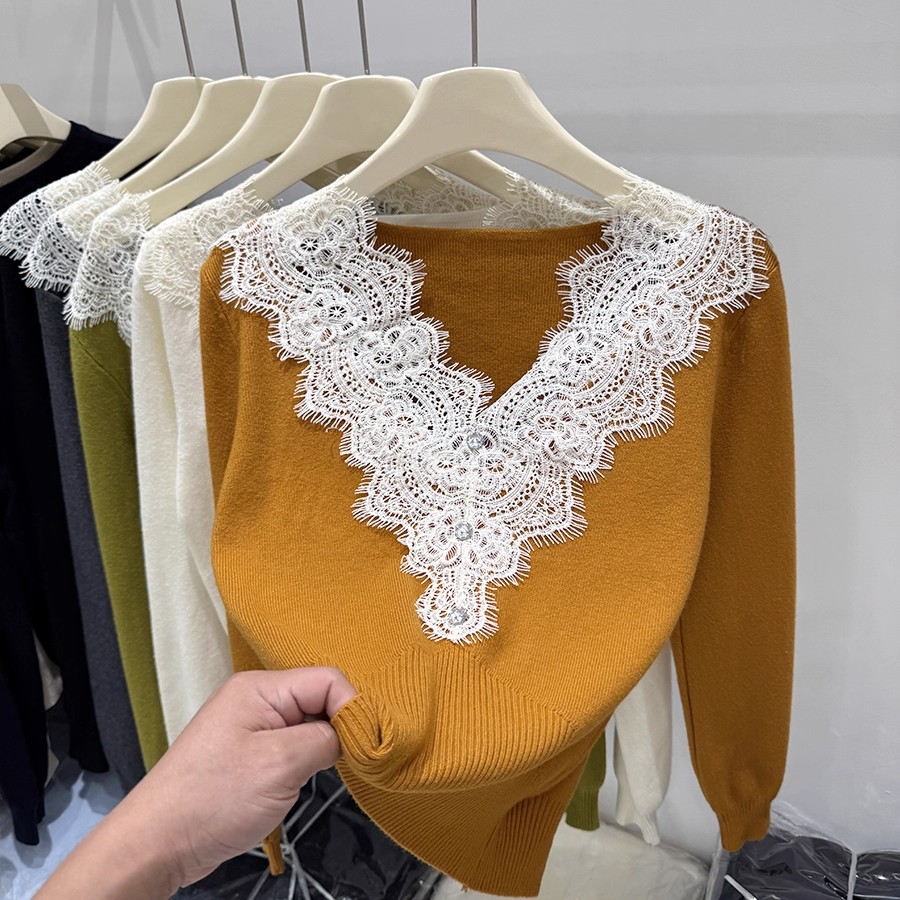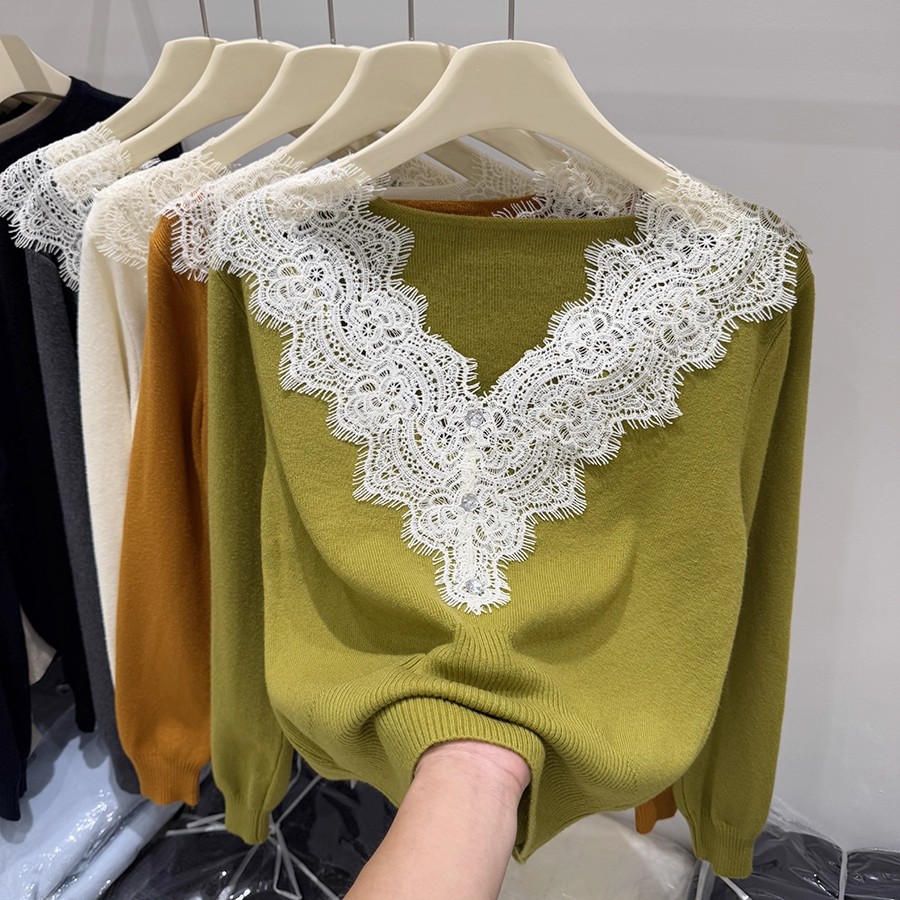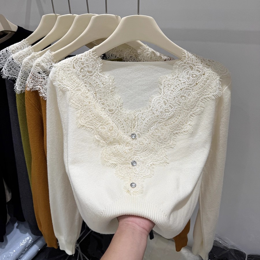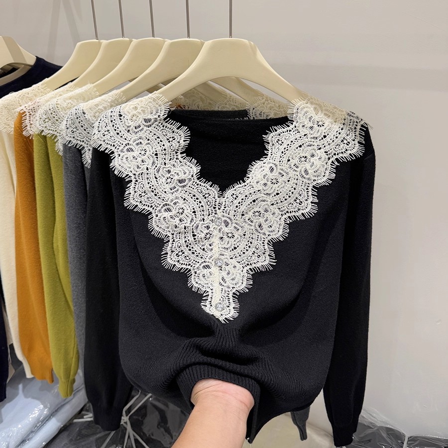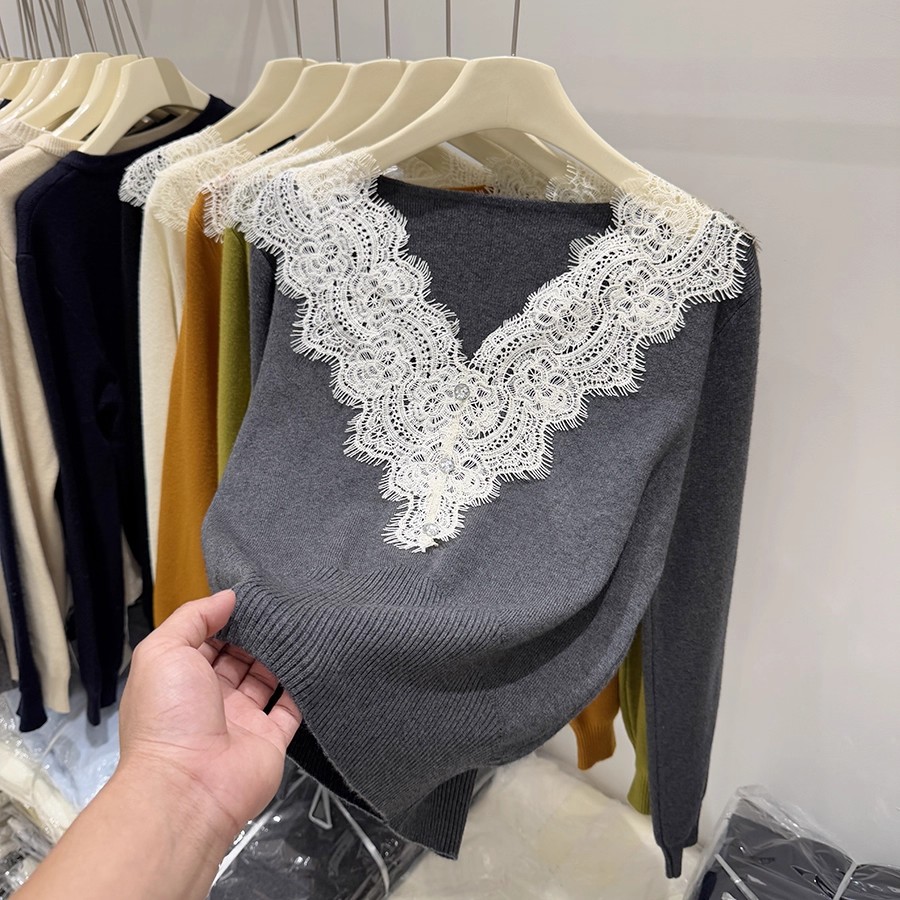 FA42786# 四季青秋季新款纯欲风蕾丝拼接长袖针织衫女洋气显瘦软糯毛衣 服裝批發女裝批發服飾貨源