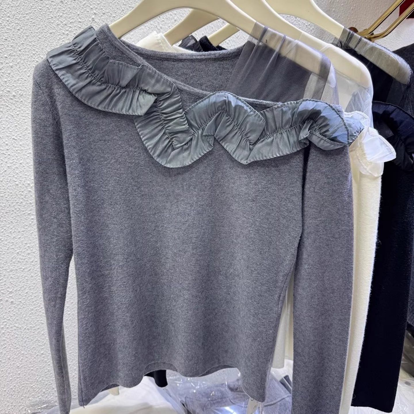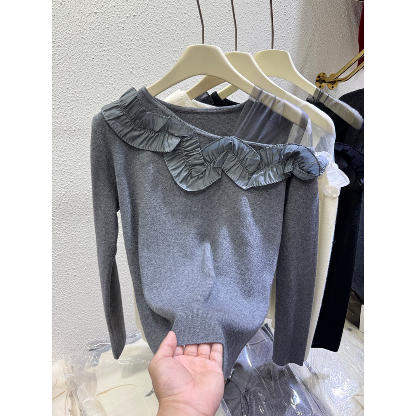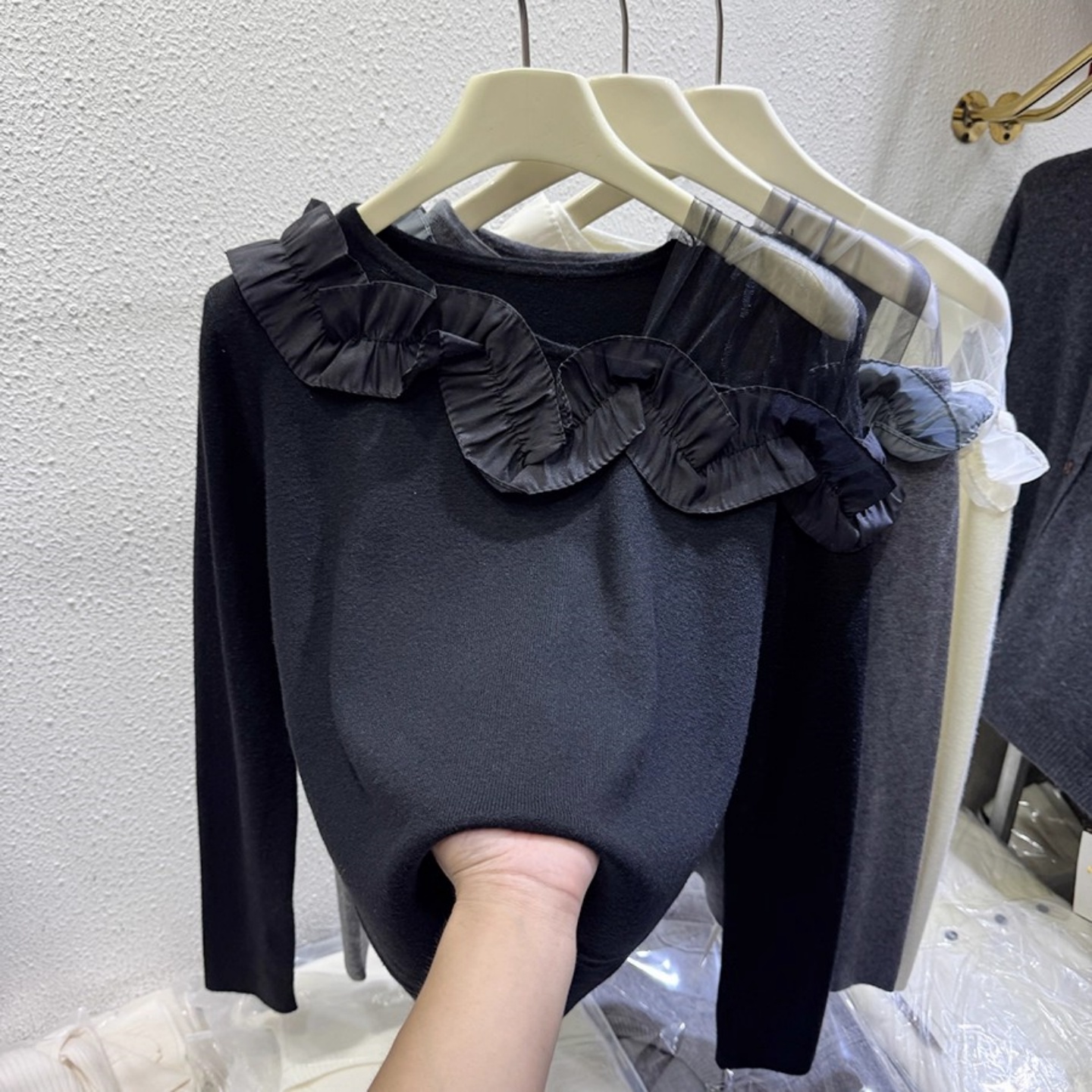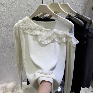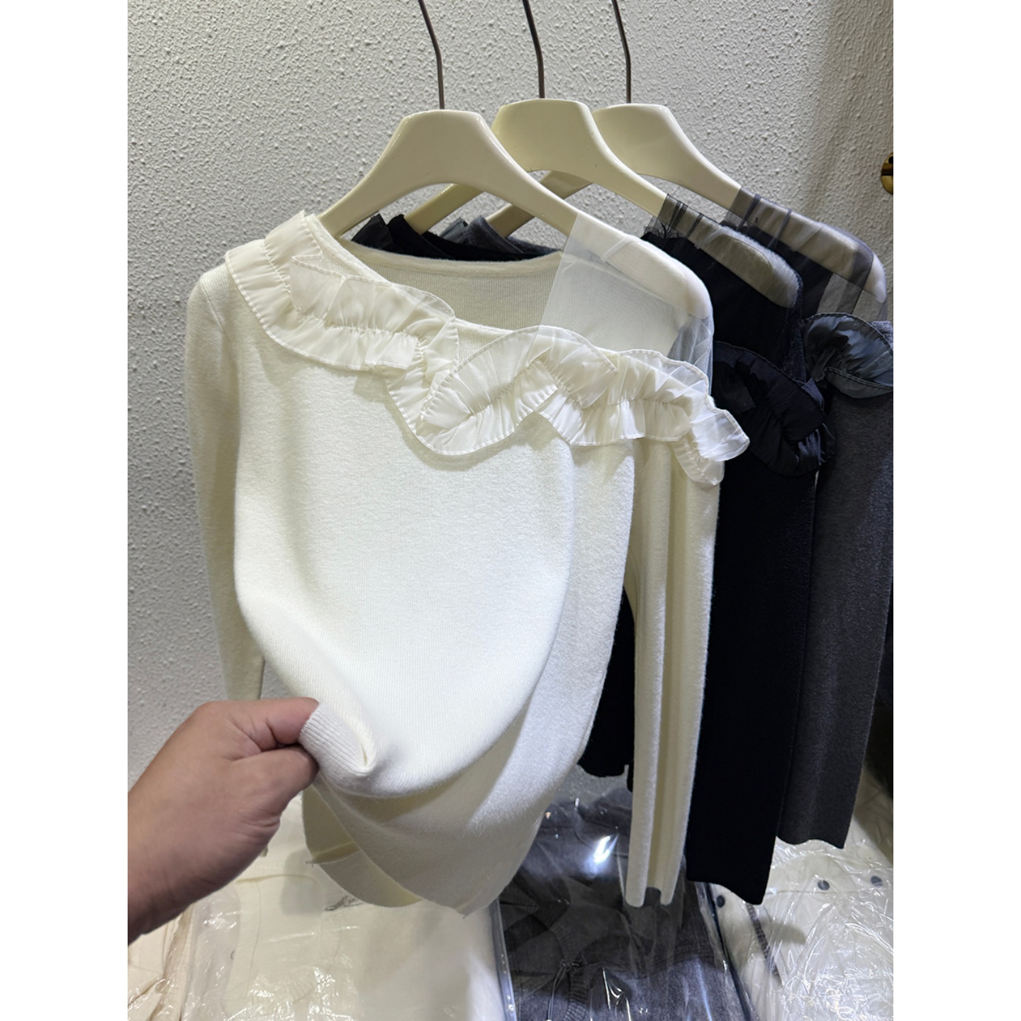 FA42787# 四季青秋季新款设计感花边拼接针织衫女长袖洋气别致气质上衣 服裝批發女裝批發服飾貨源