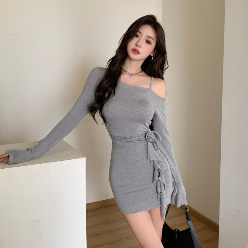 FA42799# 露肩设计感连衣裙女秋冬季高腰复古喇叭袖简约气质修身短裙 服裝批發女裝批發服飾貨源