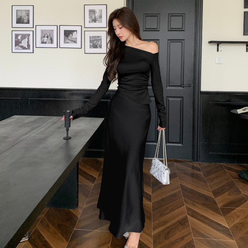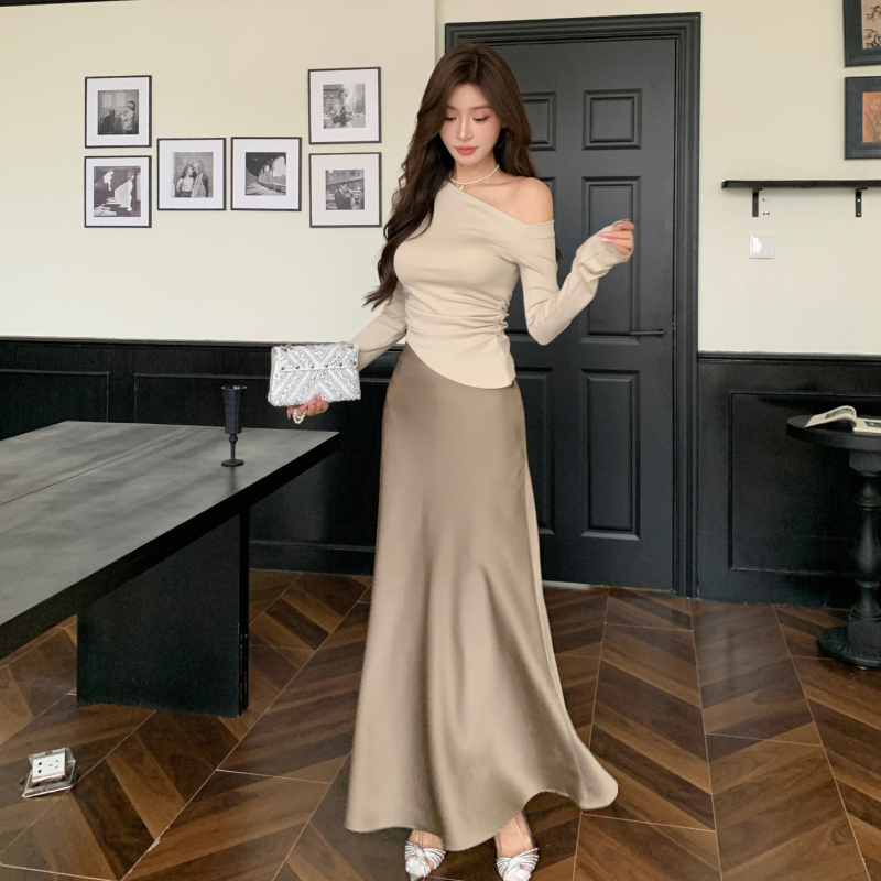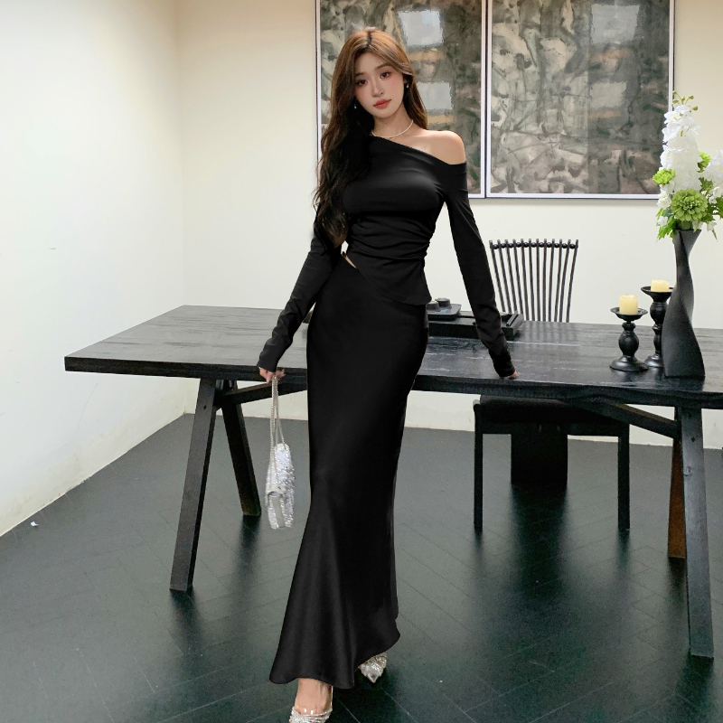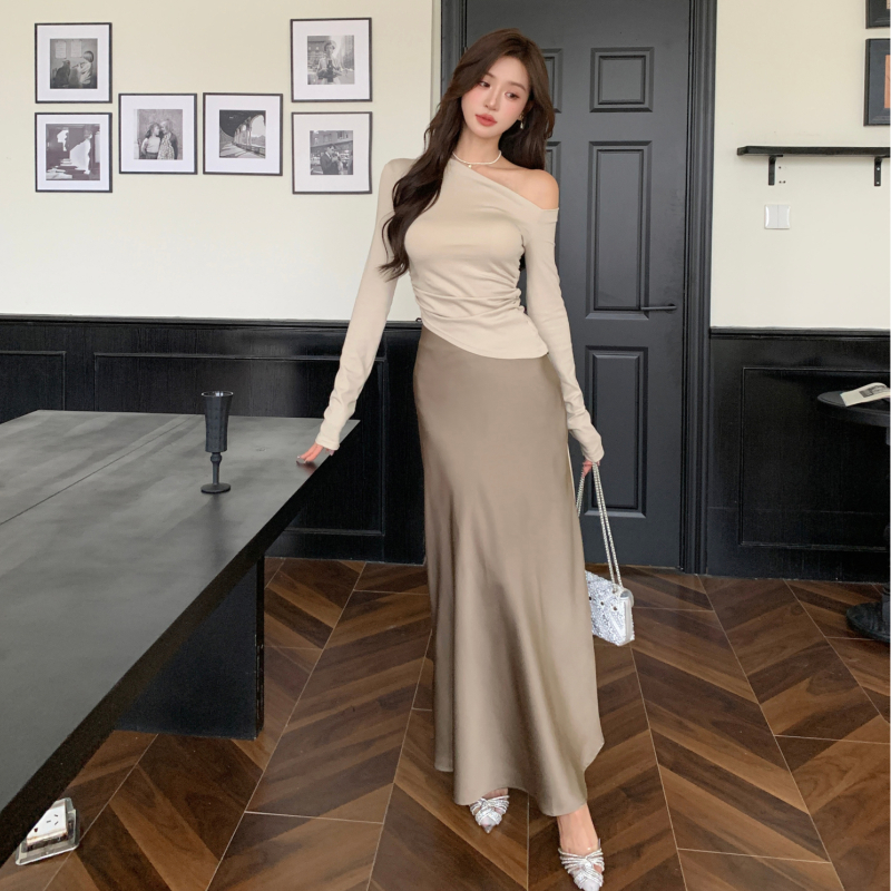 Home > 韩版套装 > FA42800# 纯欲斜肩设计抽褶收腰上衣女高级感醋酸A字裙半身裙套装 服裝批發女裝批發服飾貨源