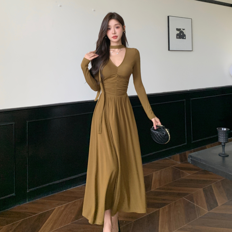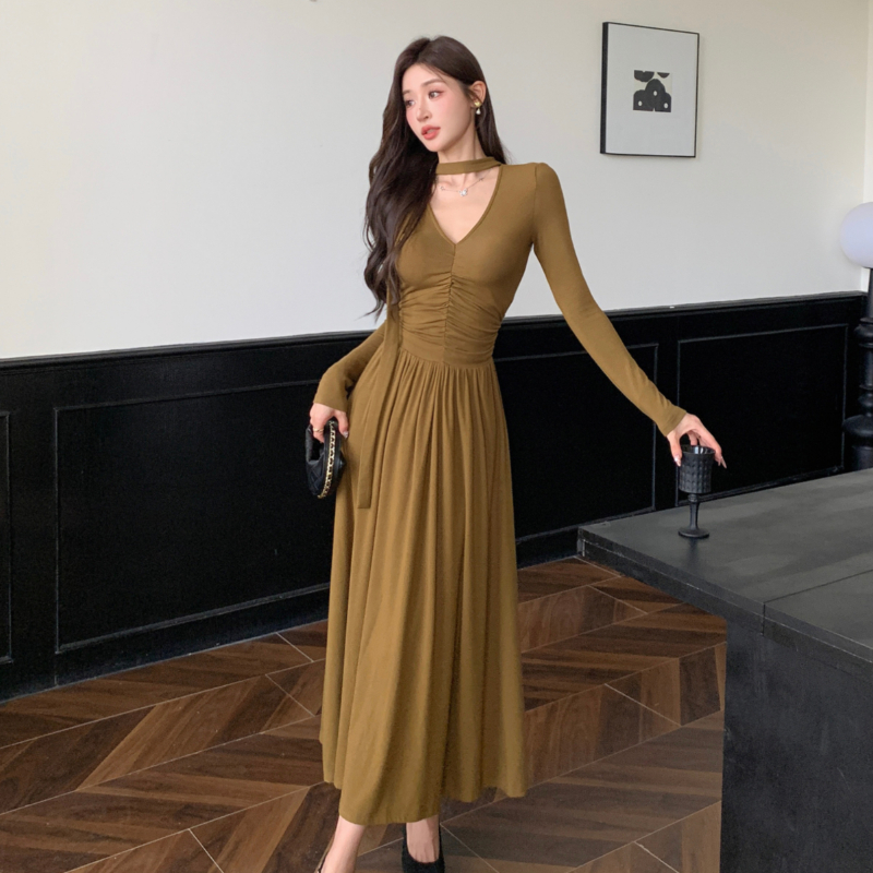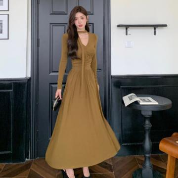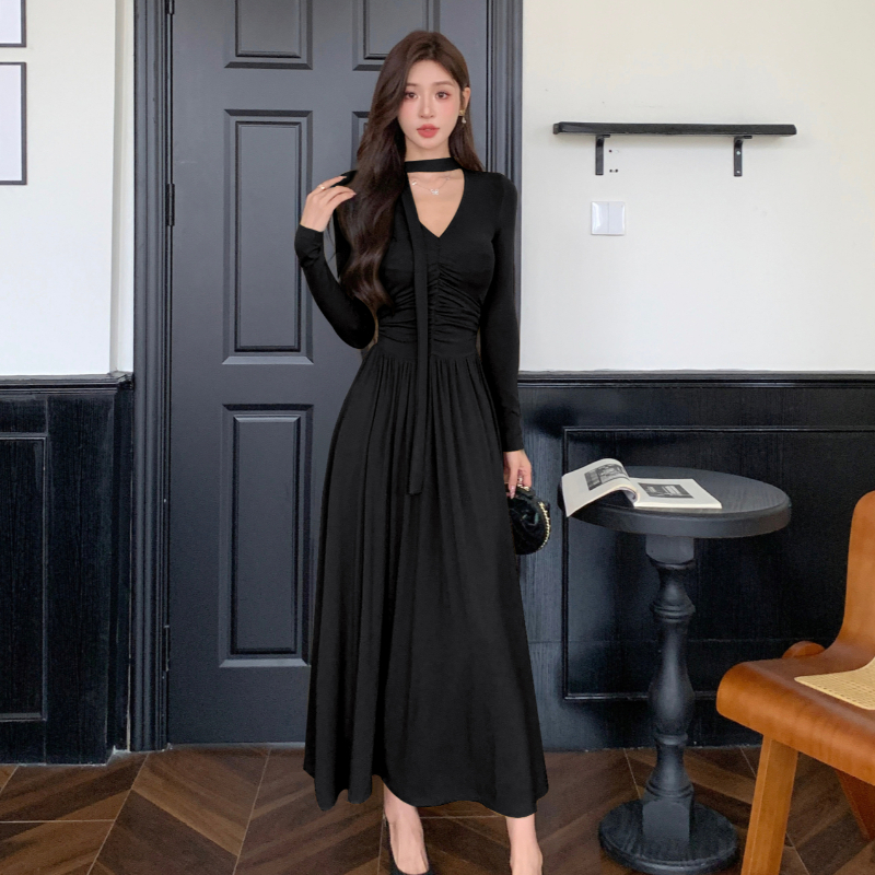 FA42801# 小众设计感褶皱飘带连衣裙女蠢秋冬季修身显瘦a字针织长裙 服裝批發女裝批發服飾貨源