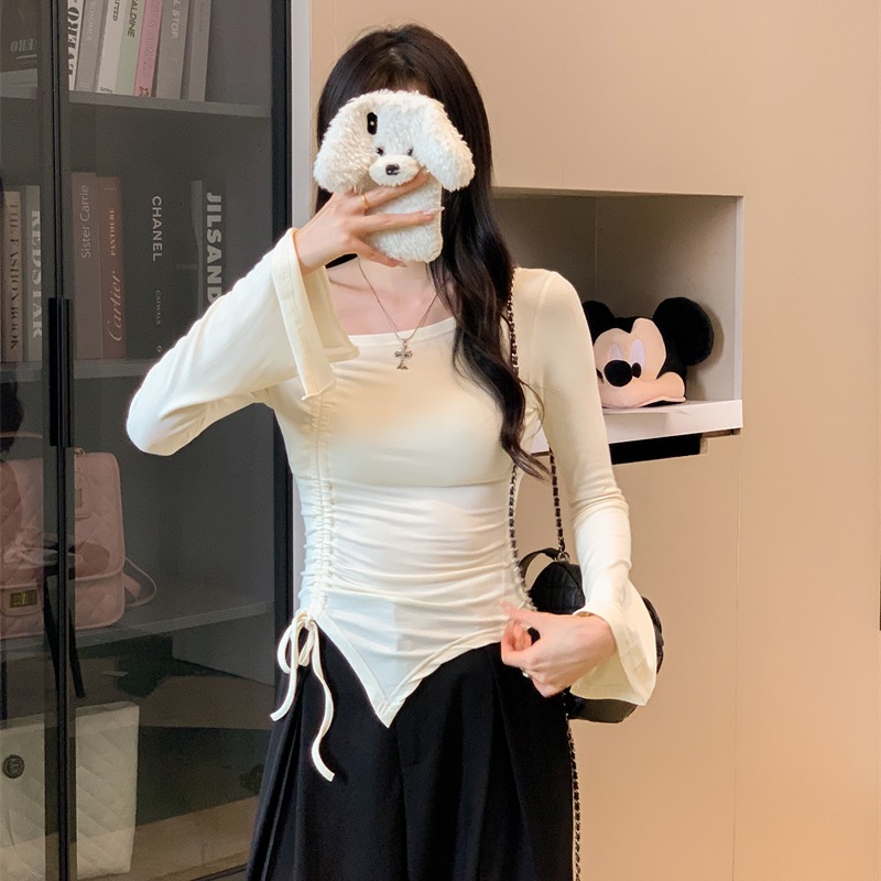 FA42847# 辣妹露肩短袖t恤设计感抽绳不规则上衣喇叭袖 服裝批發女裝批發服飾貨源