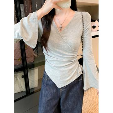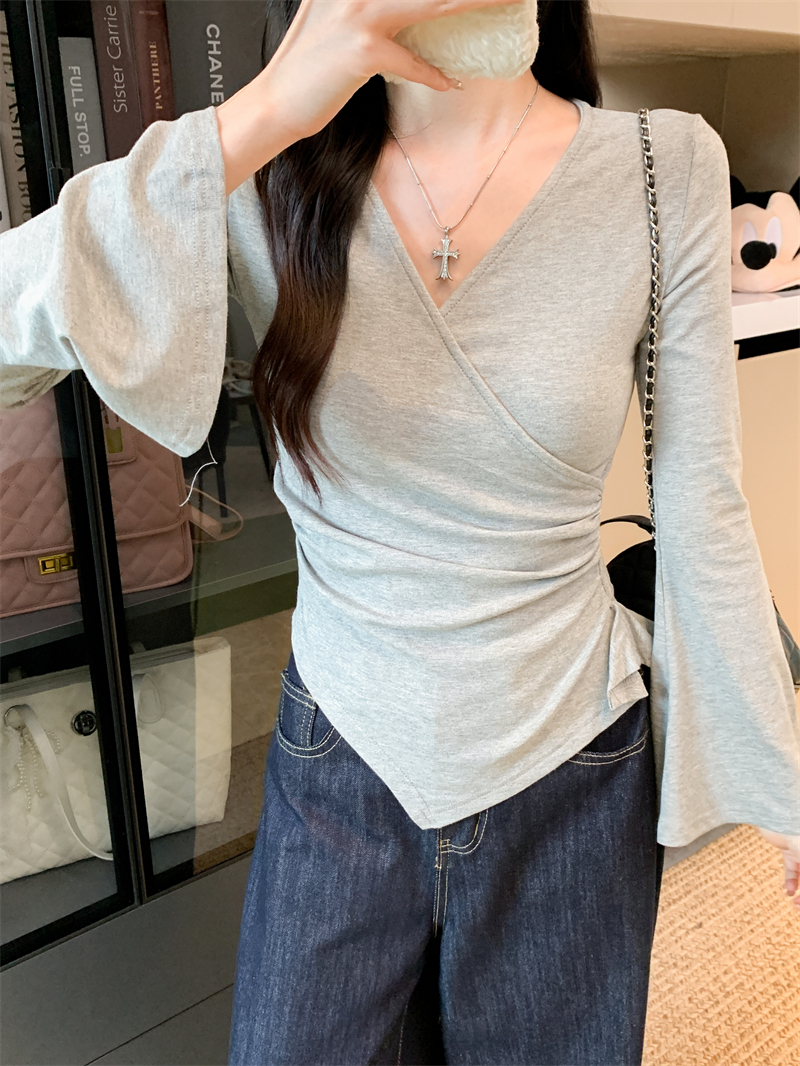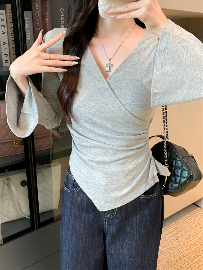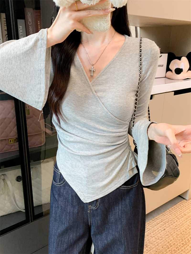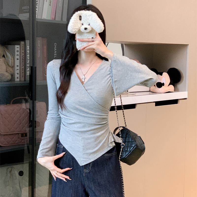 FA42852# v领短款显瘦长袖t恤性感辣妹打底衫收腰修身 服裝批發女裝批發服飾貨源