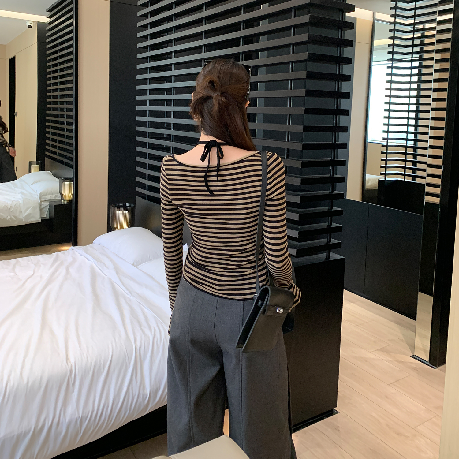 图设计感蕾丝边挂脖条纹长袖T恤女秋新款高级不撞衫上衣 服裝批發女裝批發服飾貨源