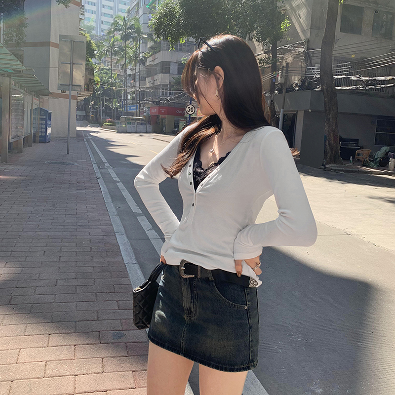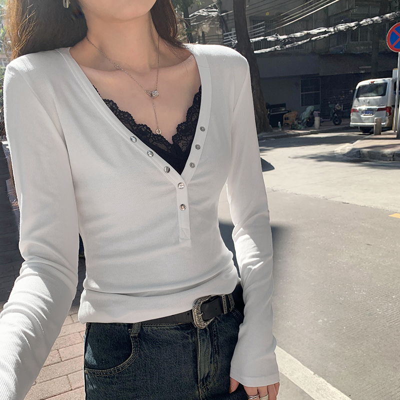 图蕾丝拼接V领内搭修身打底衫女秋冬新款辣妹可外穿长袖T恤 服裝批發女裝批發服飾貨源