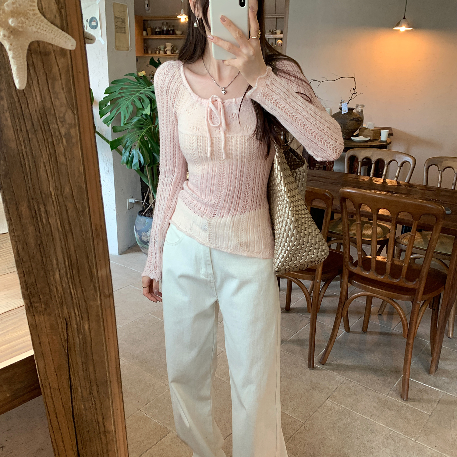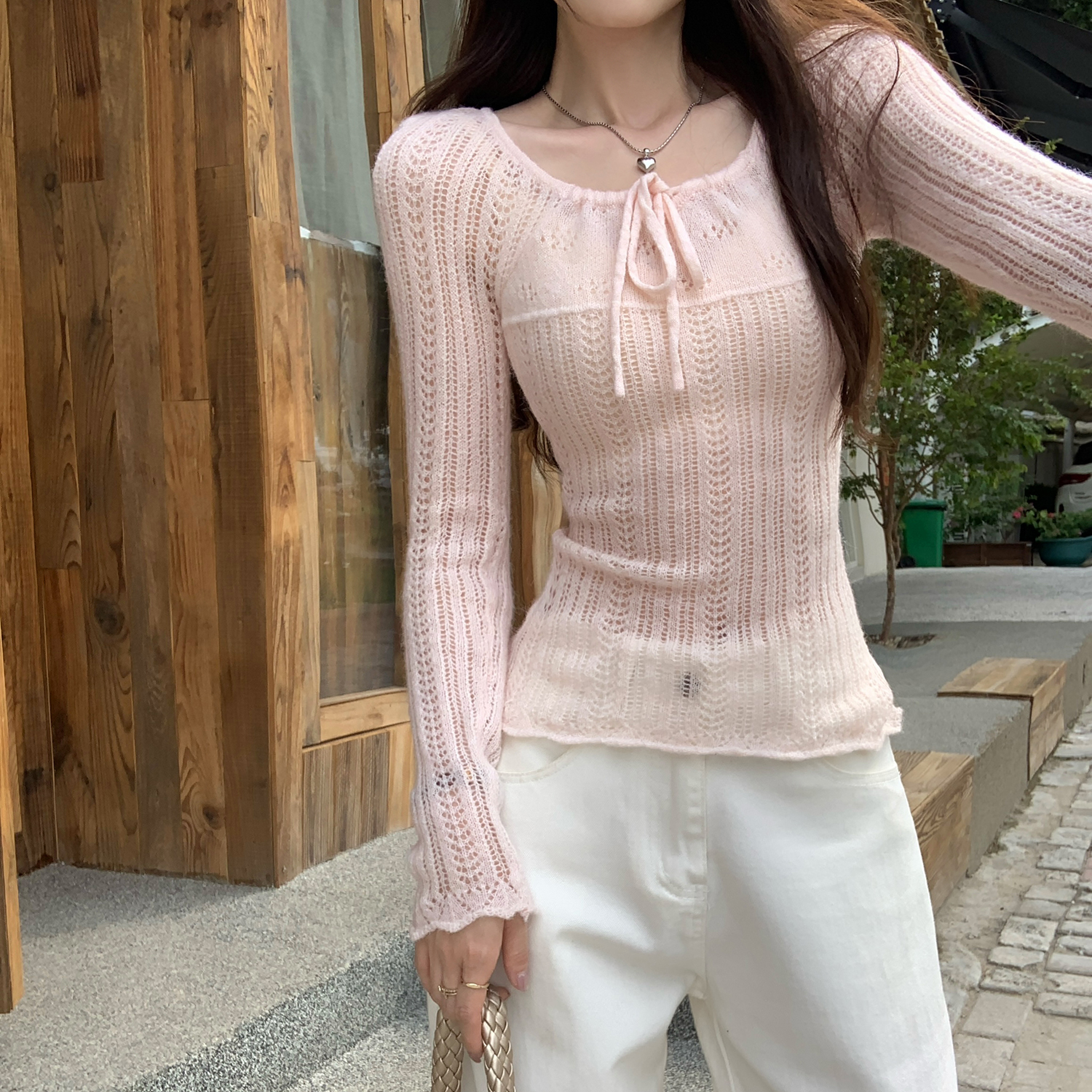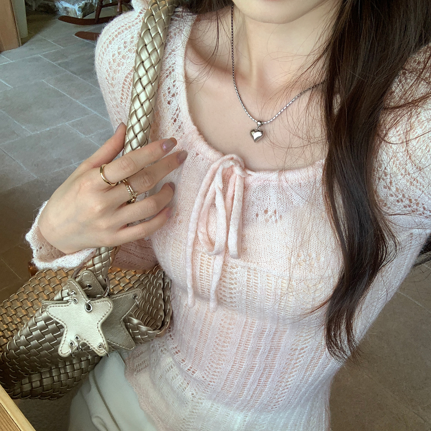 图粉色镂空系带长袖羊毛针织衫女新款独特质感初秋上衣 服裝批發女裝批發服飾貨源