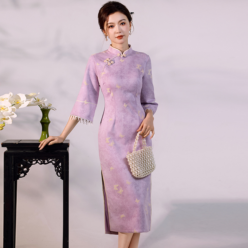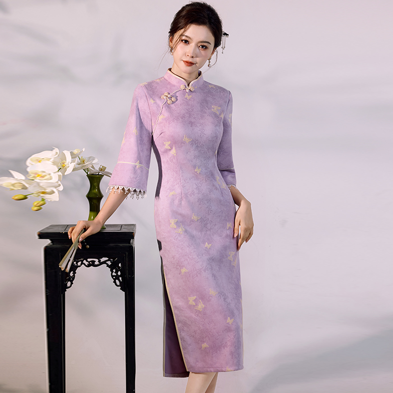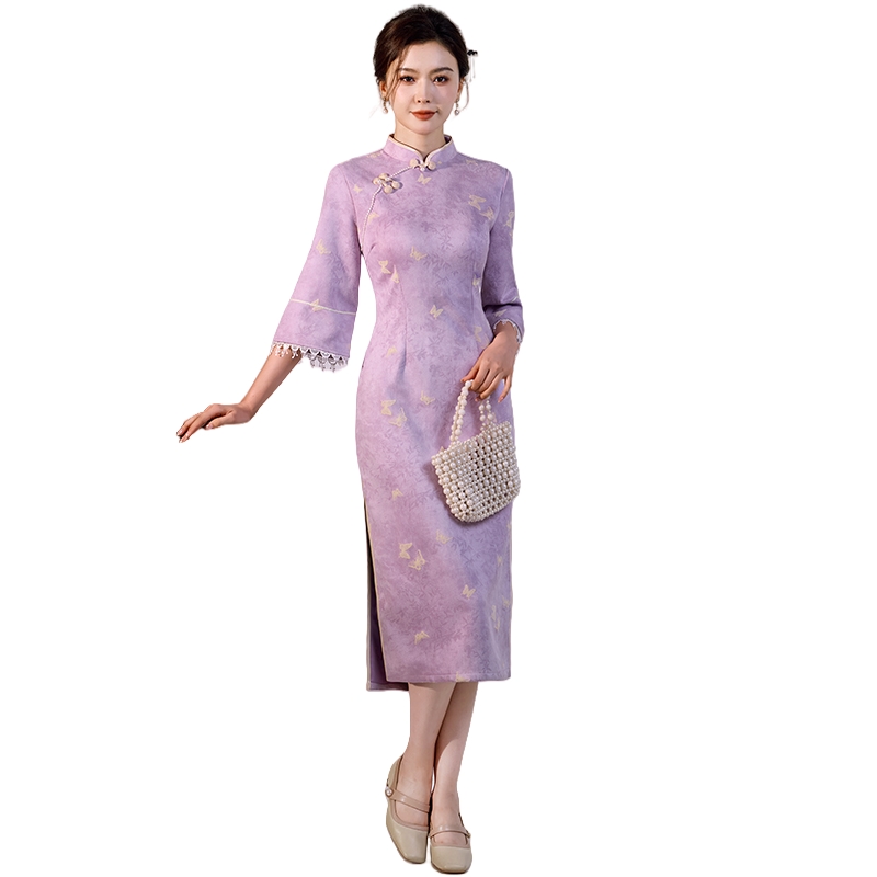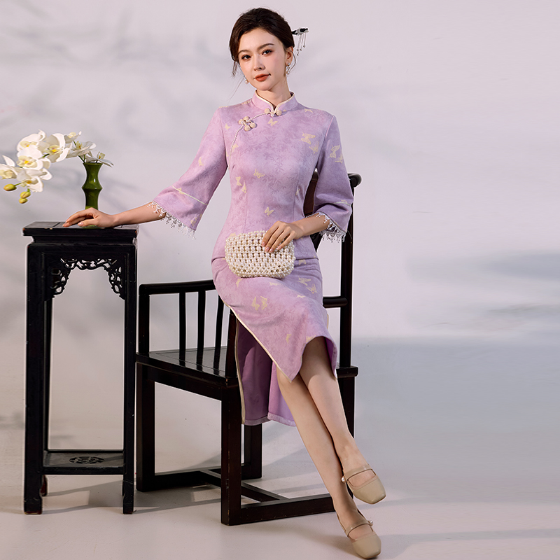 国风复古新中式改良七分袖华贵气质高端显瘦开叉旗袍麂皮绒连衣裙 服裝批發女裝批發服飾貨源