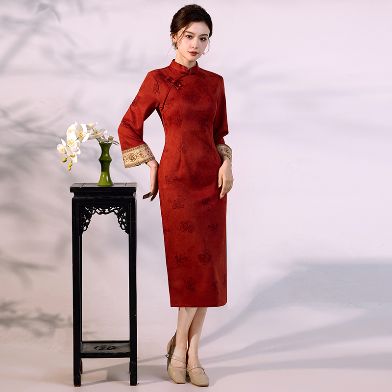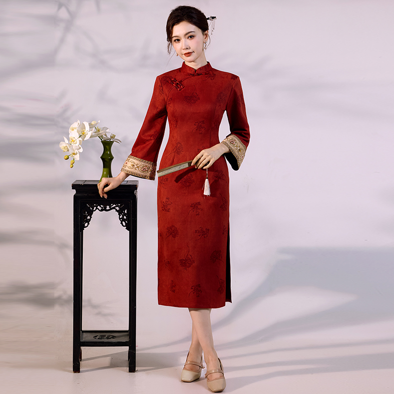 国风新中式年轻款改良倒大袖改良旗袍华贵气质麂皮绒绝美连衣裙 服裝批發女裝批發服飾貨源