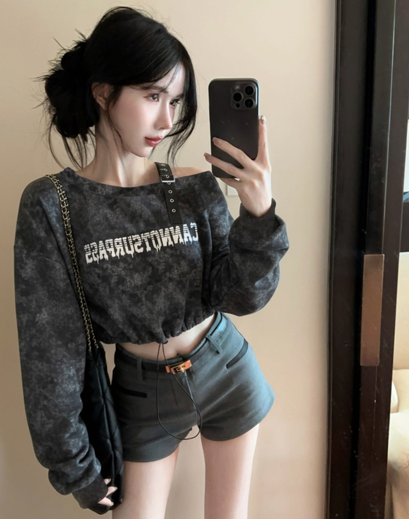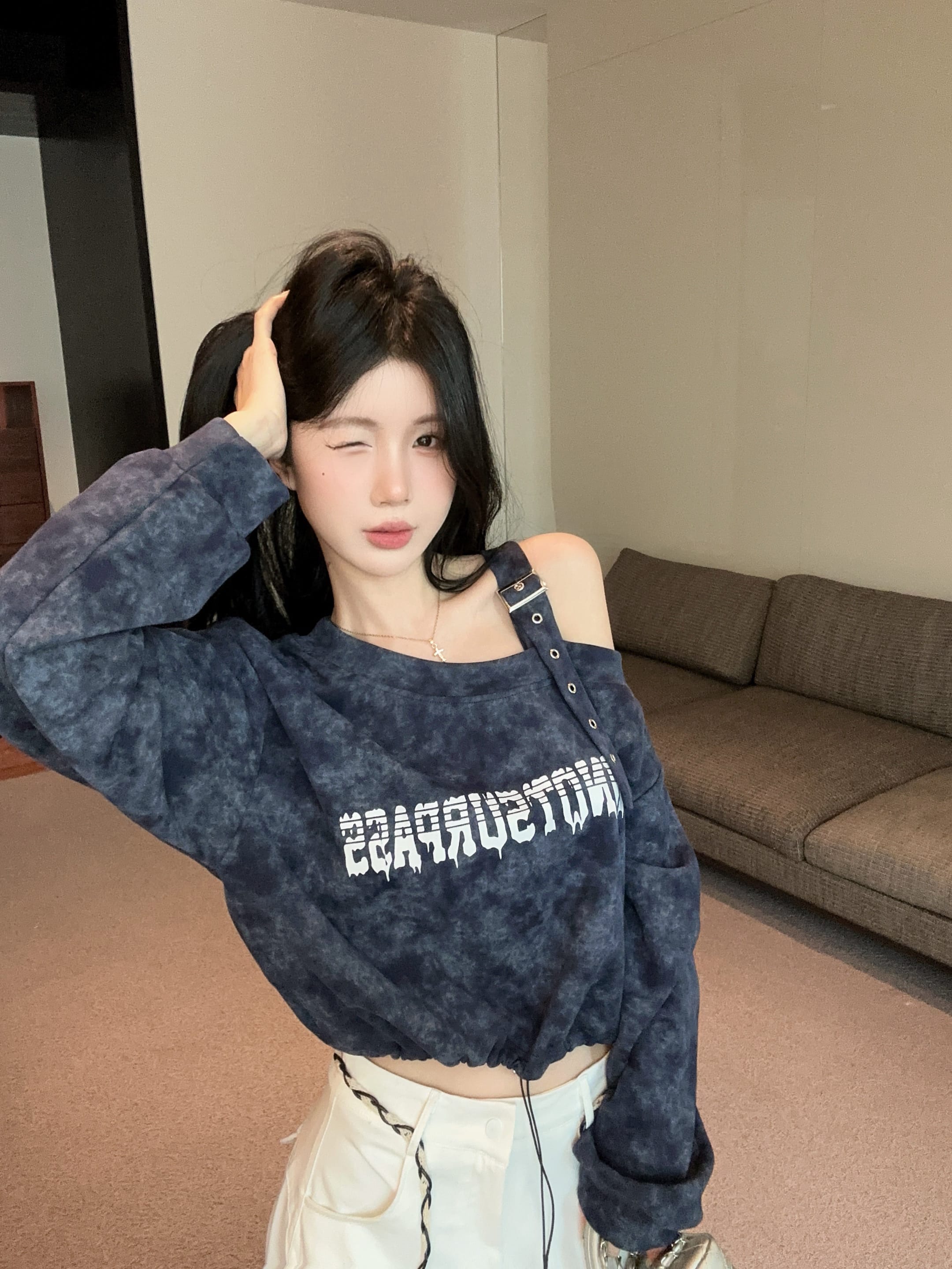 露肩长袖卫衣抽绳松紧收腰设计感小众宽松短款上衣外套 服裝批發女裝批發服飾貨源