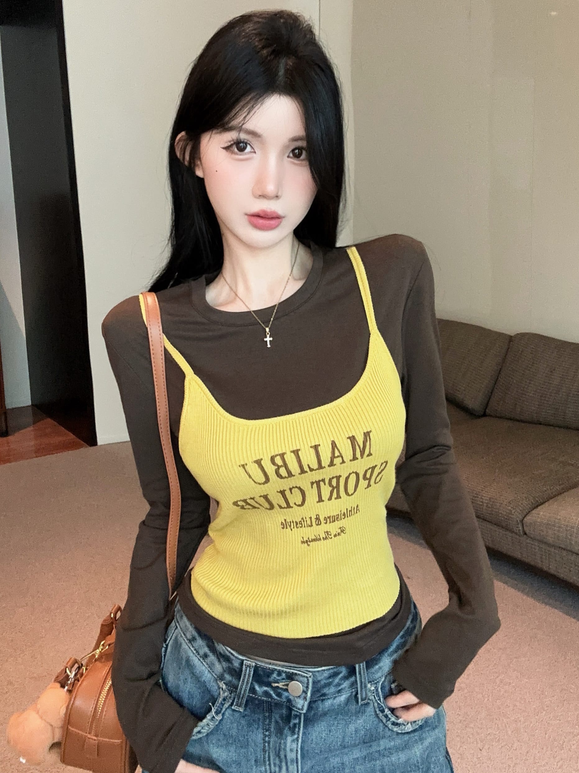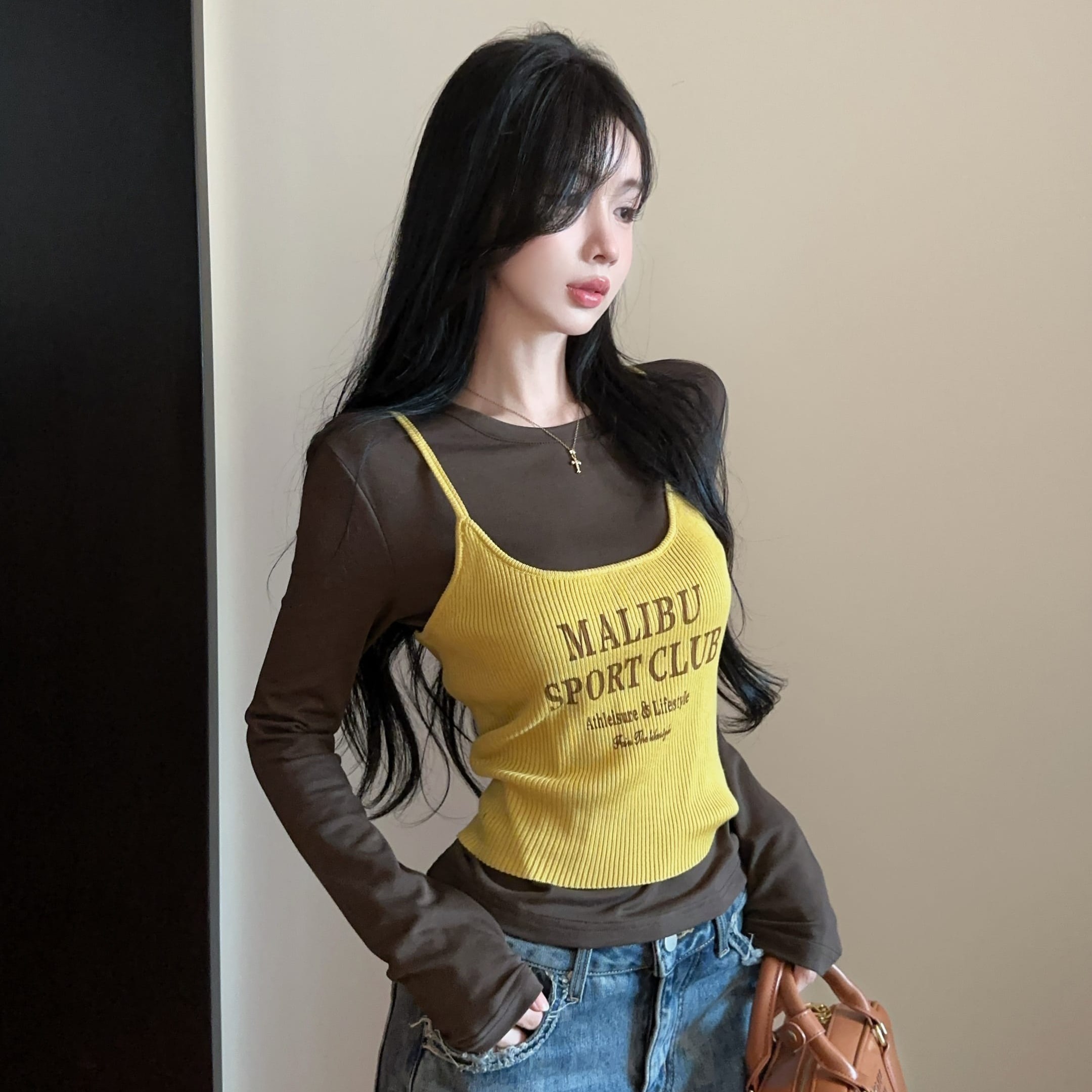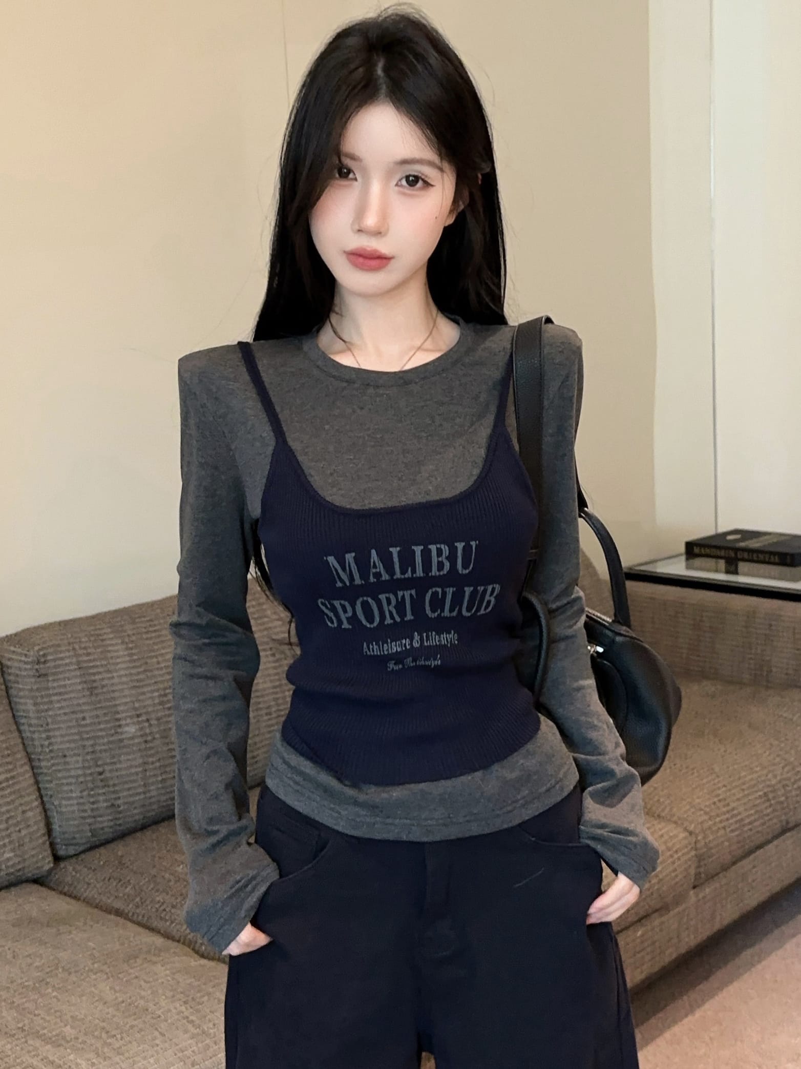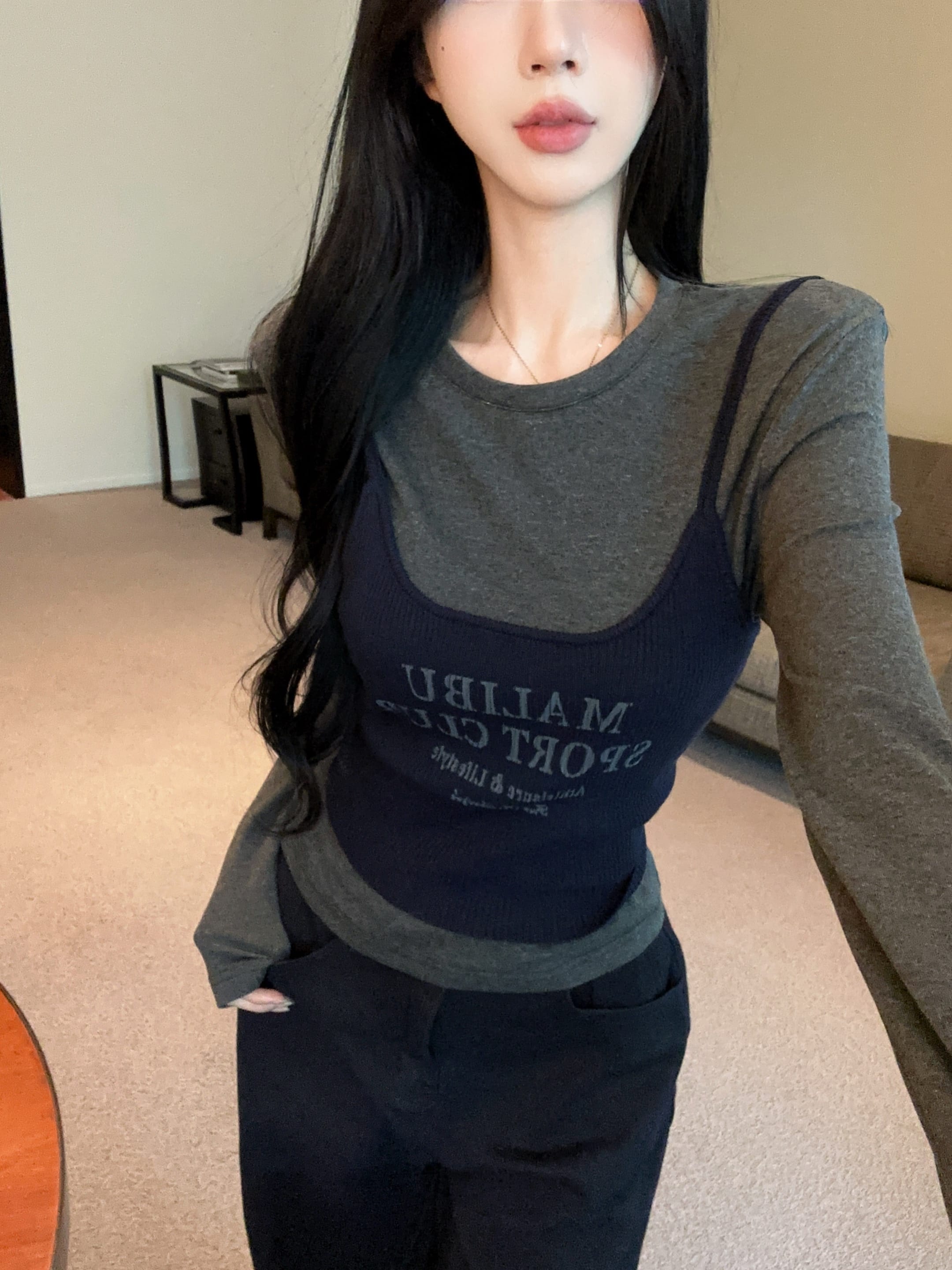 辣妹纯色长袖T恤显瘦打底衫字母印花吊带背心两件套装 服裝批發女裝批發服飾貨源