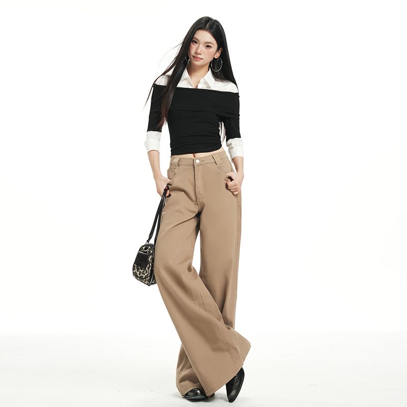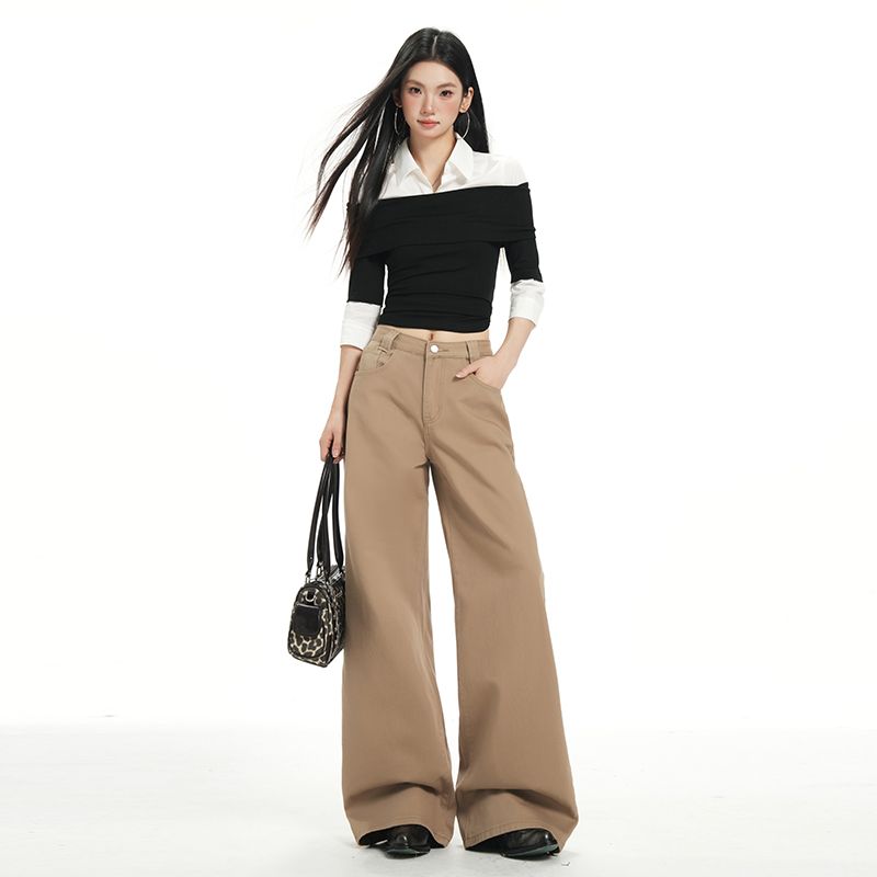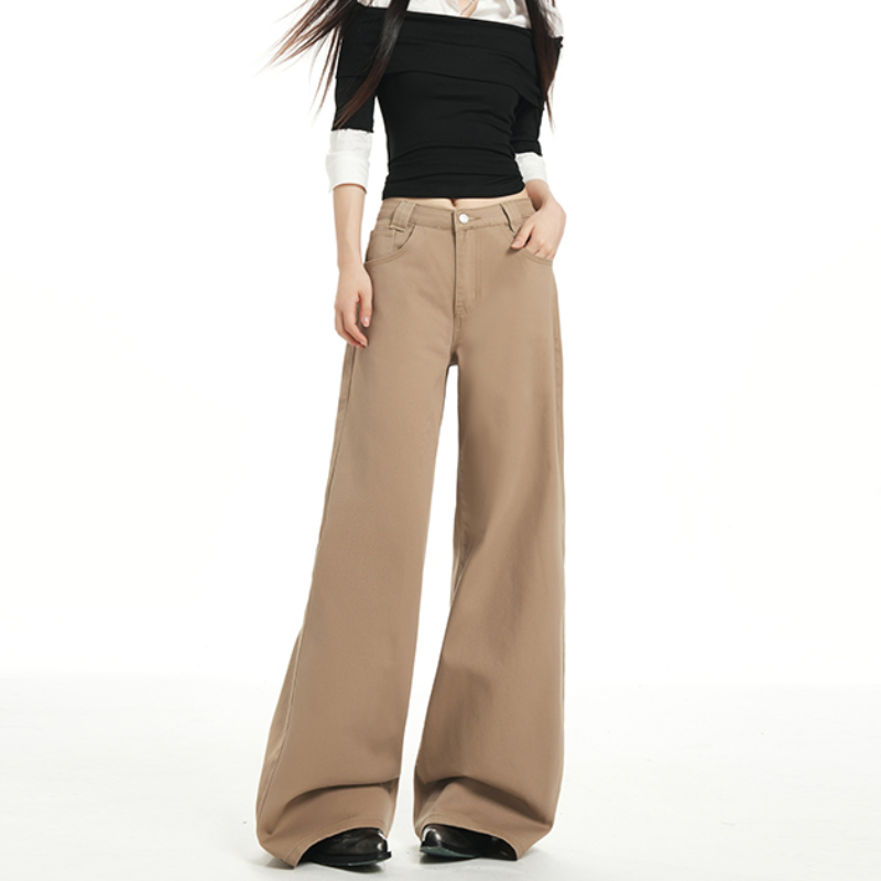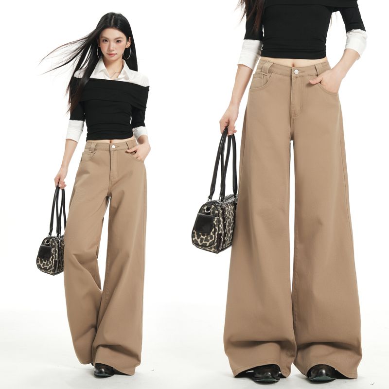 美式复古拿铁棕宽松阔腿百搭显瘦秋冬新款拖地牛仔裤子女 服裝批發女裝批發服飾貨源