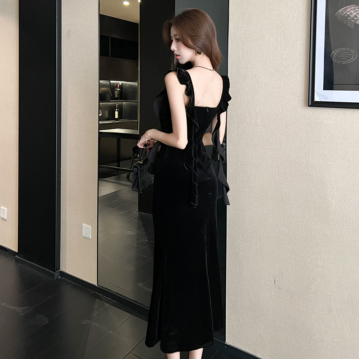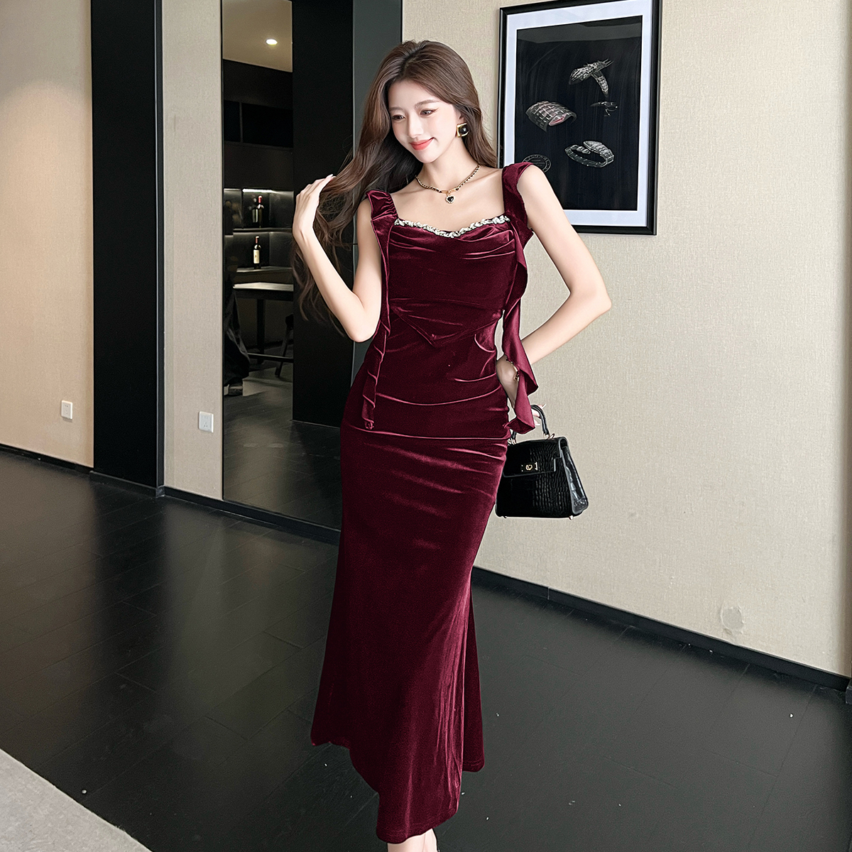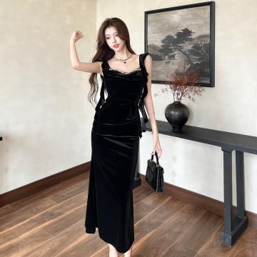 气质丝绒吊带裙秋冬新款钻链装饰显瘦连衣裙 服裝批發女裝批發服飾貨源