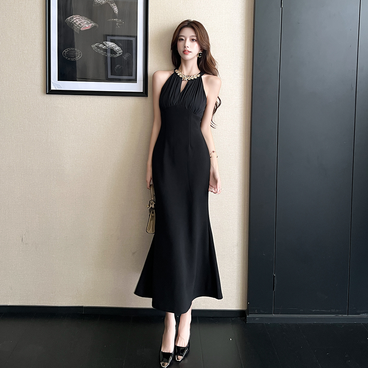 FA42901# 现现高级感名媛钻链挂脖镂空连衣裙修身长款鱼尾裙 服裝批發女裝批發服飾貨源