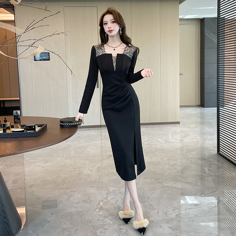 视频秋冬季撞色开叉长裙包臀连衣裙 服裝批發女裝批發服飾貨源